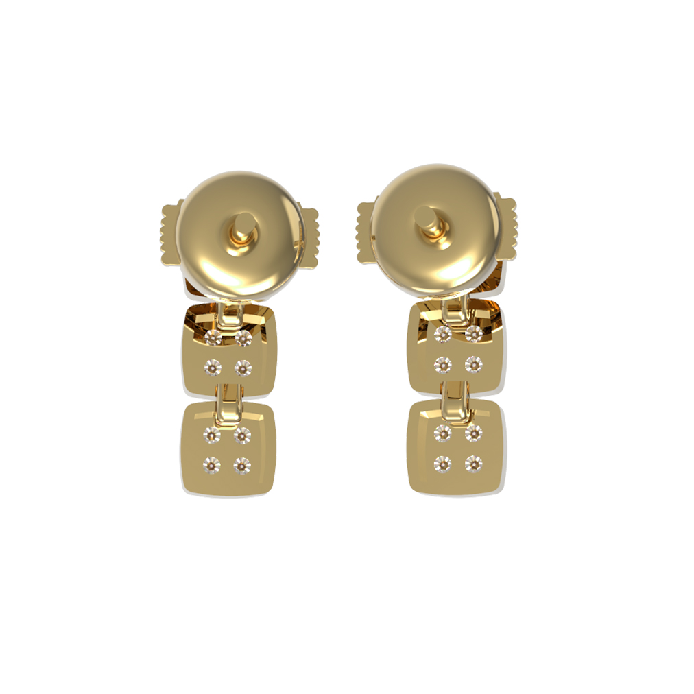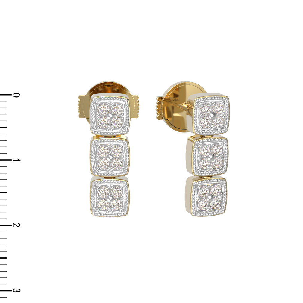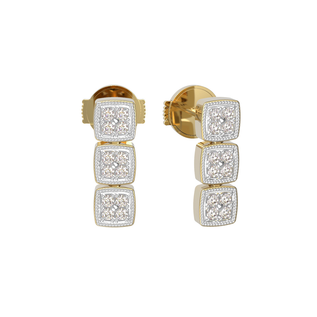 Дизайн украшения впечатляет своей геометрической выверенностью: три квадратных модуля, инкрустированных сияющими камнями, создают динамичную и современную композицию. Декор включает 24 безупречных бриллианта круглой огранки, которые притягивают взгляд своим чистым белым цветом и завораживающей игрой света. Сочетание лимонного металла и искрящихся вставок придает образу глубину и выразительность.