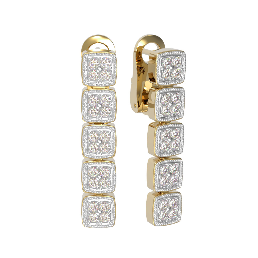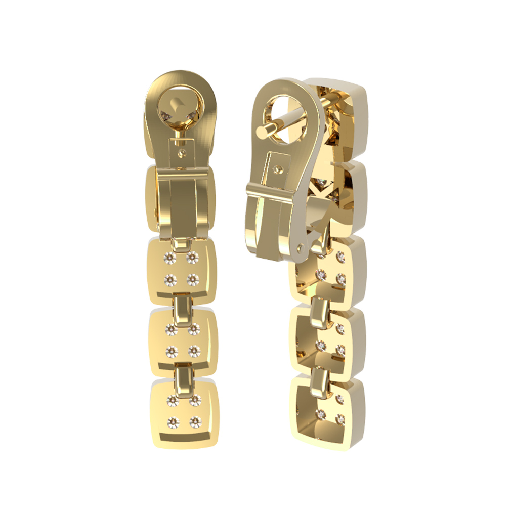 Дизайн модели представляет собой элегантную вертикальную композицию из квадратных звеньев, каждое из которых инкрустировано сверкающими бриллиантами. Всего в изделии использовано 40 вставок круглой огранки, которые создают завораживающую игру света при каждом вашем движении. Белый цвет вставок идеально дополняет лимонный оттенок металла, придавая украшению завершенный и аристократичный вид.