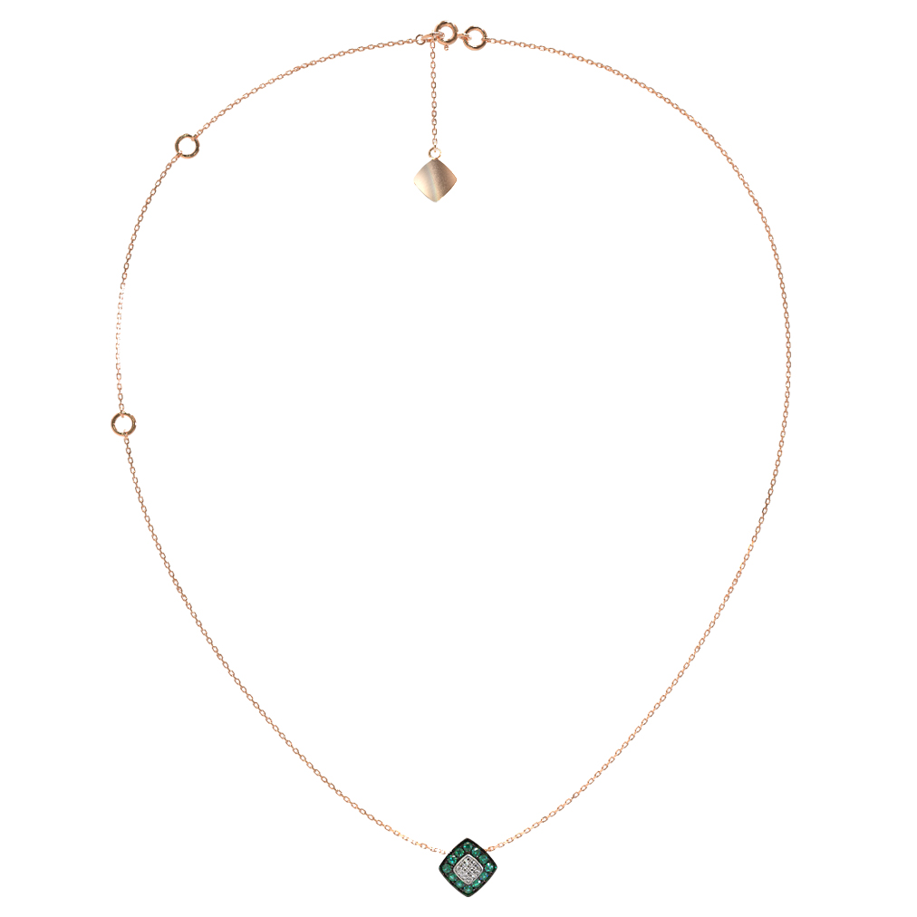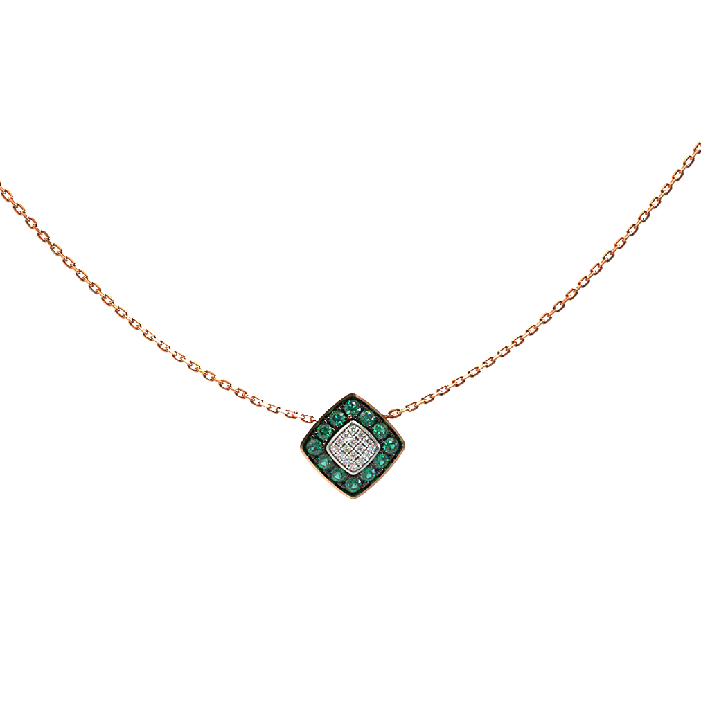 В центре композиции расположены сияющие бриллианты белого цвета, которые создают роскошный акцент и притягивают взгляды. Их холодный блеск эффектно дополняют изумруды насыщенного зелёного цвета, создавая выразительный контраст. Все вставки имеют классическую круглую форму, что позволяет свету максимально раскрыть их глубину и чистоту. Красное золото тёплого оттенка служит идеальной оправой для этого ансамбля, придавая изделию особую выразительность.