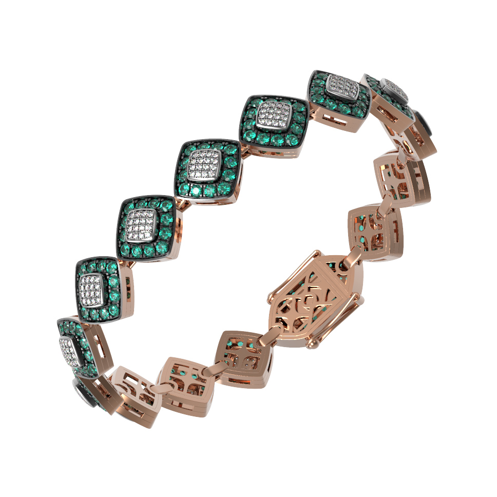 Центральным элементом композиции стали 1389 вставок, тщательно отобранных мастерами. Изысканное сочетание бриллиантов белого цвета и изумрудов насыщенного зелёного оттенка создает притягательный контраст. Круглая форма вставок придает украшению мягкость и динамику, позволяя свету максимально эффектно преломляться при каждом движении. Особая геометрия звеньев делает этот браслет не только украшением, но и настоящим произведением ювелирного искусства.