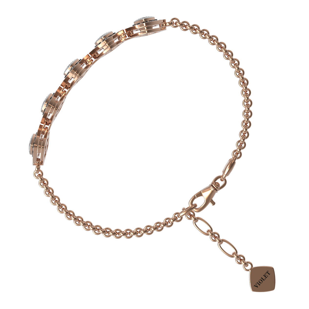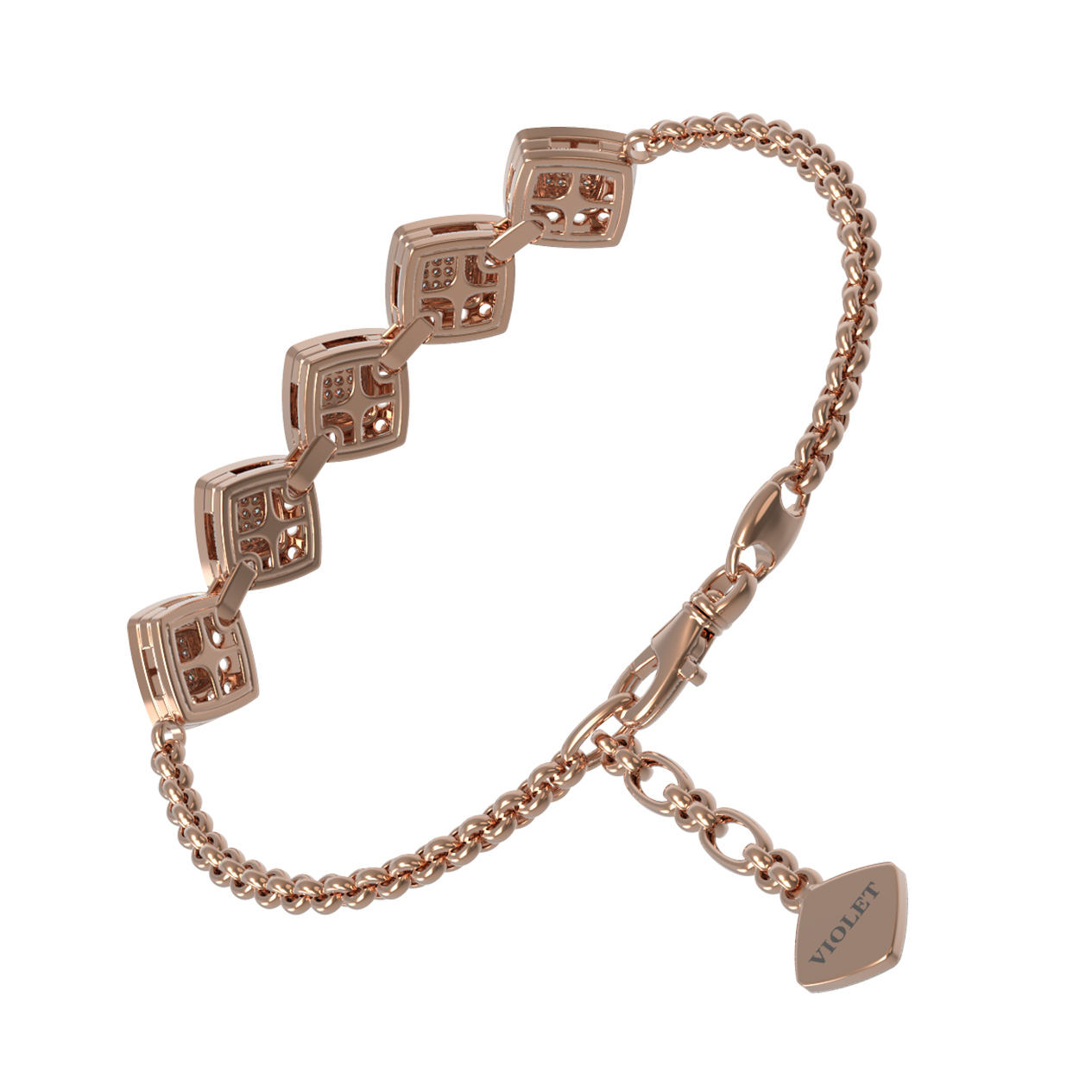 Роскошный браслет из коллекции De Luxe Бриллианты — Quattro воплощает собой гармонию стиля и мастерства ювелирного дела. Это украшение выполнено из красного золота 585 пробы, чей теплый оттенок идеально подчеркивает глубину и блеск драгоценных камней. Основа изделия — изящная цепочка, дополненная пятью выразительными элементами геометрической формы, которые притягивают взгляд своим сложным дизайном.