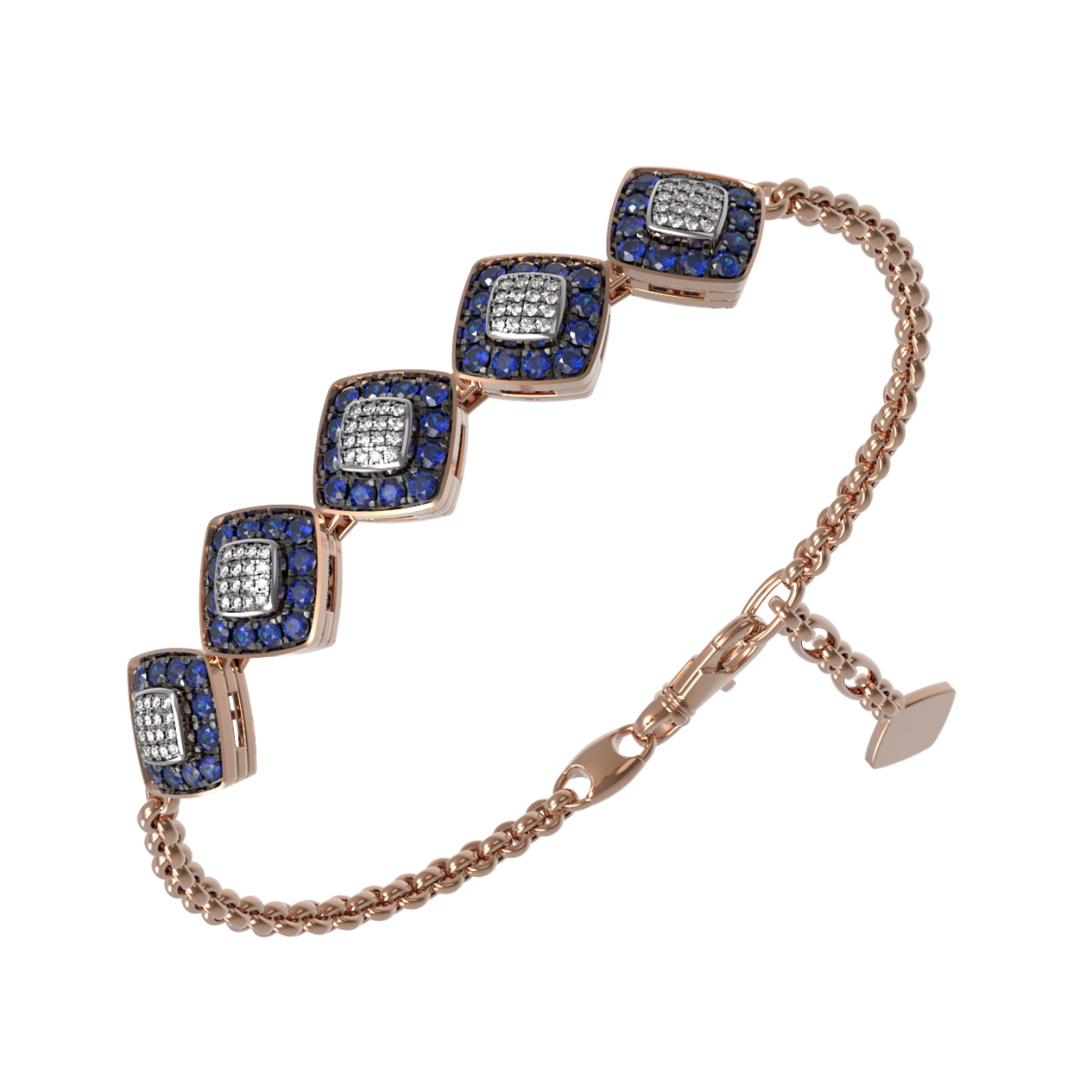 Центральная часть декоративных звеньев инкрустирована сияющими белыми бриллиантами, которые окружены насыщенными синими сапфирами. Всего в дизайне использовано 140 камней круглой огранки, создающих эффектную игру света и цвета. Гармоничное сочетание красного золота, прозрачных бриллиантов и глубоких сапфиров делает этот браслет универсальным аксессуаром.