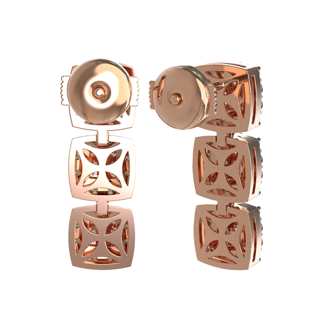 Элегантные серьги из коллекции De Luxe Бриллианты — Quattro станут воплощением утонченного стиля и статусного украшения. Модель выполнена из красного золота 585 пробы, чей теплый оттенок благородно подчеркивает сияние драгоценных вставок. Дизайн изделия объединяет в себе классику и современные ювелирные тренды: три квадратных звена, соединенных подвижно, создают эффектную вертикаль, привлекающую внимание к вашему образу.