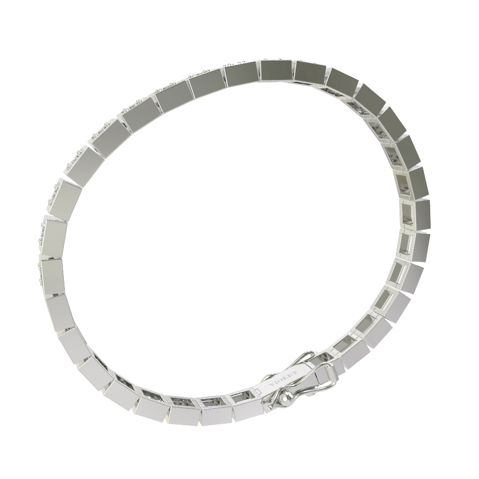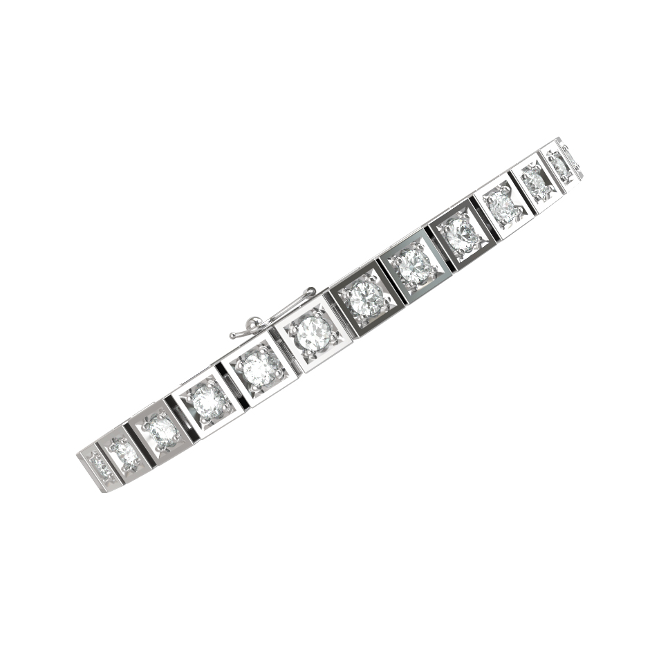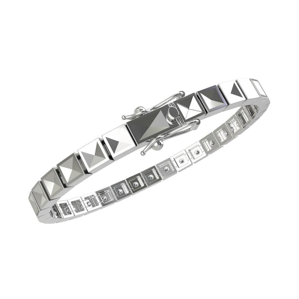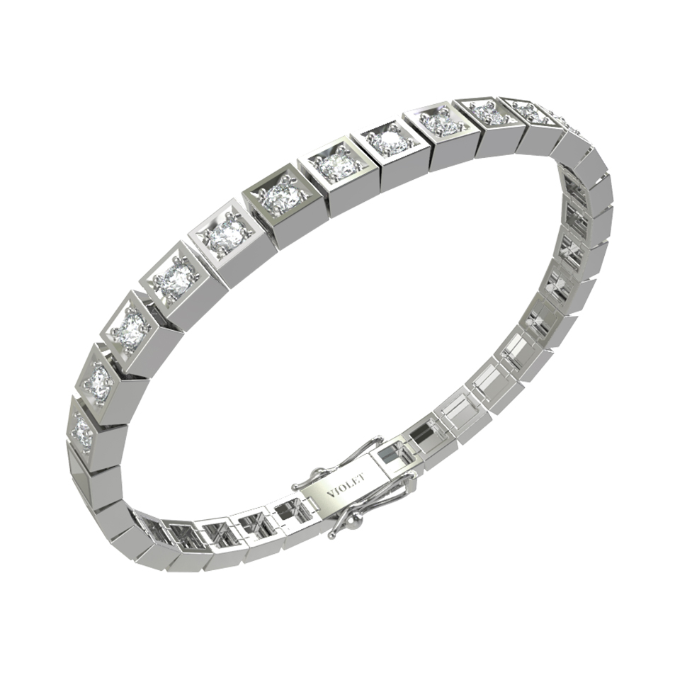 Дизайн браслета построен на геометрической точности: звенья в форме квадратов создают строгую и современную композицию. В центре каждого элемента надежно закреплен бриллиант круглой огранки. Белый цвет вставок гармонично сочетается с материалом оправы, создавая единый монохромный образ, который выглядит невероятно дорого и притягательно. Всего в украшении использовано 48 бриллиантов, придающих ему благородное мерцание при каждом движении руки.