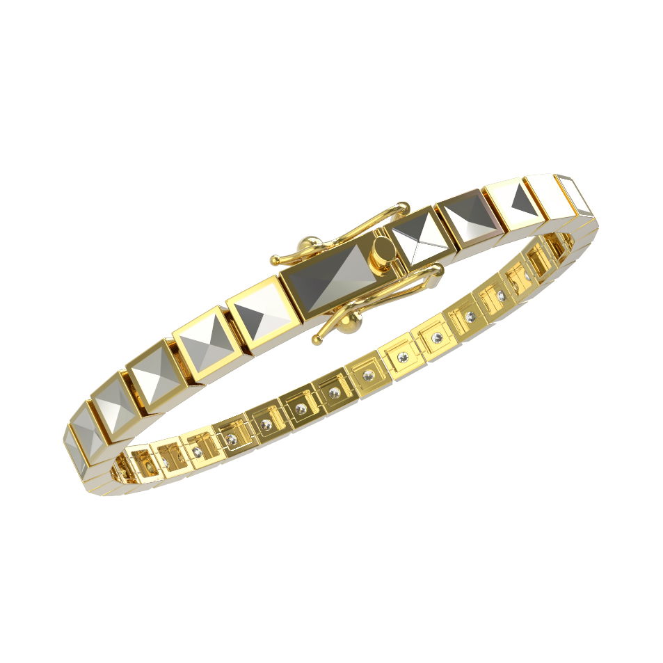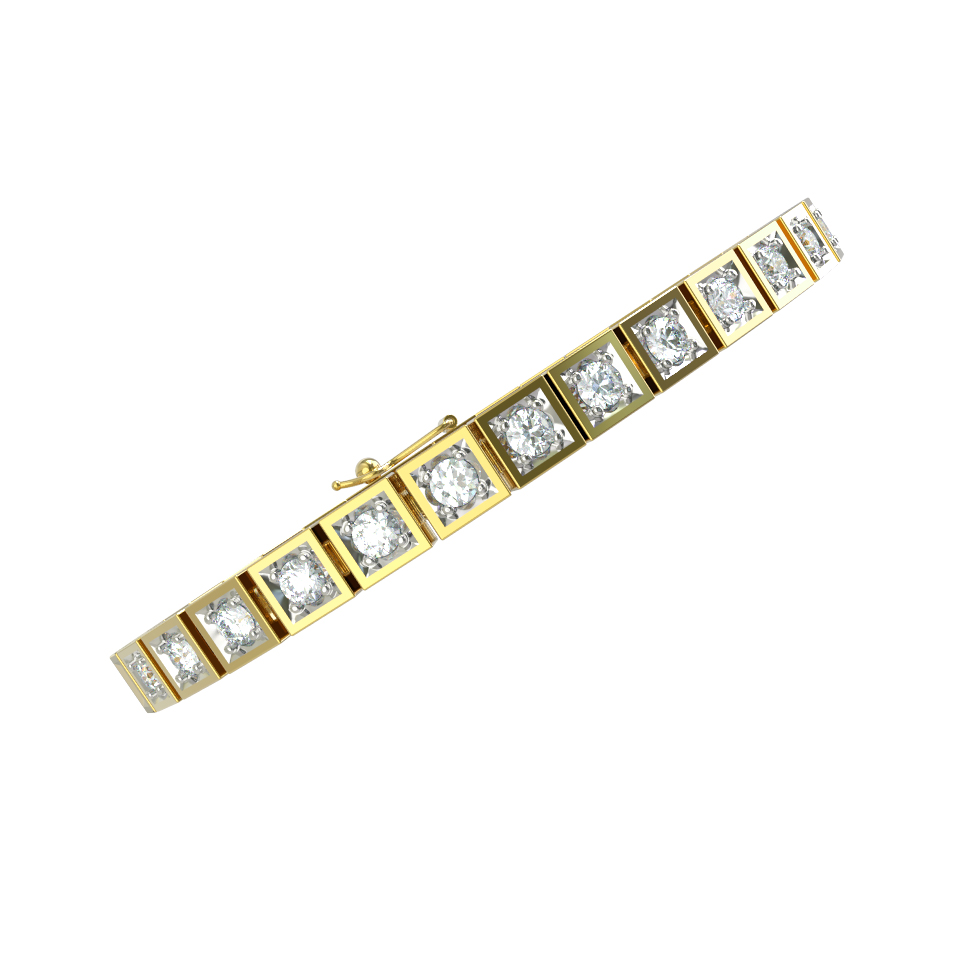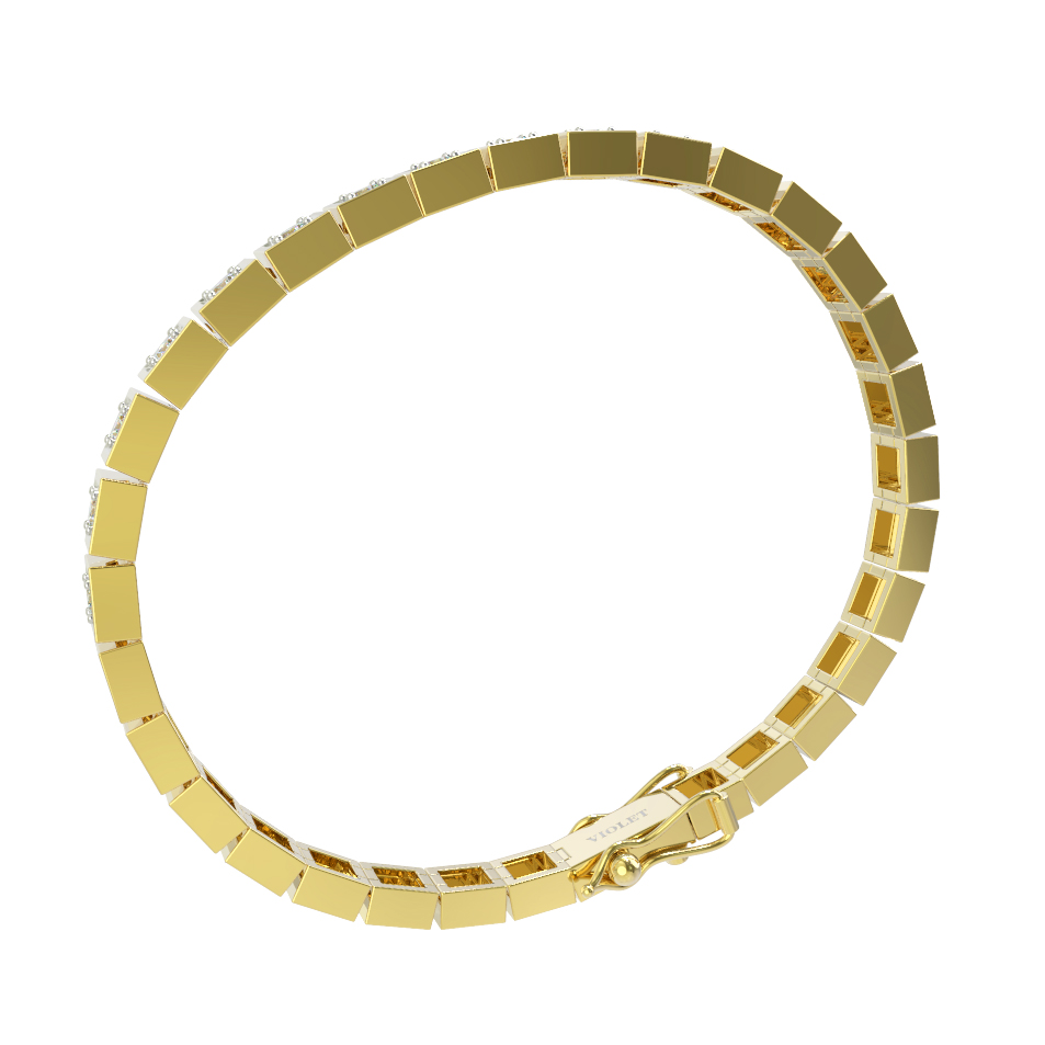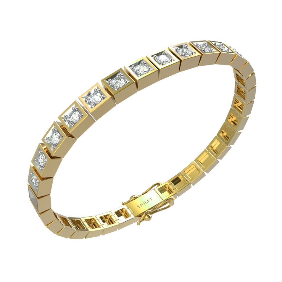 Дизайн браслета построен на ритмичном повторении квадратных звеньев, каждое из которых инкрустировано сверкающим камнем. В качестве вставки использованы 48 бриллиантов белого цвета круглой формы огранки. Прозрачные камни великолепно контрастируют с теплым, солнечным оттенком лимонного золота, создавая эффектный блеск при любом освещении. Качественная обработка металла и надежная фиксация вставок гарантируют долговечность и комфорт при повседневном ношении.