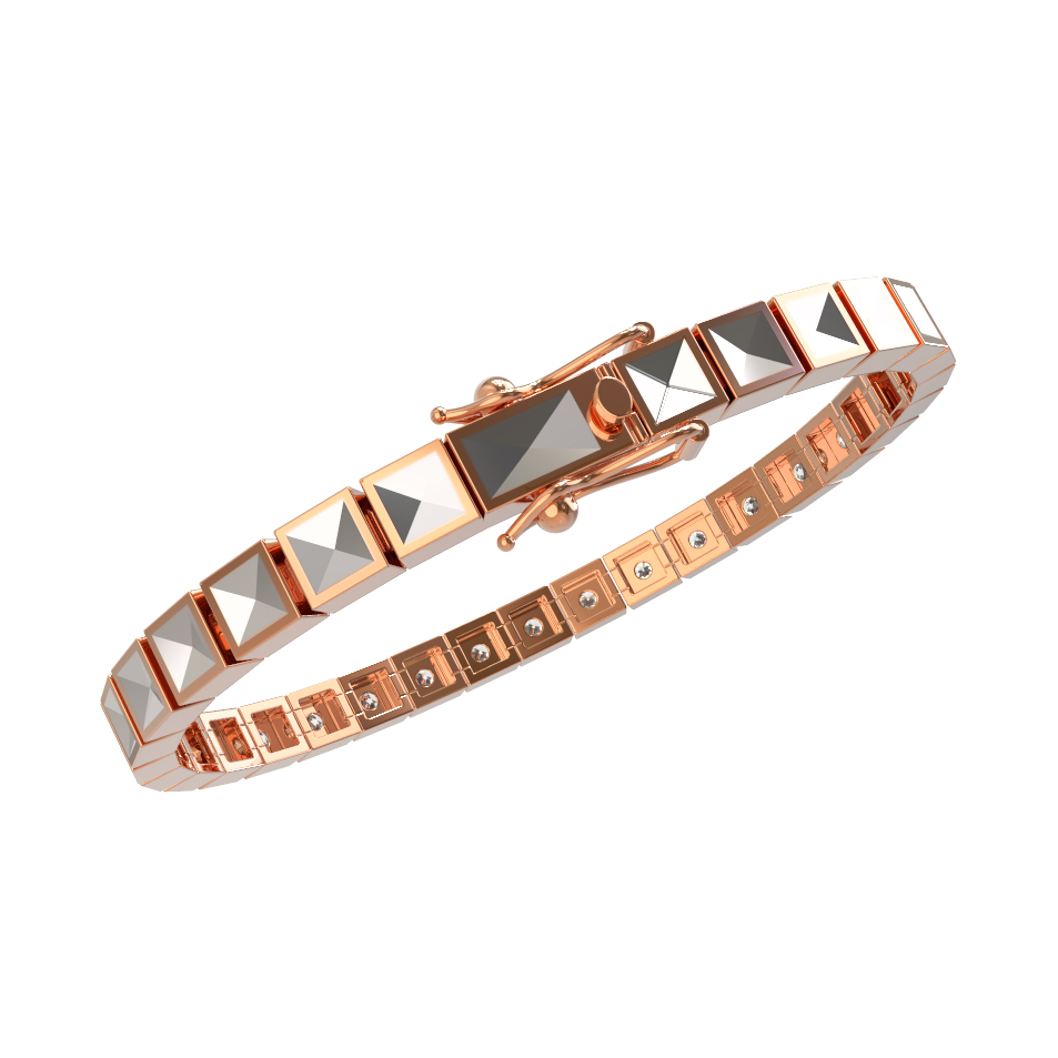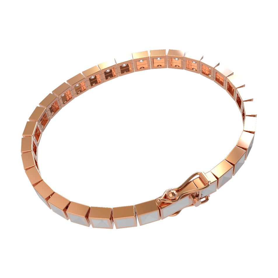 Центральным элементом изделия стали 48 бриллиантов круглой формы с чистым белым цветом, которые расположены по всему периметру браслета. Каждая вставка надежно зафиксирована, что обеспечивает комфорт при повседневной носке и подчеркивает высокое качество исполнения. Благодаря своей структуре, браслет гибко облегает запястье, сохраняя при этом четкую форму звеньев.