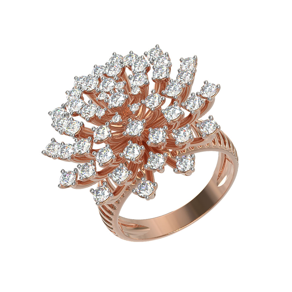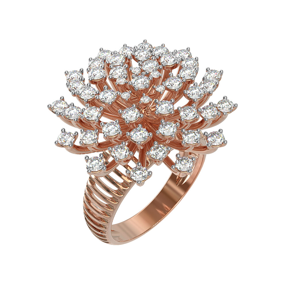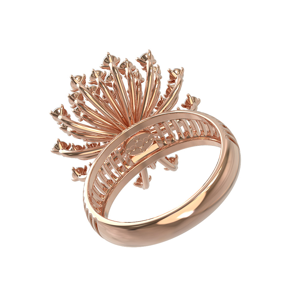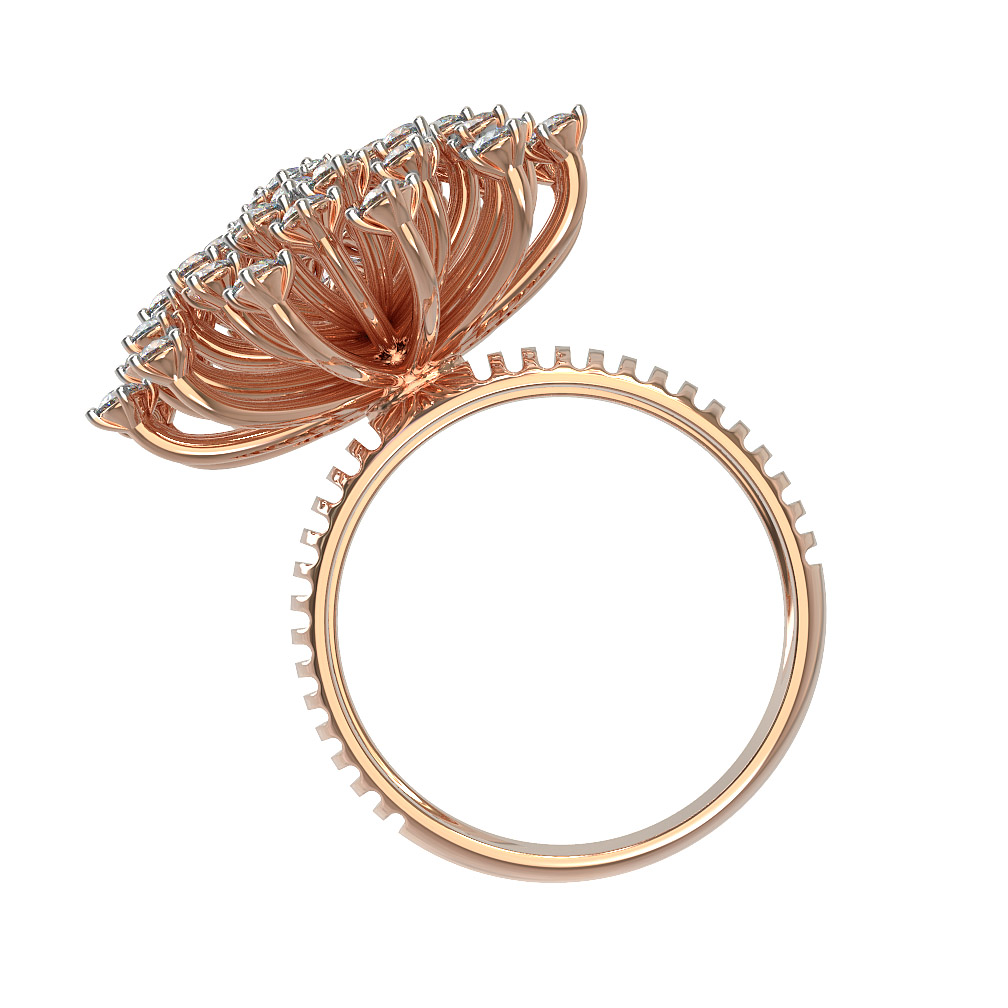 Центральным элементом композиции стали 49 бриллиантов круглой огранки. Белый цвет вставок придает украшению невероятную яркость и чистоту. Каждый бриллиант закреплен таким образом, чтобы максимально отражать свет, создавая при каждом движении руки завораживающую игру бликов. Это кольцо станет идеальным дополнением к вечернему образу или изысканным подарком для ценителей эксклюзивных ювелирных изделий.