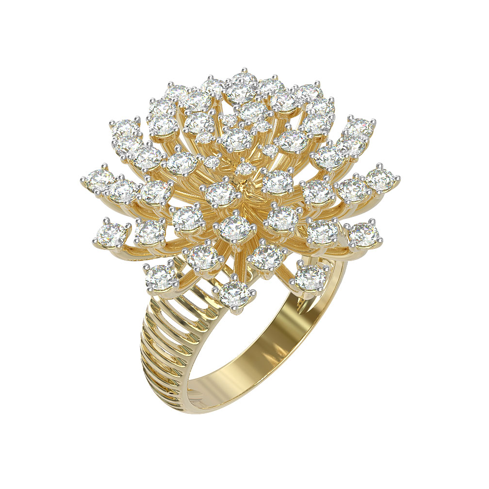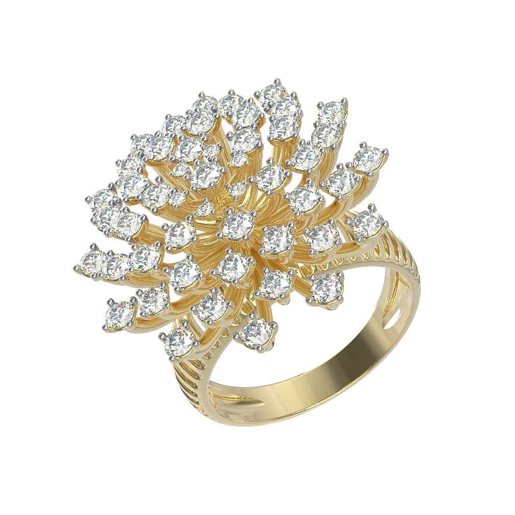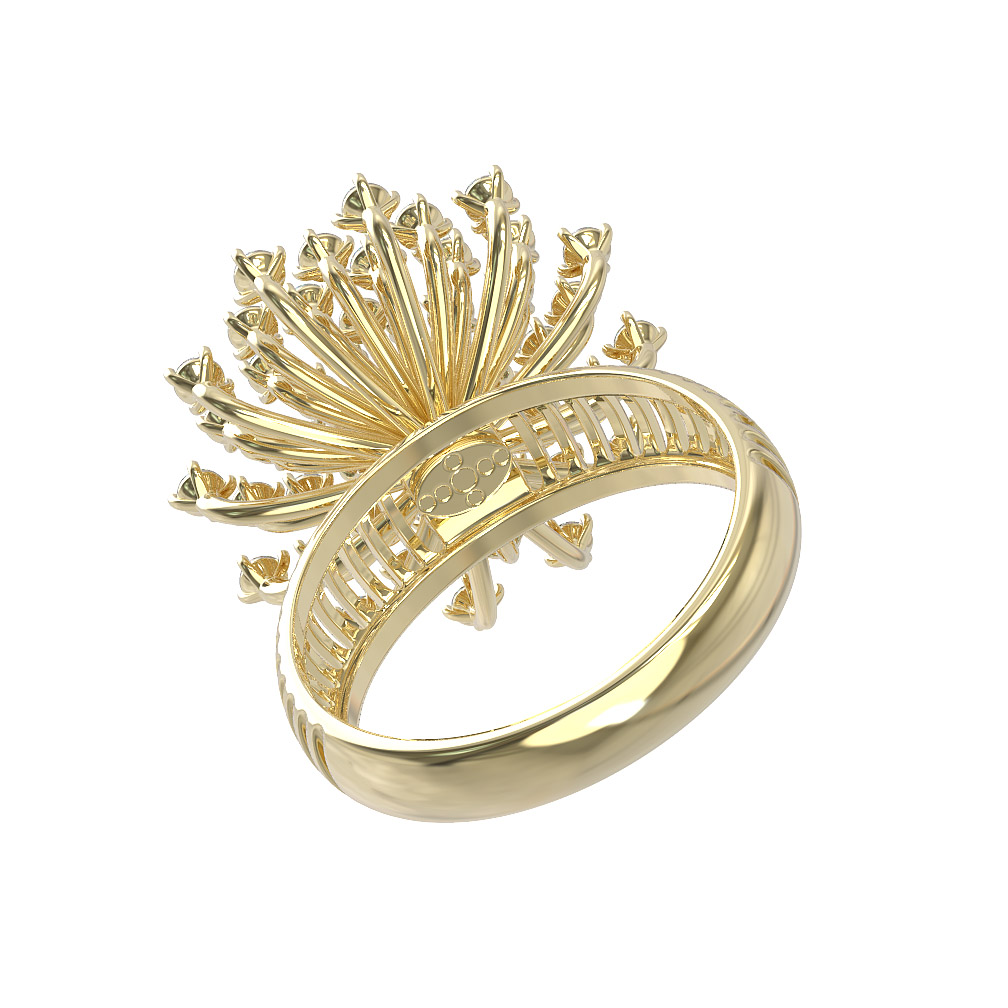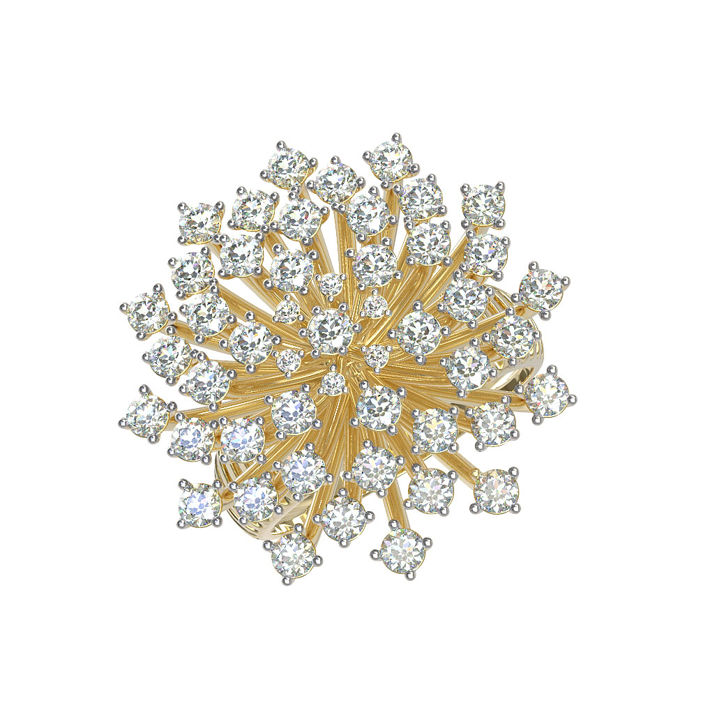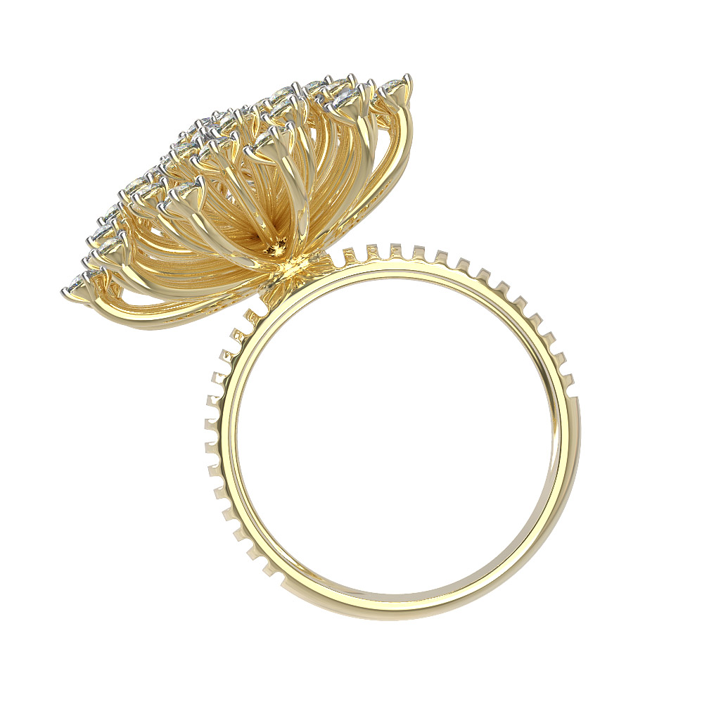 Центральным элементом декора выступают 49 бриллиантов круглой огранки. Белые камни гармонично контрастируют с теплым оттенком лимонного золота, создавая невероятное сияние и игру света при каждом движении. Визуально объемная верхушка кольца выглядит легко и воздушно благодаря изящным креплениям, на которых закреплен каждый камень.