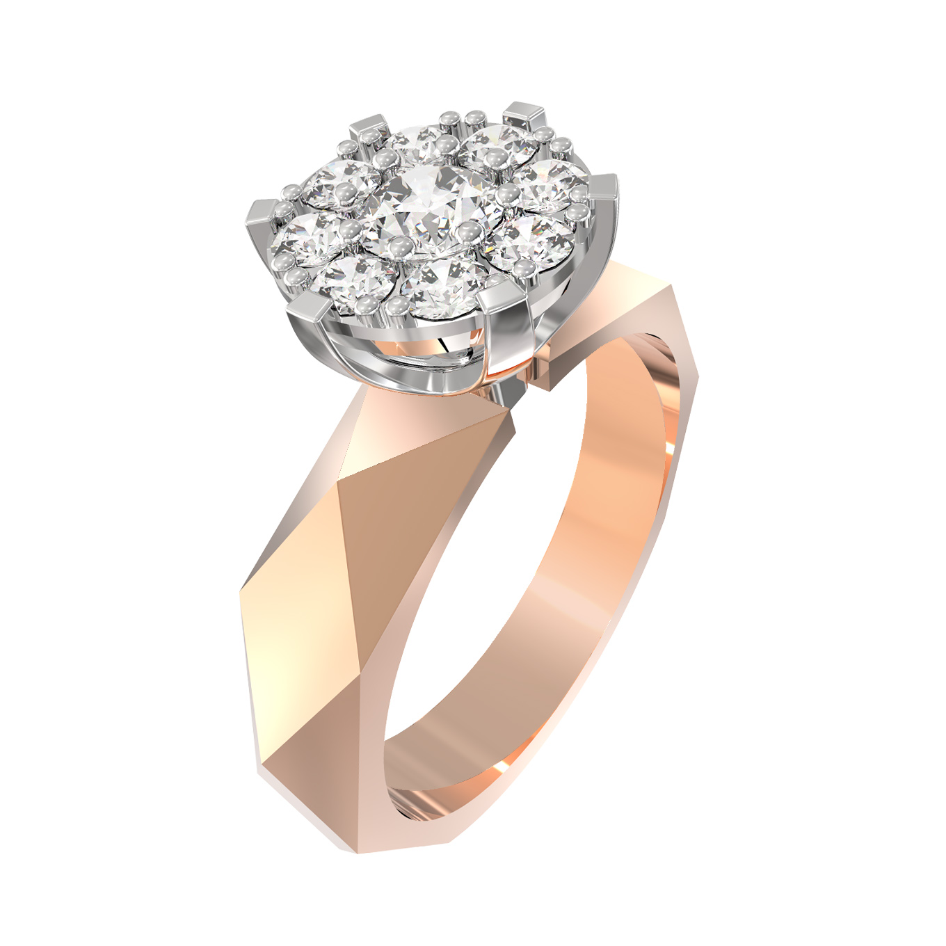 Сердцем композиции является роскошная декоративная часть, в которой гармонично разместились 9 вставок из бриллиантов. Белые камни имеют классическую круглую форму, которая идеально раскрывает их природное сияние и игру света. Благодаря контрастному сочетанию красного металла и чистых прозрачных камней, изделие выглядит ярко и эффектно. Это кольцо станет прекрасным подарком к важному событию, символизируя глубокие чувства и внимание к деталям.