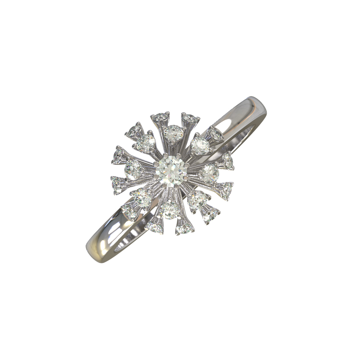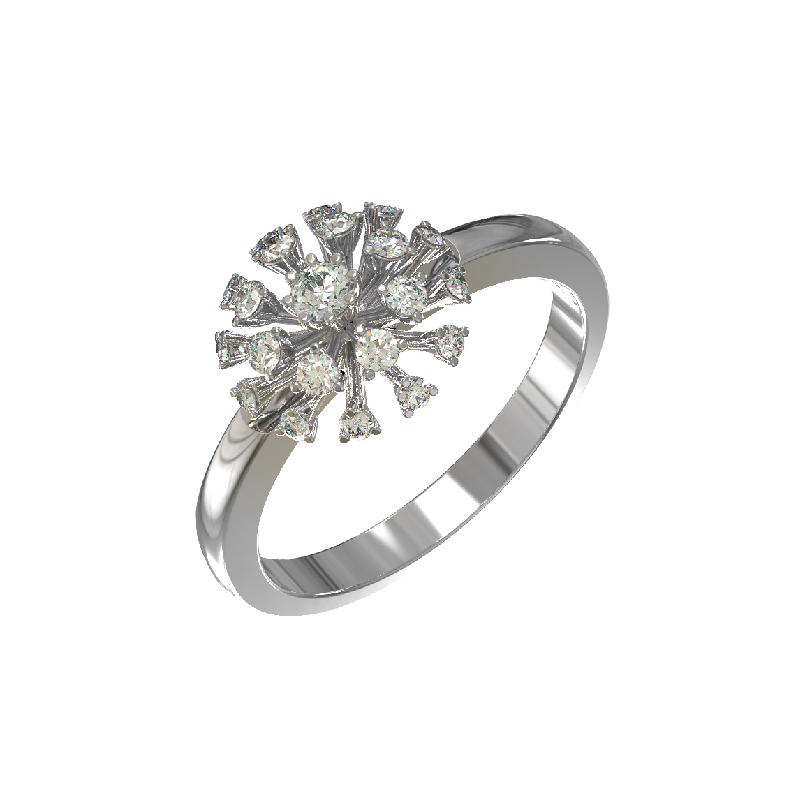 Кольцо из белого золота 585 пробы из коллекции De Luxe Бриллианты — Ease воплощает безупречную эстетику и мастерство ювелирного искусства. Центральным элементом украшения стала сложная, выразительная композиция, напоминающая распускающийся цветок или сияющий салют. В центре этого ювелирного ансамбля закреплена группа из 21 бриллианта круглой огранки, создающих ослепительную игру света. Белый цвет камней идеально сочетается с холодным блеском драгоценного металла, придавая изделию статус и благородство.