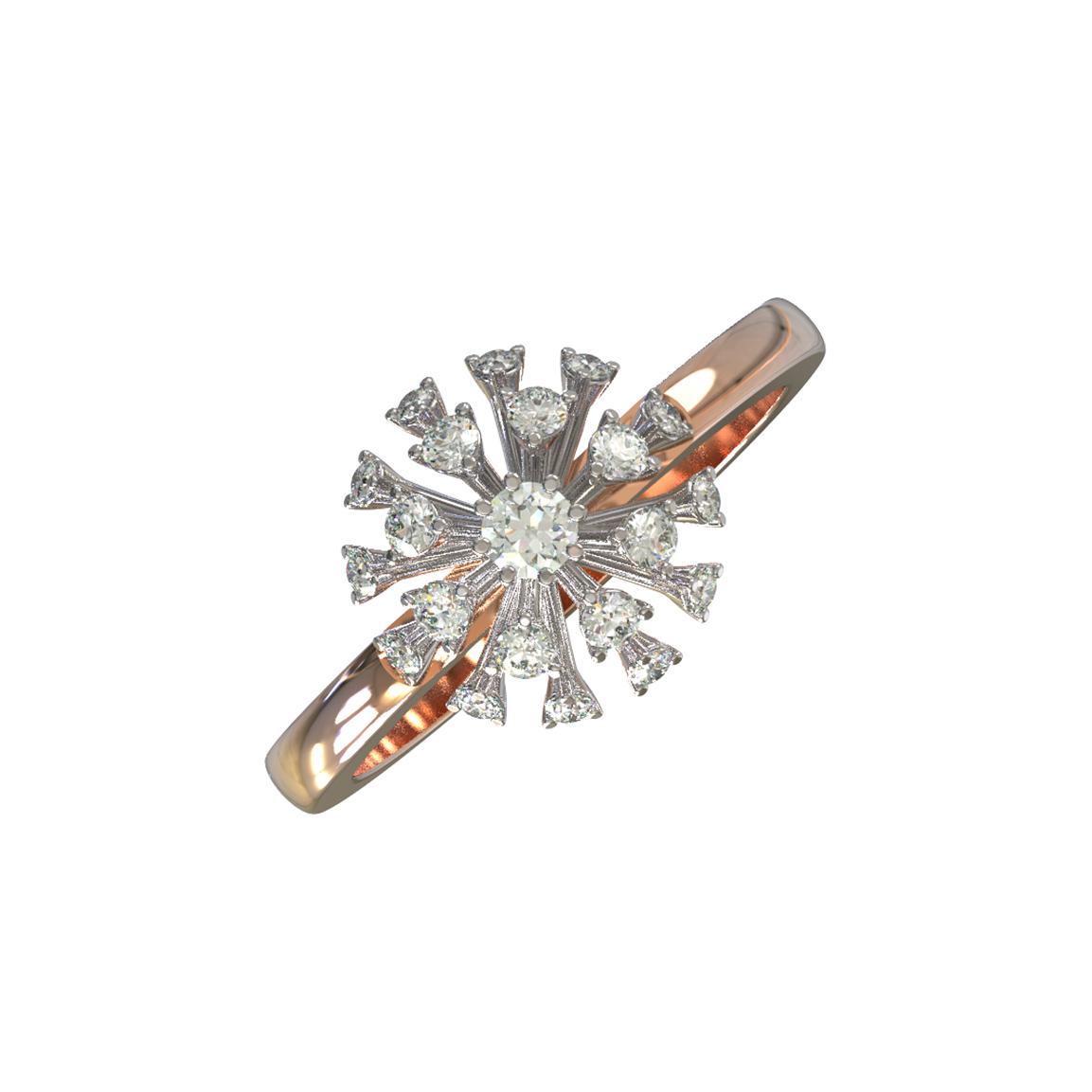 Кольцо из красного золота 585 пробы с бриллиантами представляет собой утонченное воплощение ювелирного искусства, идеально дополняющее образ уверенного в себе человека. Это изделие, вошедшее в коллекцию De Luxe Бриллианты — Ease, привлекает внимание своей необычной формой, напоминающей сияющий цветок или вспышку света. В центре композиции расположены 21 бриллиант круглой формы с классическим белым цветом, которые закреплены так, чтобы максимально раскрыть игру света при каждом движении руки.
