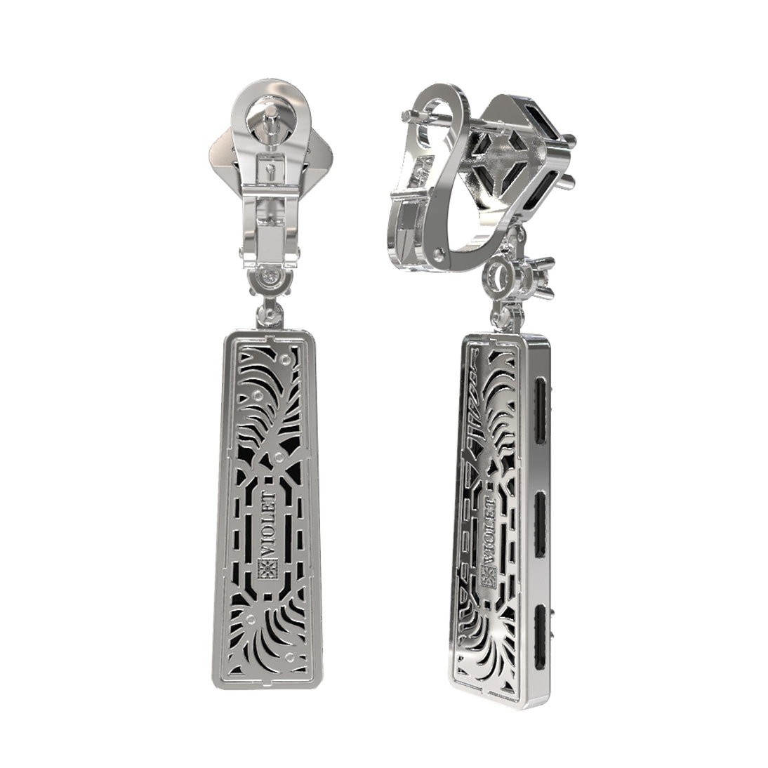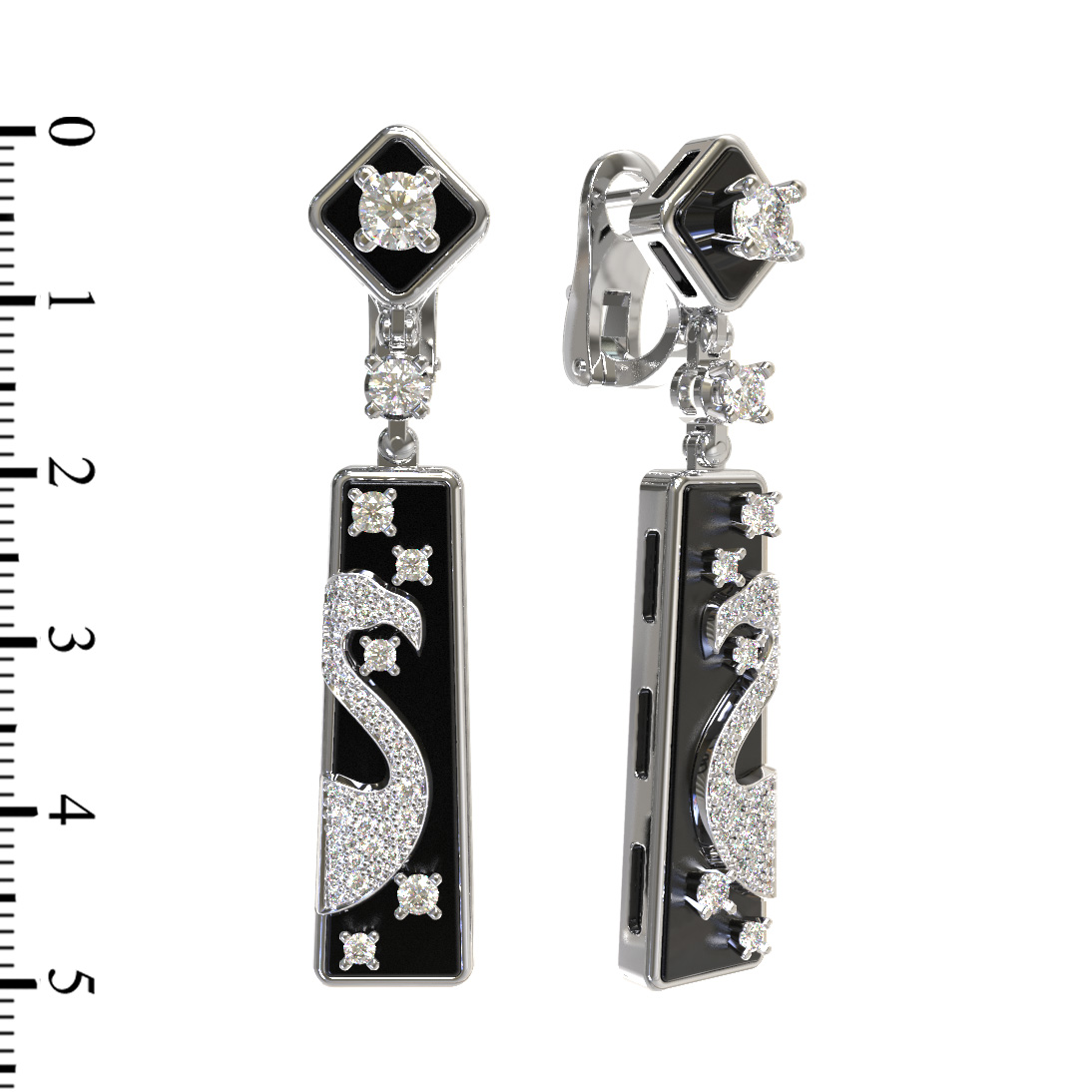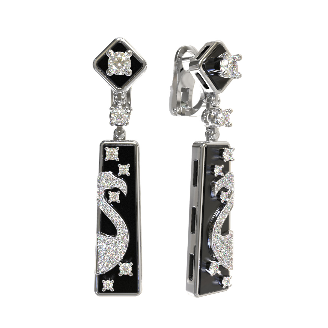 Серьги из коллекции De luxe Premium — Фламинго — это воплощение ювелирного искусства, где строгость геометрических линий встречается с изяществом анималистичного дизайна. Эти серьги, выполненные из белого золота 585 пробы, представляют собой изысканное сочетание контрастных текстур и цветов. Основным акцентом украшения является глубокий черный оникс, на фоне которого особенно ярко сияют вставки из бриллиантов.