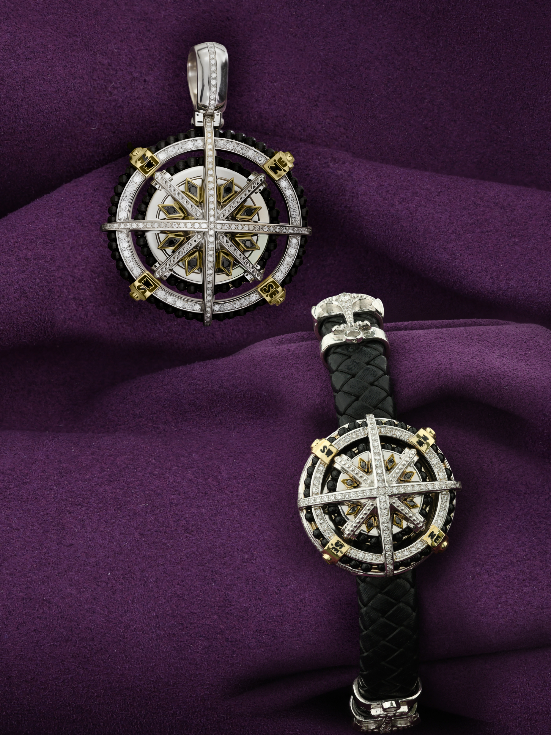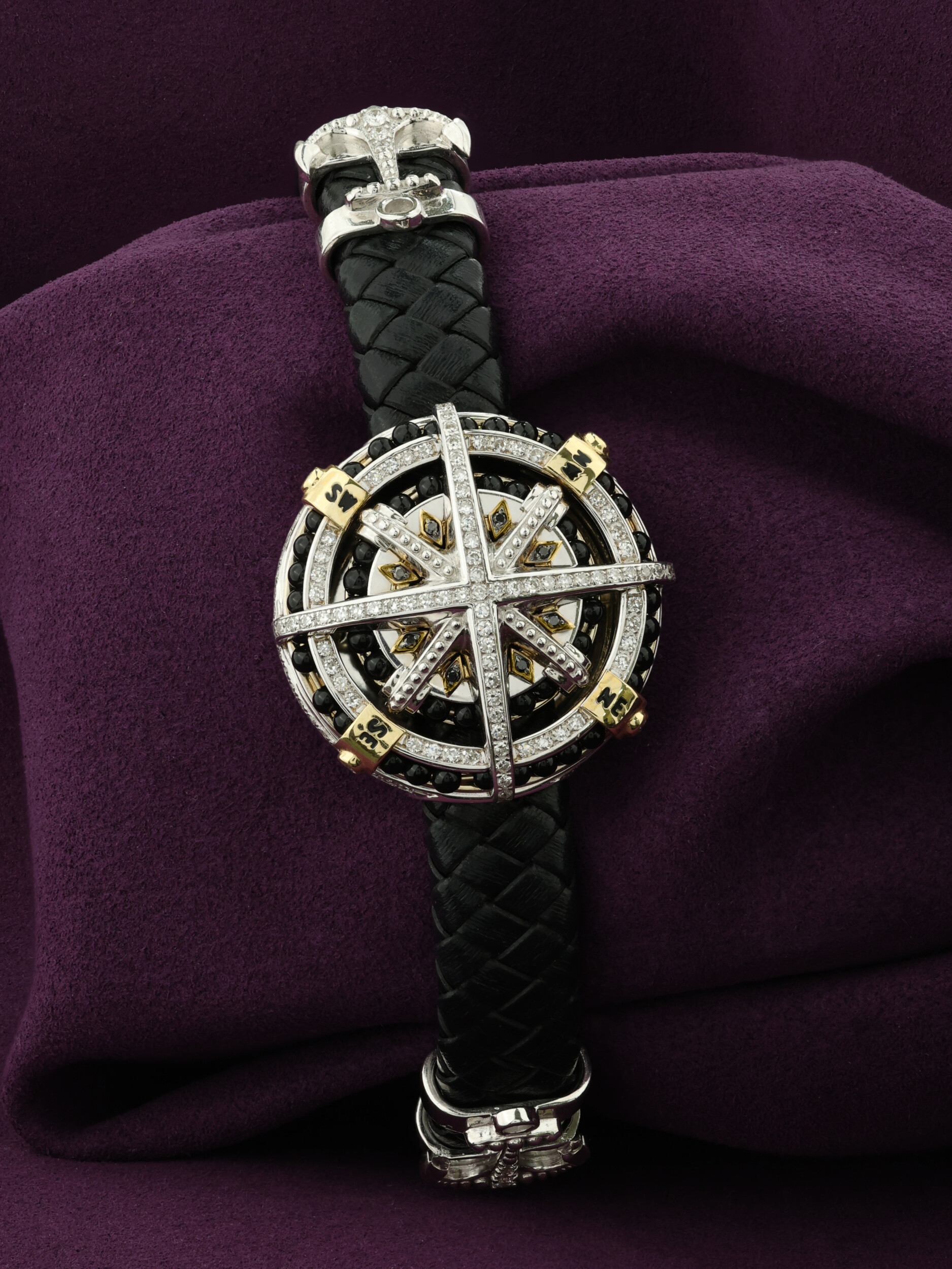 Мужской браслет из белого золота 585 пробы из коллекции De luxe Premium — Роза ветров станет идеальным дополнением образа уверенного в себе мужчины. Массивное и статусное украшение выполнено в сложном дизайне, где холодный блеск металла сочетается с глубоким черным цветом вставок из оникса. Центральный элемент изделия напоминает навигационный компас, мастерски декорированный эмалью и инкрустированный множеством сияющих бриллиантов. Вставки имеют разнообразные формы: круглые бусины оникса, а также круглые и овальные элементы, которые создают неповторимый визуальный ритм.