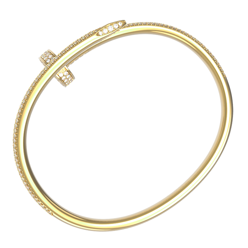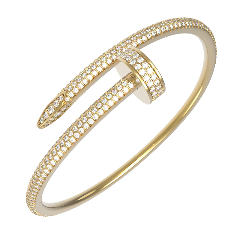 Роскошный браслет из лимонного золота 585 пробы из коллекции De Luxe — Гвоздь станет безупречным акцентом вашего образа. Дизайн в форме гвоздя сочетает в себе смелую эстетику и непревзойденное ювелирное мастерство, создавая украшение, которое одинаково эффектно смотрится как на женщинах, так и на мужчинах. Утонченное сияние лимонного золота гармонично дополнено россыпью драгоценных камней: изделие инкрустировано 1488 бриллиантами круглой огранки с белым цветом вставок, которые создают завораживающую игру света при каждом движении.