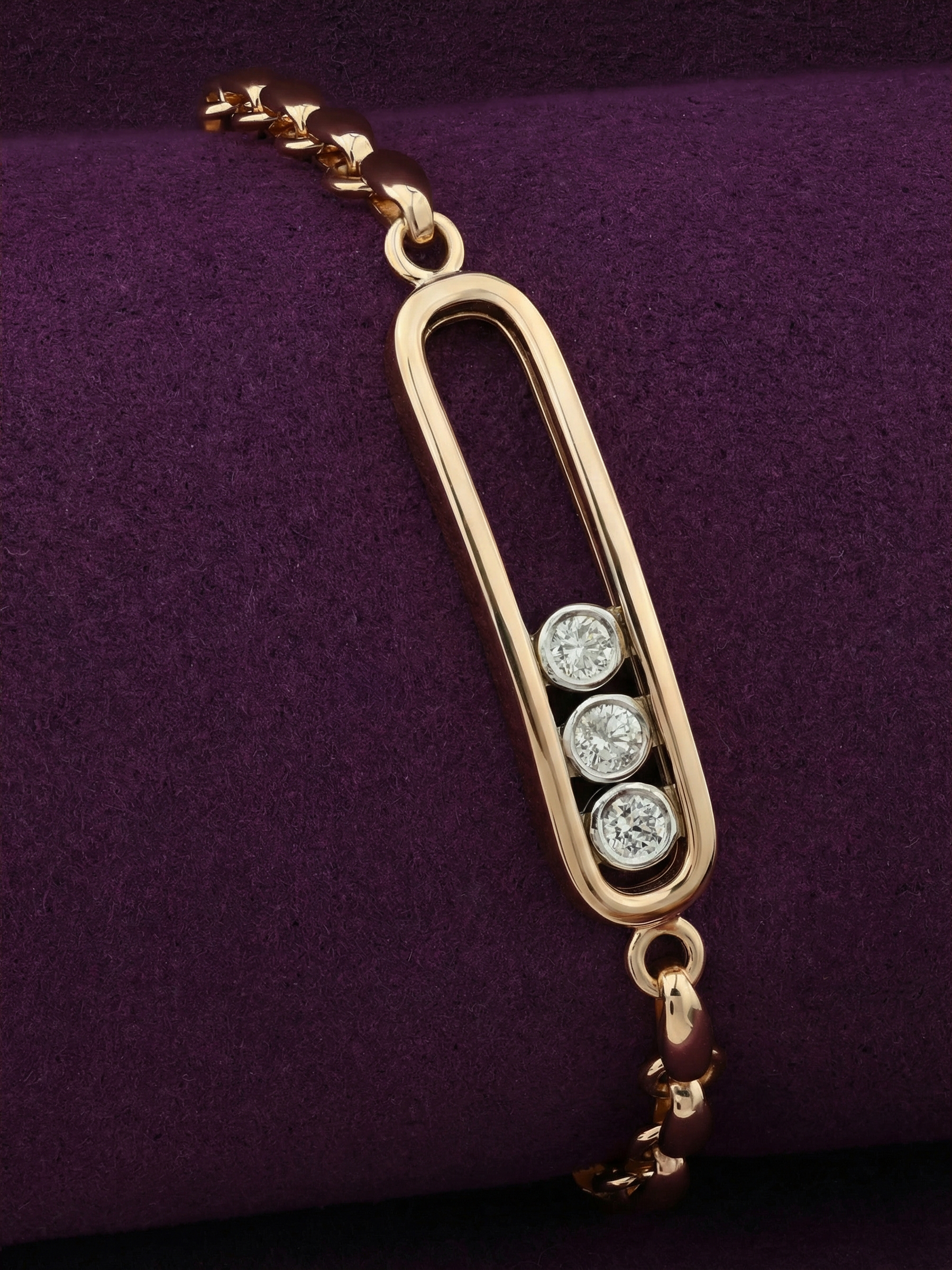 Элегантный и лаконичный браслет из красного золота 585 пробы станет безупречным завершением вашего образа. Это украшение из коллекции De Luxe — Движение воплощает в себе эстетику современного минимализма, где геометрия форм встречается с классической роскошью драгоценных камней. Основой композиции является изящный овальный элемент, внутри которого расположены пять сияющих бриллиантов. Белые вставки круглой огранки эффектно контрастируют с насыщенным теплым оттенком красного золота, создавая гармоничное и притягательное сочетание.