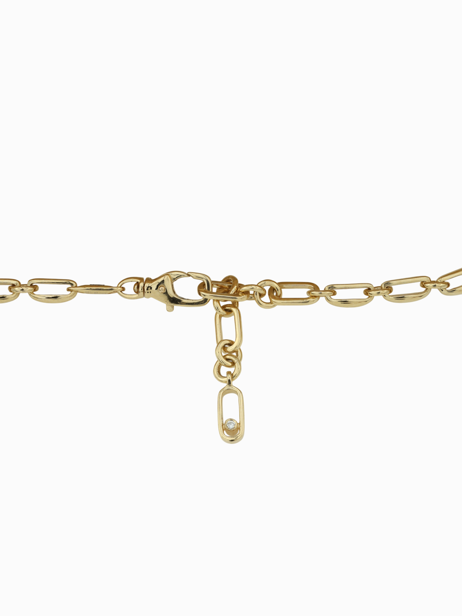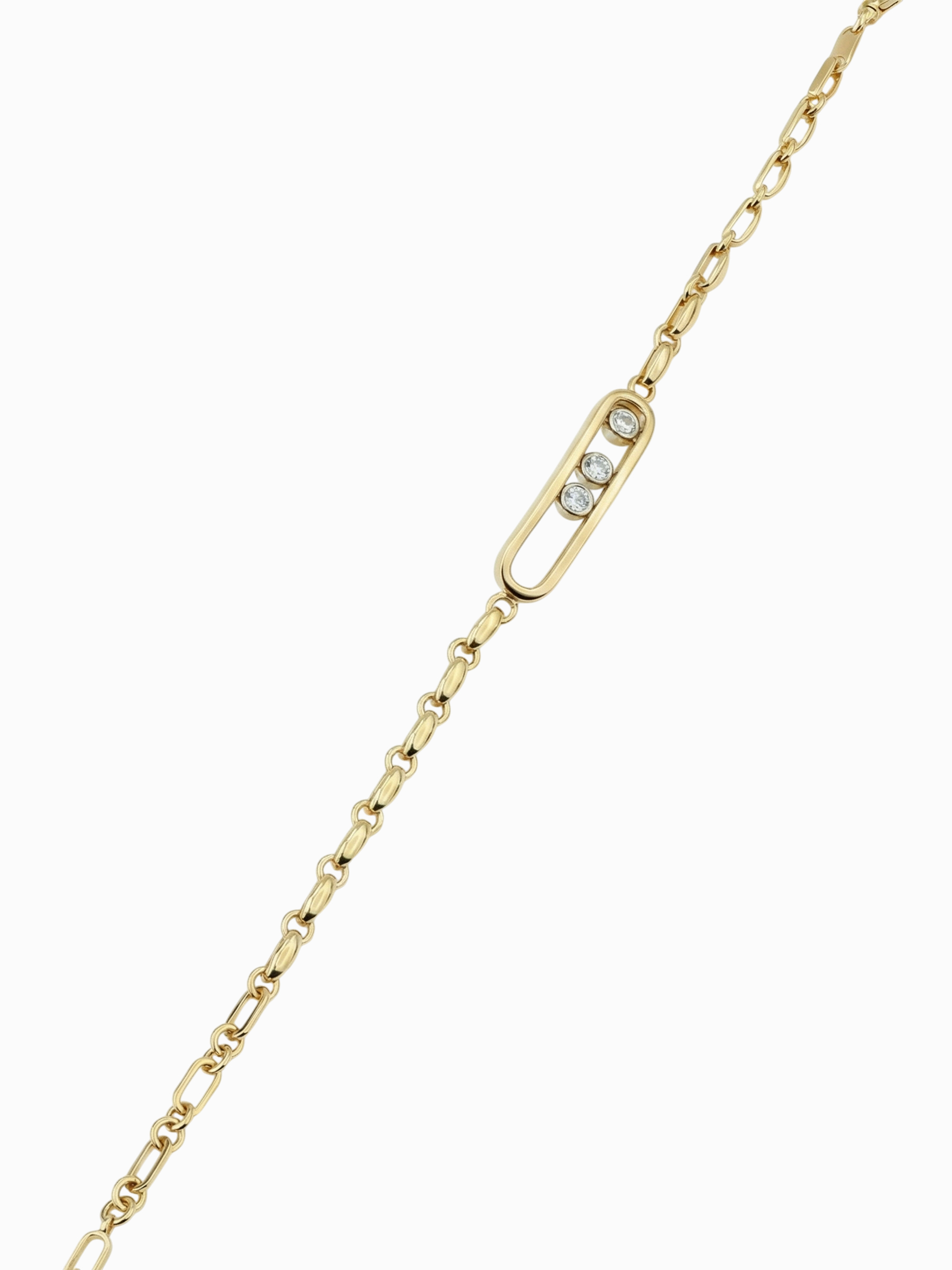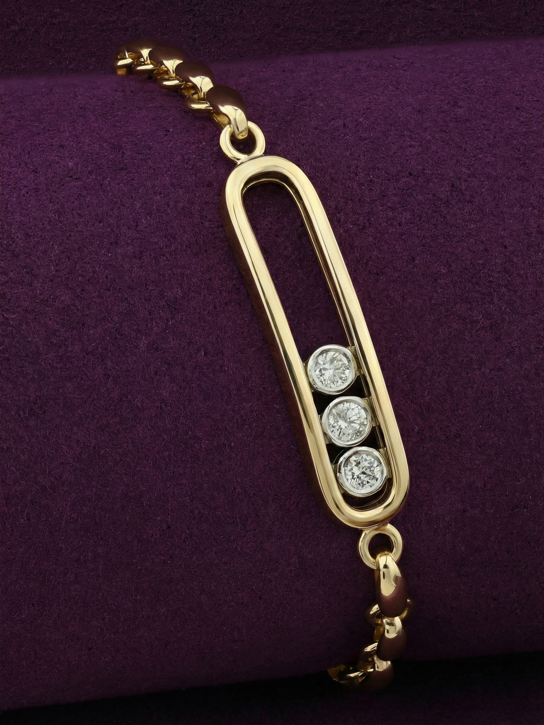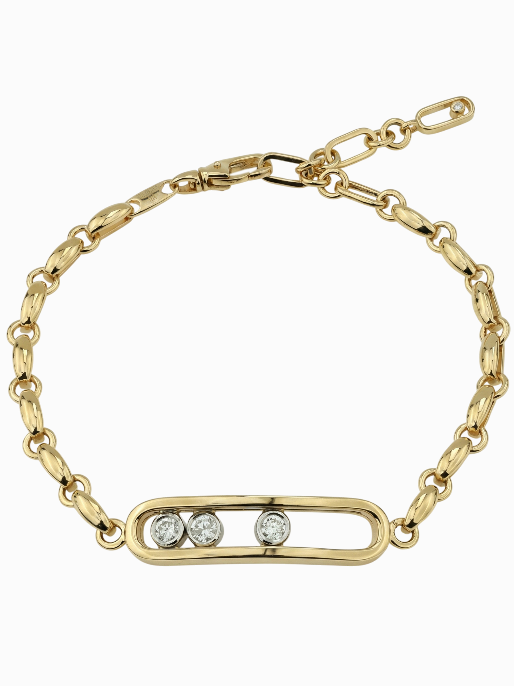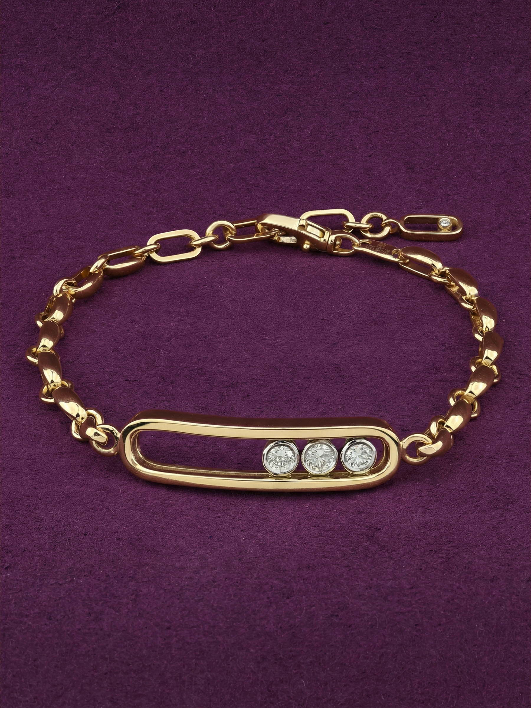 Роскошный блеск драгоценного металла теплого лимонного оттенка гармонично сочетается с чистотой пяти бриллиантов круглой формы. Белый цвет вставок создает выразительный контраст, наполняя украшение внутренним свечением. Надежное и комфортное плетение цепи обеспечивает идеальную посадку на запястье, делая этот браслет прекрасным дополнением к повседневному или вечернему образу.