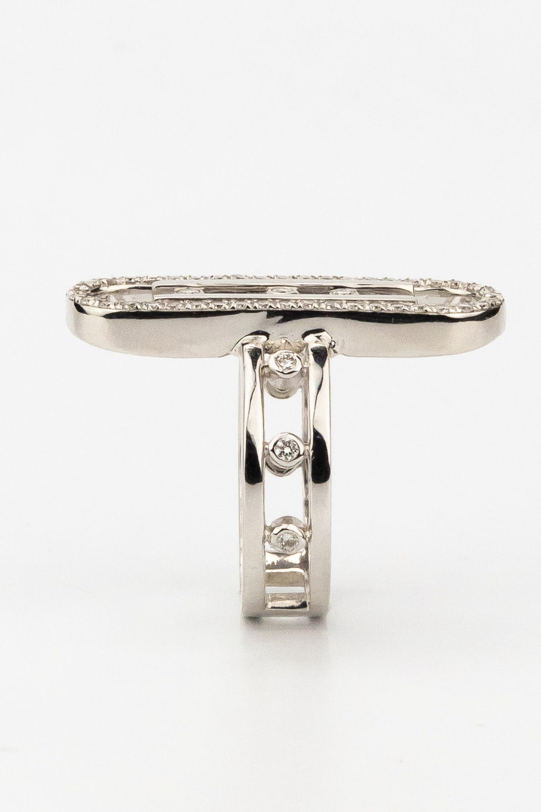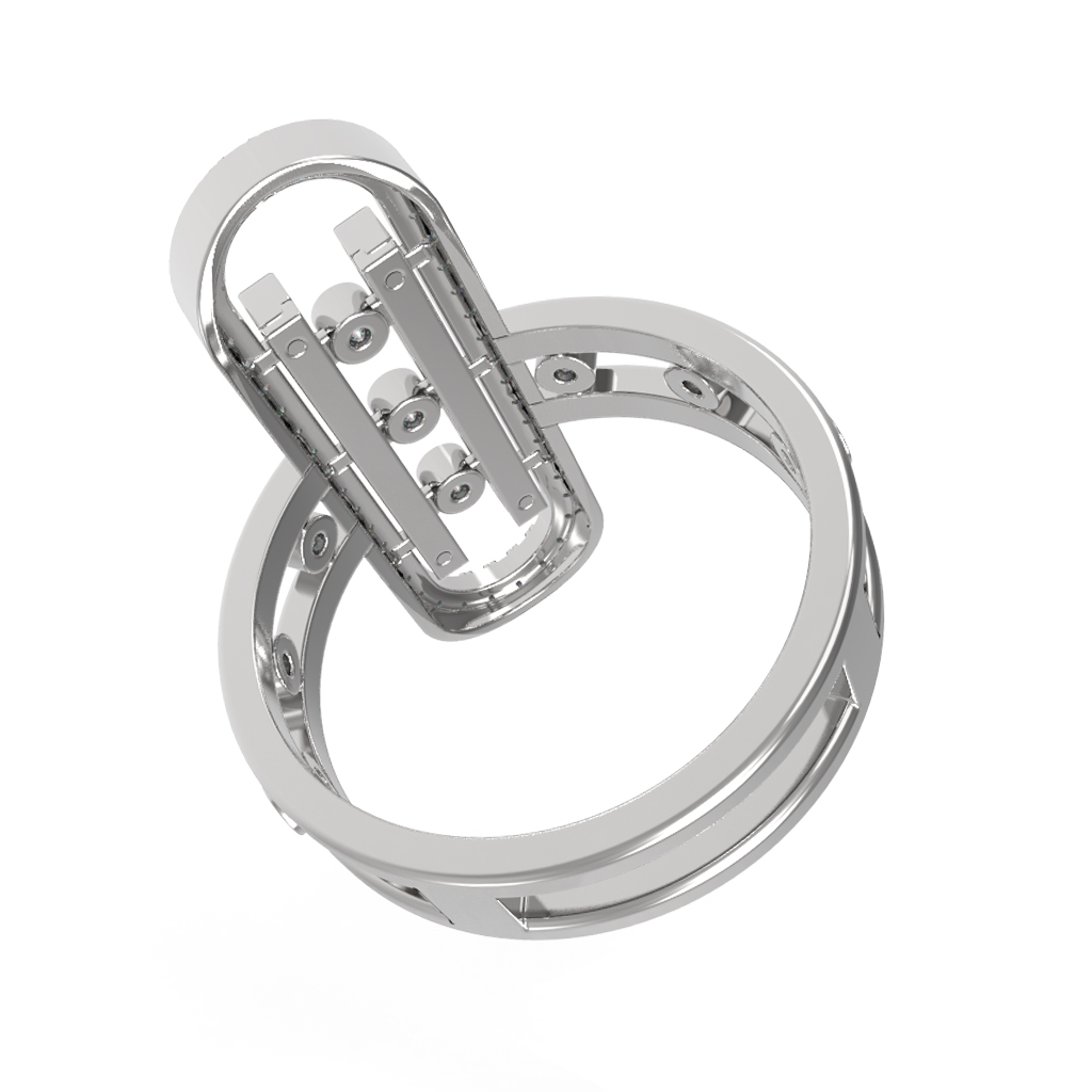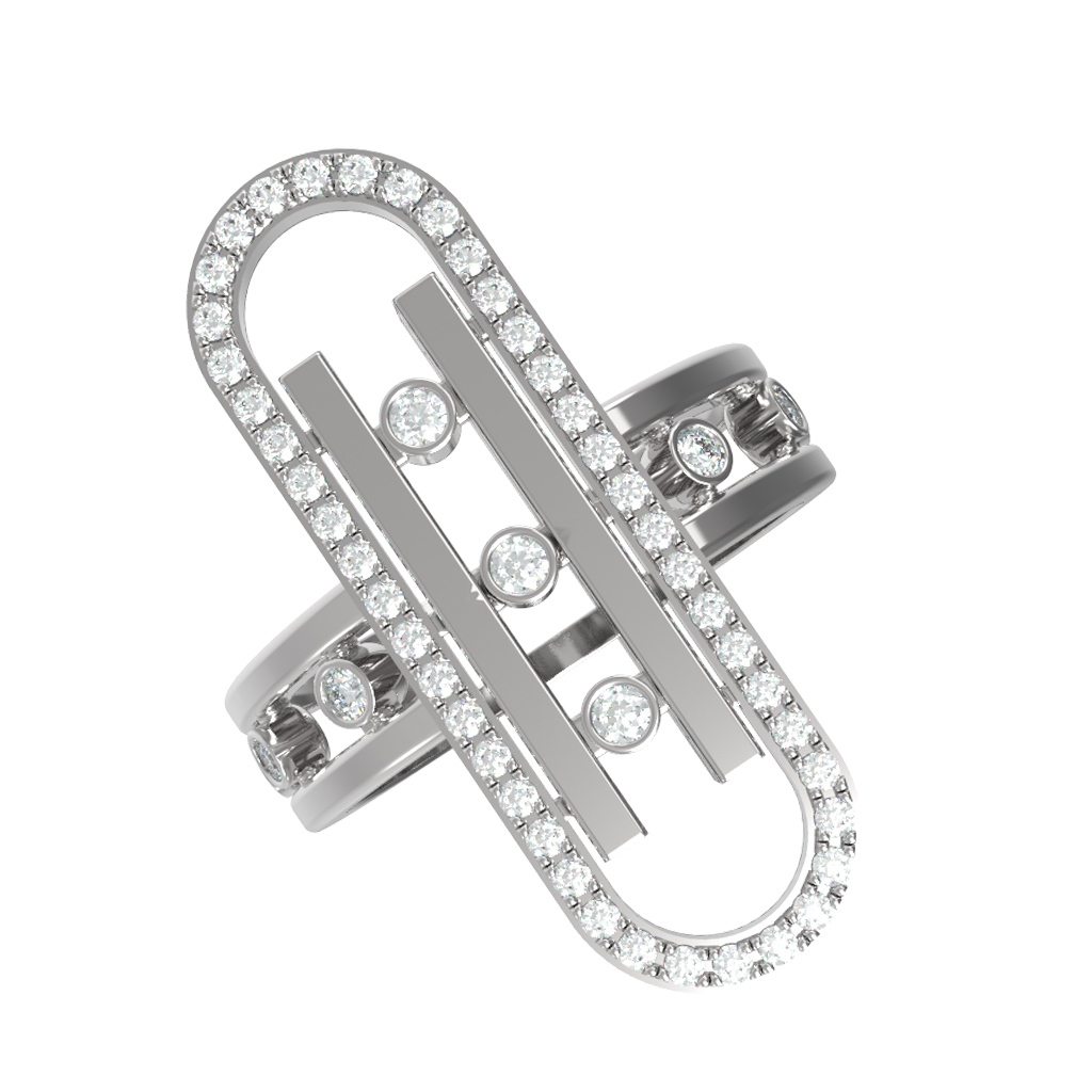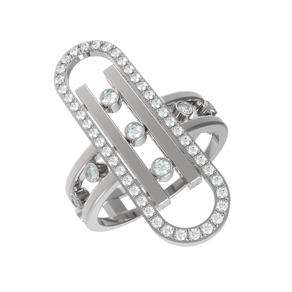 Центральный акцент композиции — оригинальный дизайн с элементами геометрии, который притягивает взгляд своей выверенной формой. Кольцо инкрустировано 53 бриллиантами круглой формы с чистым белым цветом, которые создают завораживающую игру света при каждом движении руки. Это ювелирное изделие гармонично дополнит как строгий деловой образ, так и вечерний наряд, подчеркивая индивидуальность владельца. Модель является универсальной и подходит как для женщин, так и для мужчин.