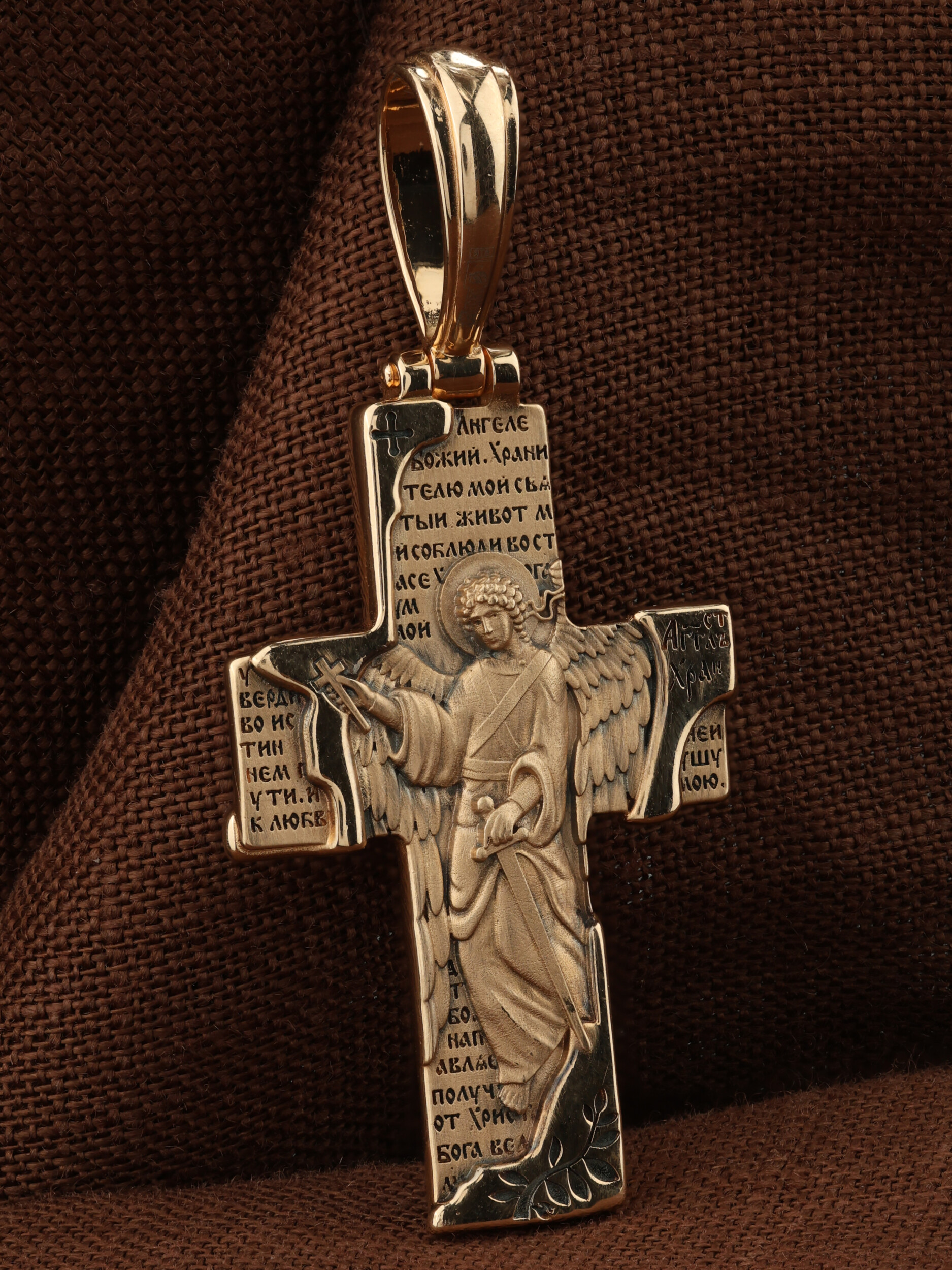 На оборотной стороне креста изображен Святой Ангел-Хранитель в виде прекрасного, светозарного юноши держащего в правой руке крест, а в левой — мечь. Ангел-Хранитель — это Ангел приставляемый Богом к человеку при крещении для охраны и помощи в добрых делах. Рядом с изображением размещена молитва: «Ангеле Божий, хранителю мой святый, живот мой соблюди во страсе Христа Бога, ум мой утверди во истиннем пути, и к любви горней уязви душу мою, да тобою направляем, получу от Христа Бога велию милость».