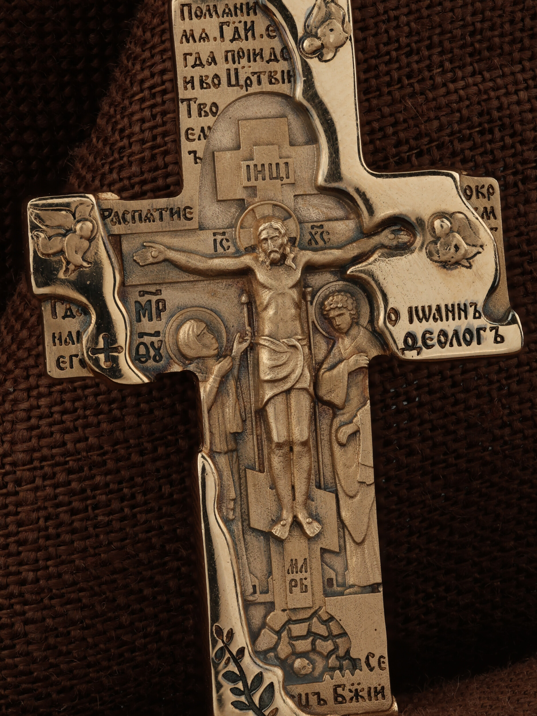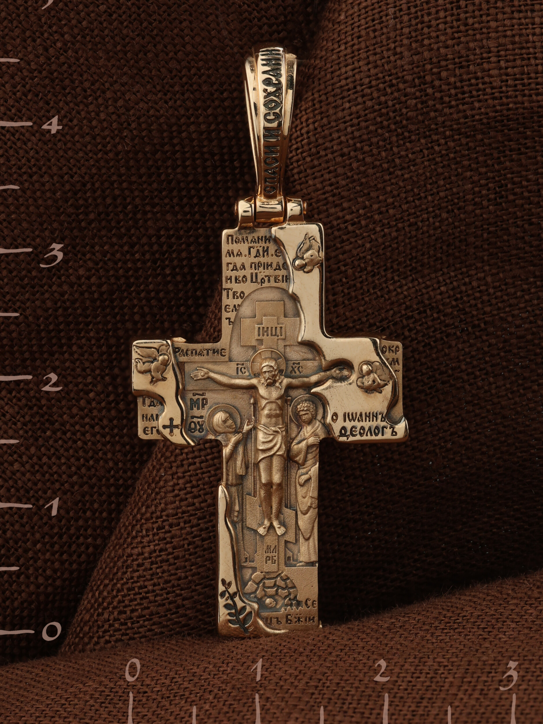 Изделие воплощено художником в архитектурную форму. Под обвалившейся каменной кладкой открывается Распятие Господа и Спасителя нашего Иисуса Христа, отдавшего Себя на смерть, для искупления грехов мира. Крест является символом жертвенной любви Всеблагого Бога к падшим людям, всепобеждающим духовным оружием христиан. Господь сказал: кто хочет идти за Мною, отвергнись себя, и возьми крест свой, и следуй за Мною. (Мк. 8: 34). На верхней табличке, выше головы Иисуса, расположена надпись, составленная Понтием Пилатом — «IНЦI». Она означает «Иисус Назорей, Царь Иудейский». Надпись «IС» « ХС» означает Иисус Христос и помещается на разных сторонах поперечной (большой) перекладины креста. Слева от Распятия изображена Пресвятая Богородица, справа — апостол и евангелист Иоанн Богослов, один из ближайших учеников Иисуса Христа. Справа и слева изображены преклоняющиеся Ангелы. Крест стоит на горе камней, символизирующих Голгофу. В ее основании различается череп — это голова Адама. Вдоль креста изображены копие сотника Лонгина и трость с губкой. Надпись «МЛРБ» — «место лобное рай бысть» означает, что место лобное стало раем и помещаются в нижней части креста. Над Распятием размещены слова, сказанные благоразумным разбойником: «Помяни мя, Господи, егда приидеши во Царствии Твоем». (Лк. 23:42), ниже — слова Иоанна Предтечи — «Се, Агнец Божий, вземляй грехи мира» (Ин. 1:29). На кулонном кольце размещена надпись: «Во имя Отца и Сына и Святаго Духа».
