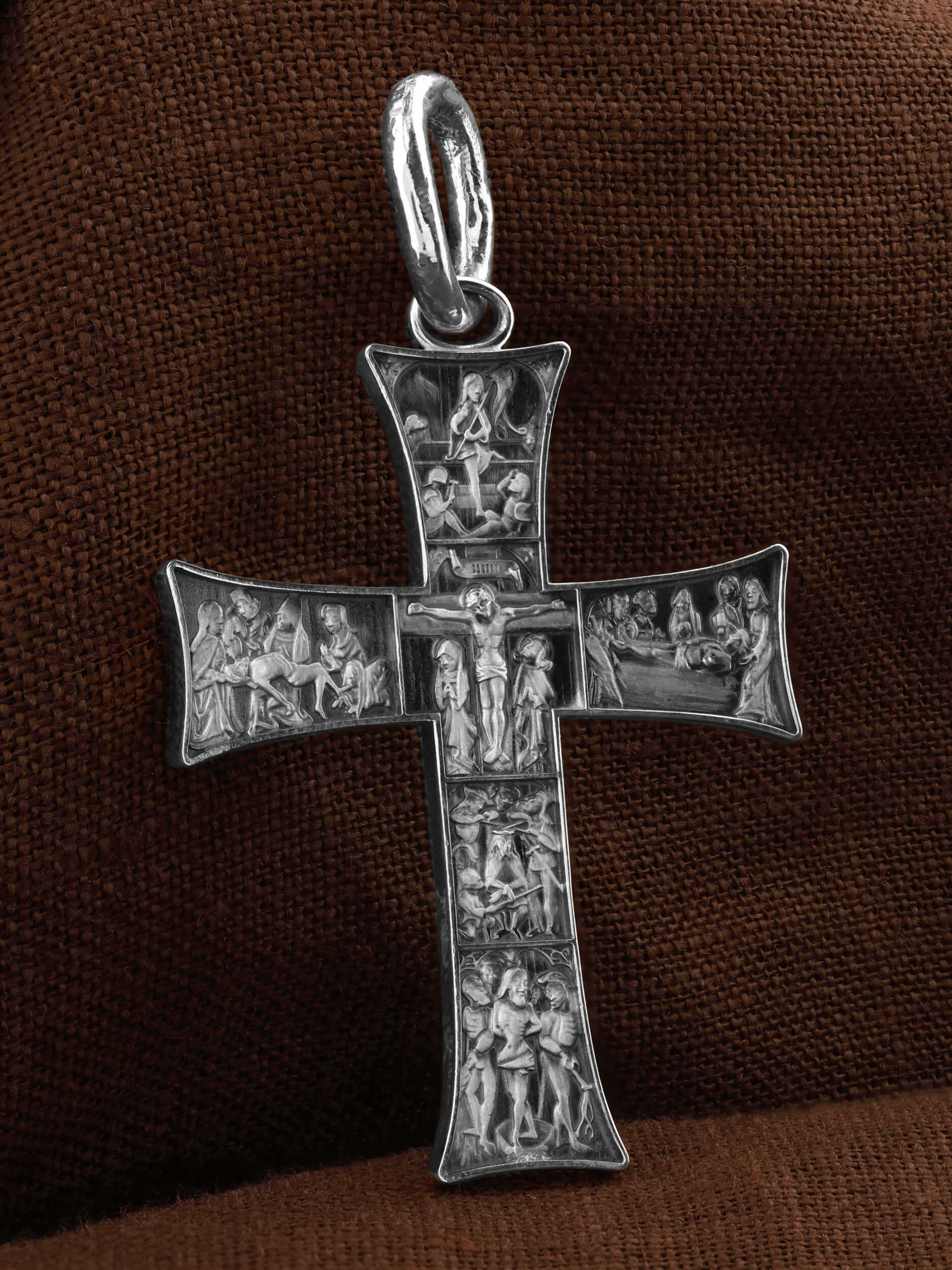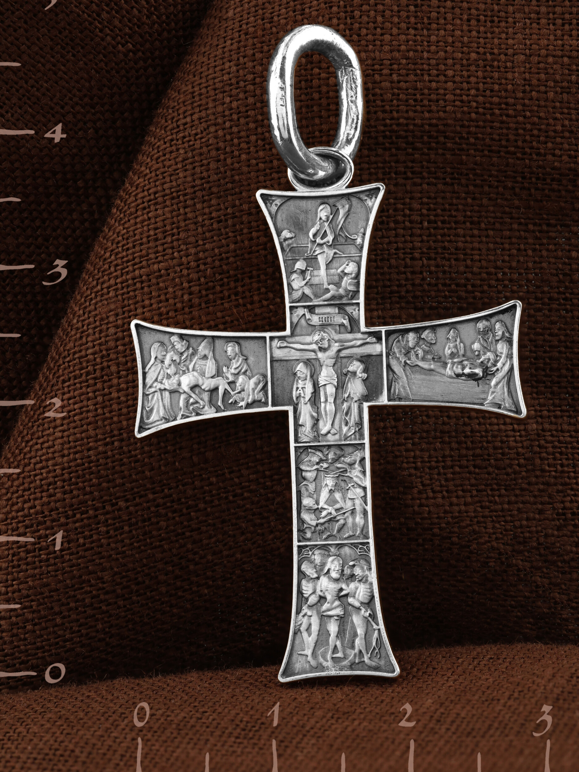 На лицевой стороне креста изображены Крестные Страдания и Воскресение Господа и Спасителя нашего Иисуса Христа. Крест- символ спасения и искупления рода человеческого, знамение победы над смертью и адом. Иисус Христос, как искупительная жертва освобождения человечества от власти греха, умер крестной смертью и в третий день воскрес. В центре креста изображено Распятие Иисуса Христа на Кресте. Ниже — взятие под стражу, а также пытки и мучения Христа перед Распятием. Слева от Распятия изображено снятие Господа с Креста, справа — положение во гроб. Над Распятием отображен образ Воскресшего из гроба Господа и Спасителя нашего Иисуса Христа.