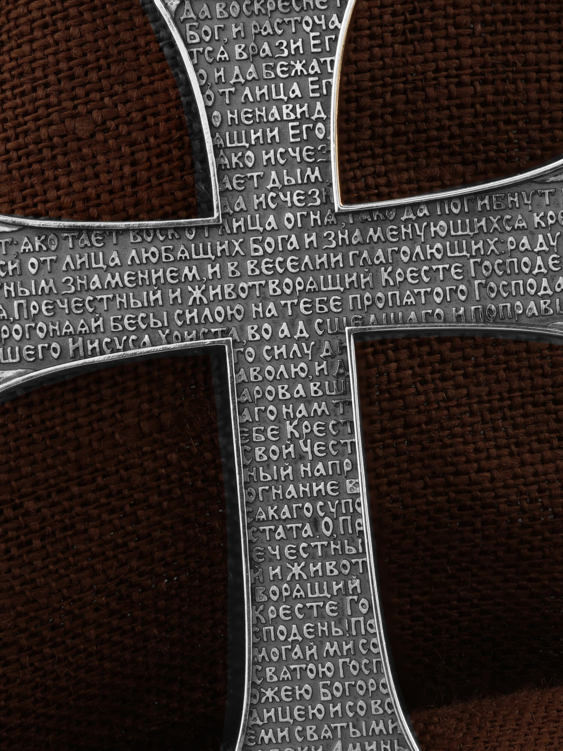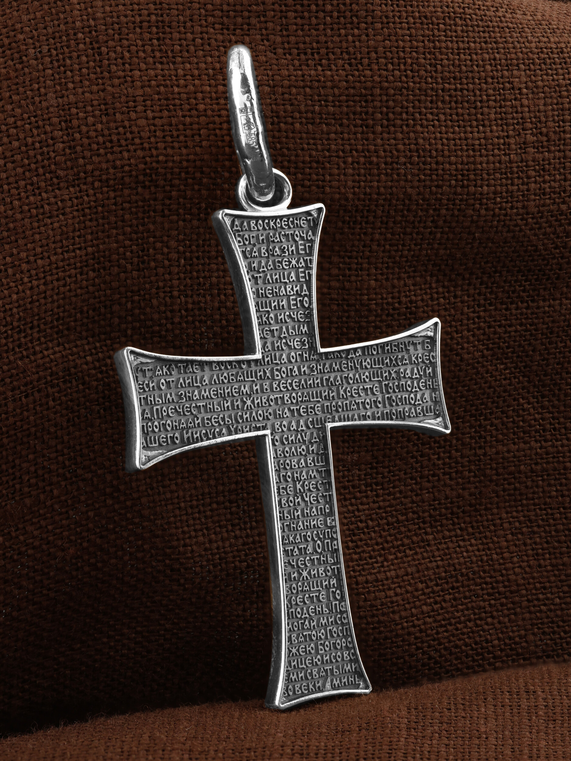 На оборотной стороне креста размещена молитва Честному и Животворящему Кресту Господню: «Да воскреснет Бог, и расточатся врази Его, и да бежат от лица Его ненавидящии Его. Яко исчезает дым, да исчезнут; яко тает воск от лица огня, тако да погибнут беси от лица любящих Бога и знаменующихся крестным знамением, и в веселии глаголющих: радуйся, Пречестный и Животворящий Кресте Господень, прогоняяй бесы силою на тебе пропятаго Господа нашего Иисуса Христа, во ад сшедшаго и поправшаго силу диаволю, и даровавшаго нам тебе Крест Свой Честный на прогнание всякаго супостата. О, Пречестный и Животворящий Кресте Господень! Помогай ми со Святою Госпожею Девою Богородицею и со всеми святыми во веки. Аминь».