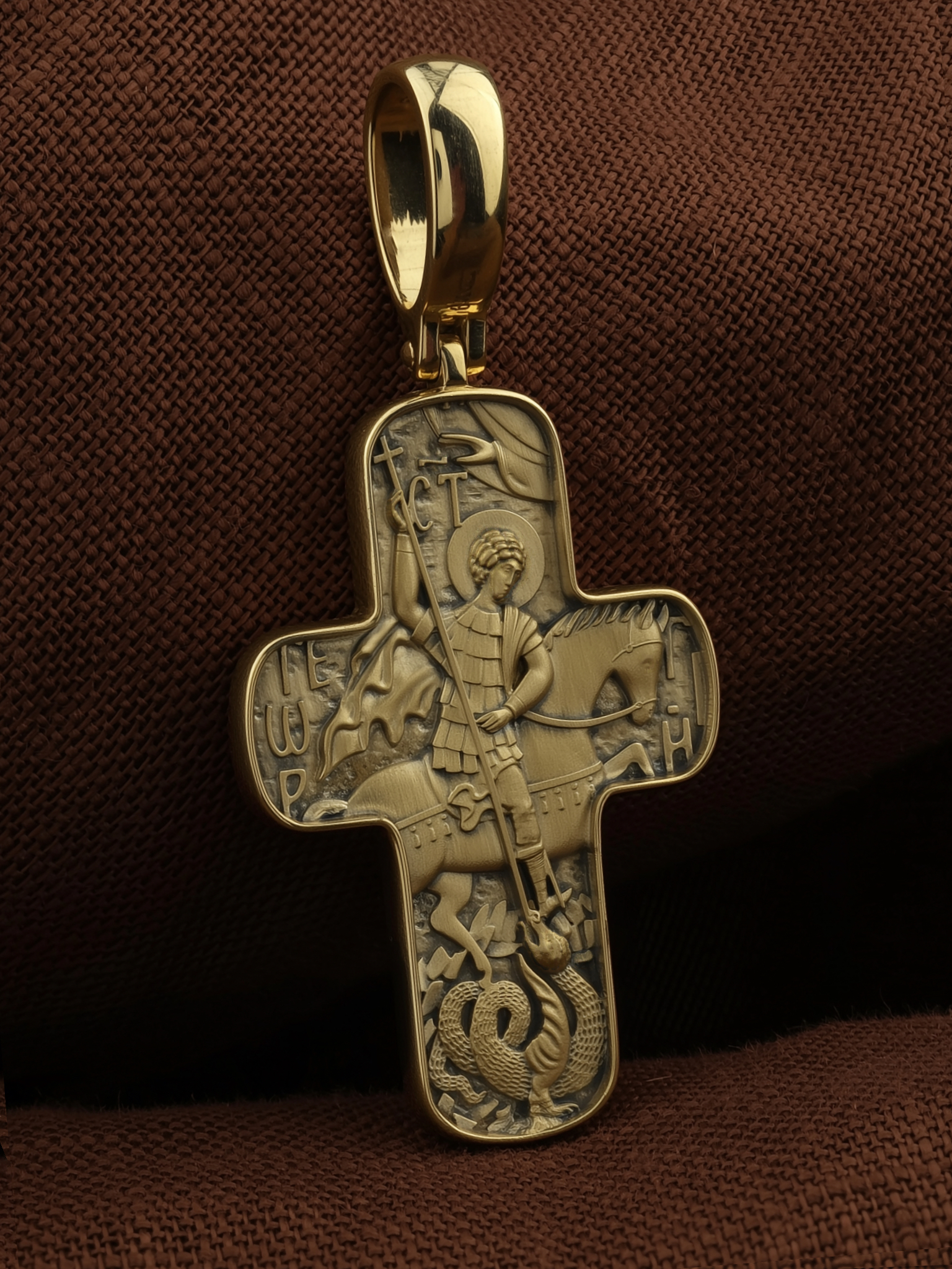 Основой композиции оборотной стороны креста является изображение Святого Великомученика Георгия Победоносца — одного из самых почитаемых и удивительных святых. На Руси он известен как Юрий или Егорий, покровитель воинов, помощник в крестьянском труде. На образке он изображен как воитель, сидящий на коне и поражающий копьем огнедышащего змея. Змей символизирует собою сатанинские силы. Молитвами вознесенными к Всевышнему и своей непреклонной верой он смог одолеть чудовище.. Над образом изображена благословляющая Божия десница.
