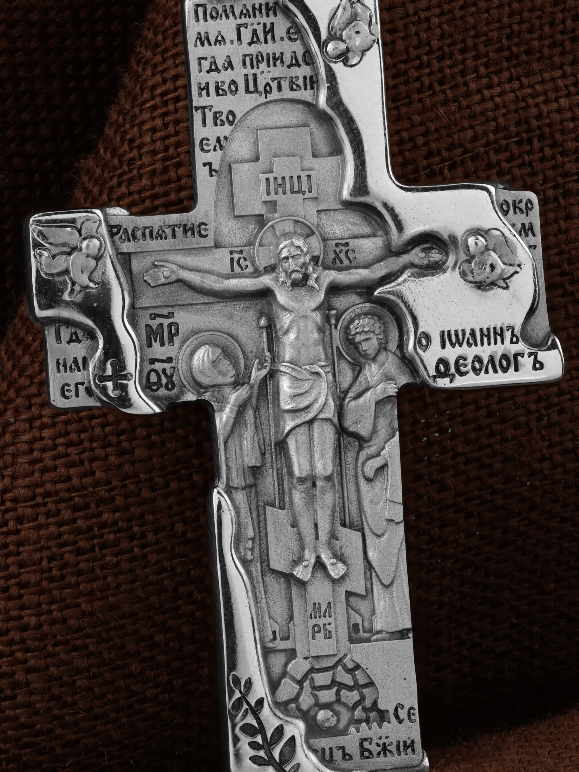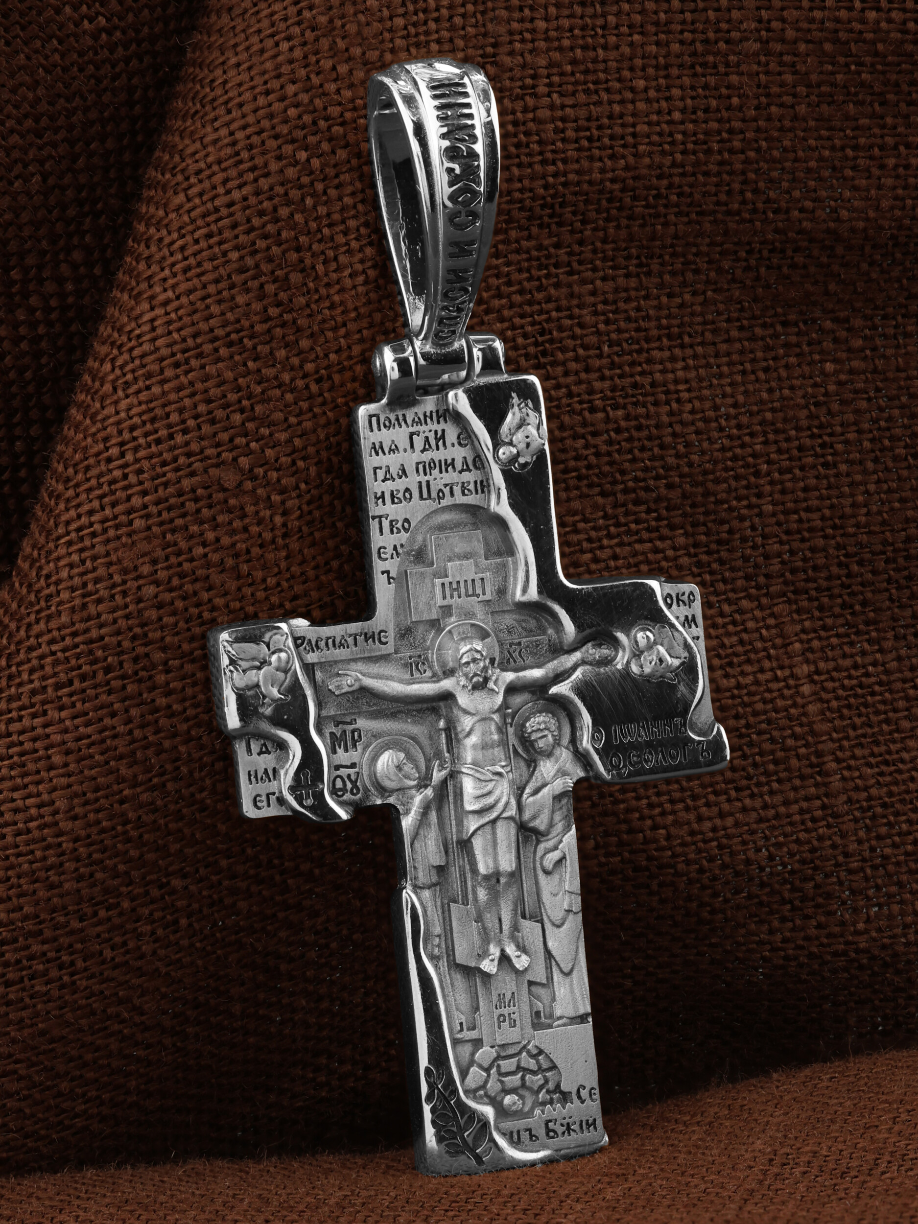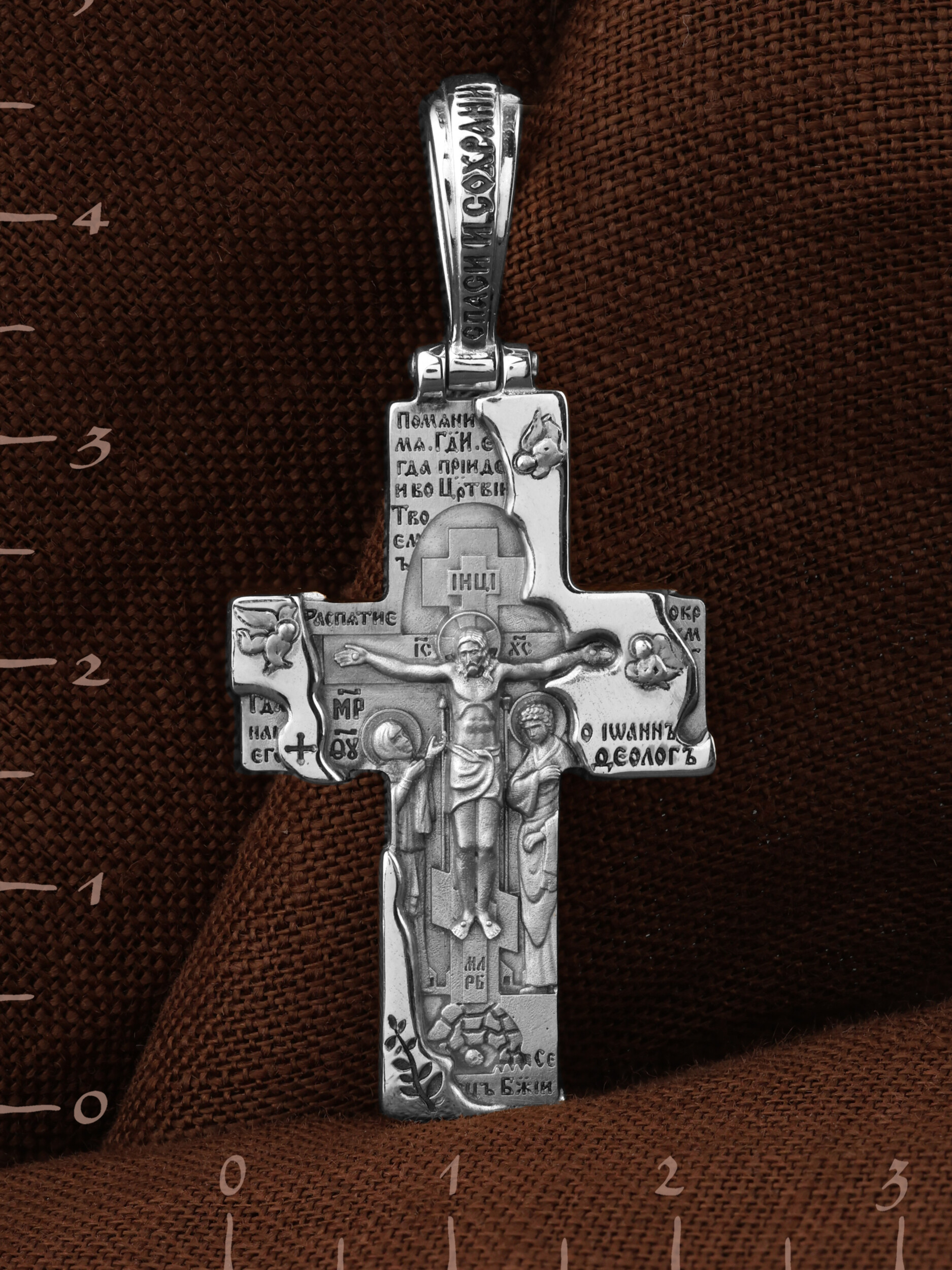 Изделие воплощено художником в архитектурную форму. Под обвалившейся каменной кладкой открывается Распятие Господа и Спасителя нашего Иисуса Христа, отдавшего Себя на смерть, для искупления грехов мира. Крест является символом жертвенной любви Всеблагого Бога к падшим людям, всепобеждающим духовным оружием христиан. Господь сказал: кто хочет идти за Мною, отвергнись себя, и возьми крест свой, и следуй за Мною. (Мк. 8: 34). На верхней табличке, выше головы Иисуса, расположена надпись, составленная Понтием Пилатом — «IНЦI». Она означает «Иисус Назорей, Царь Иудейский». Надпись «IС» « ХС» означает Иисус Христос и помещается на разных сторонах поперечной (большой) перекладины креста. Слева от Распятия изображена Пресвятая Богородица, справа — апостол и евангелист Иоанн Богослов, один из ближайших учеников Иисуса Христа. Справа и слева изображены преклоняющиеся Ангелы. Крест стоит на горе камней, символизирующих Голгофу. В ее основании различается череп — это голова Адама. Вдоль креста изображены копие сотника Лонгина и трость с губкой. Надпись «МЛРБ» — «место лобное рай бысть» означает, что место лобное стало раем и помещаются в нижней части креста. Над Распятием размещены слова, сказанные благоразумным разбойником: «Помяни мя, Господи, егда приидеши во Царствии Твоем». (Лк. 23:42), ниже — слова Иоанна Предтечи — «Се, Агнец Божий, вземляй грехи мира» (Ин. 1:29). На кулонном кольце размещена надпись: «Во имя Отца и Сына и Святаго Духа».