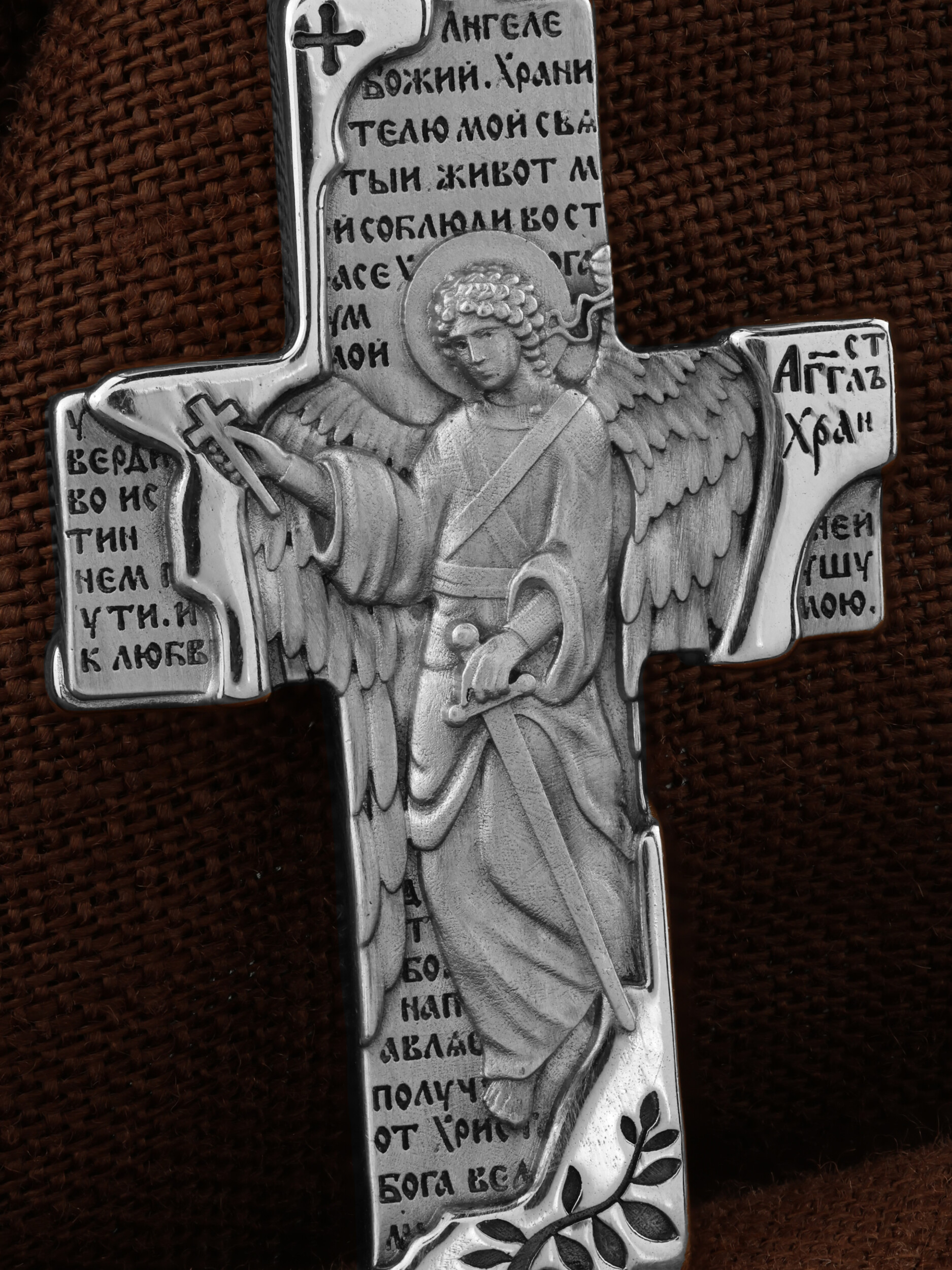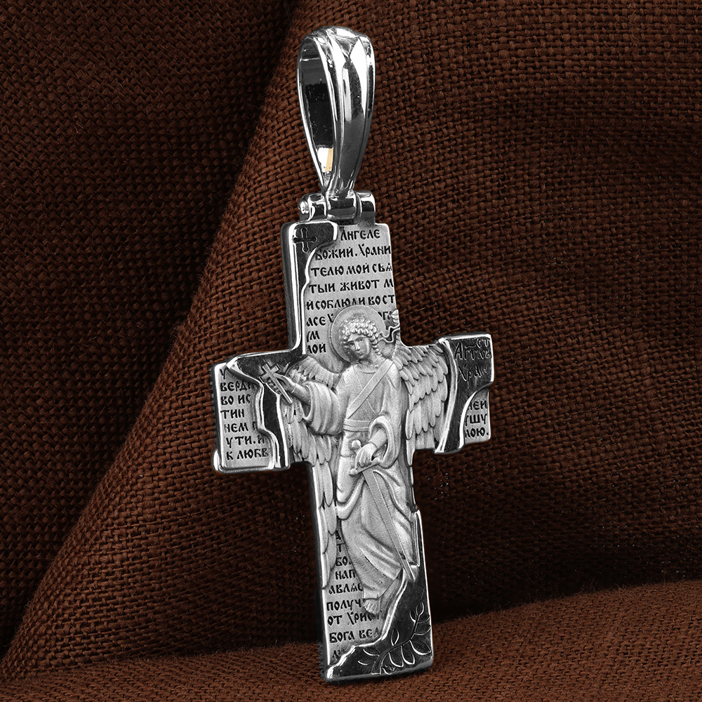 На оборотной стороне креста изображен Святой Ангел-Хранитель в виде прекрасного, светозарного юноши держащего в правой руке крест, а в левой — мечь. Ангел-Хранитель — это Ангел приставляемый Богом к человеку при крещении для охраны и помощи в добрых делах. Рядом с изображением размещена молитва: «Ангеле Божий, хранителю мой святый, живот мой соблюди во страсе Христа Бога, ум мой утверди во истиннем пути, и к любви горней уязви душу мою, да тобою направляем, получу от Христа Бога велию милость».