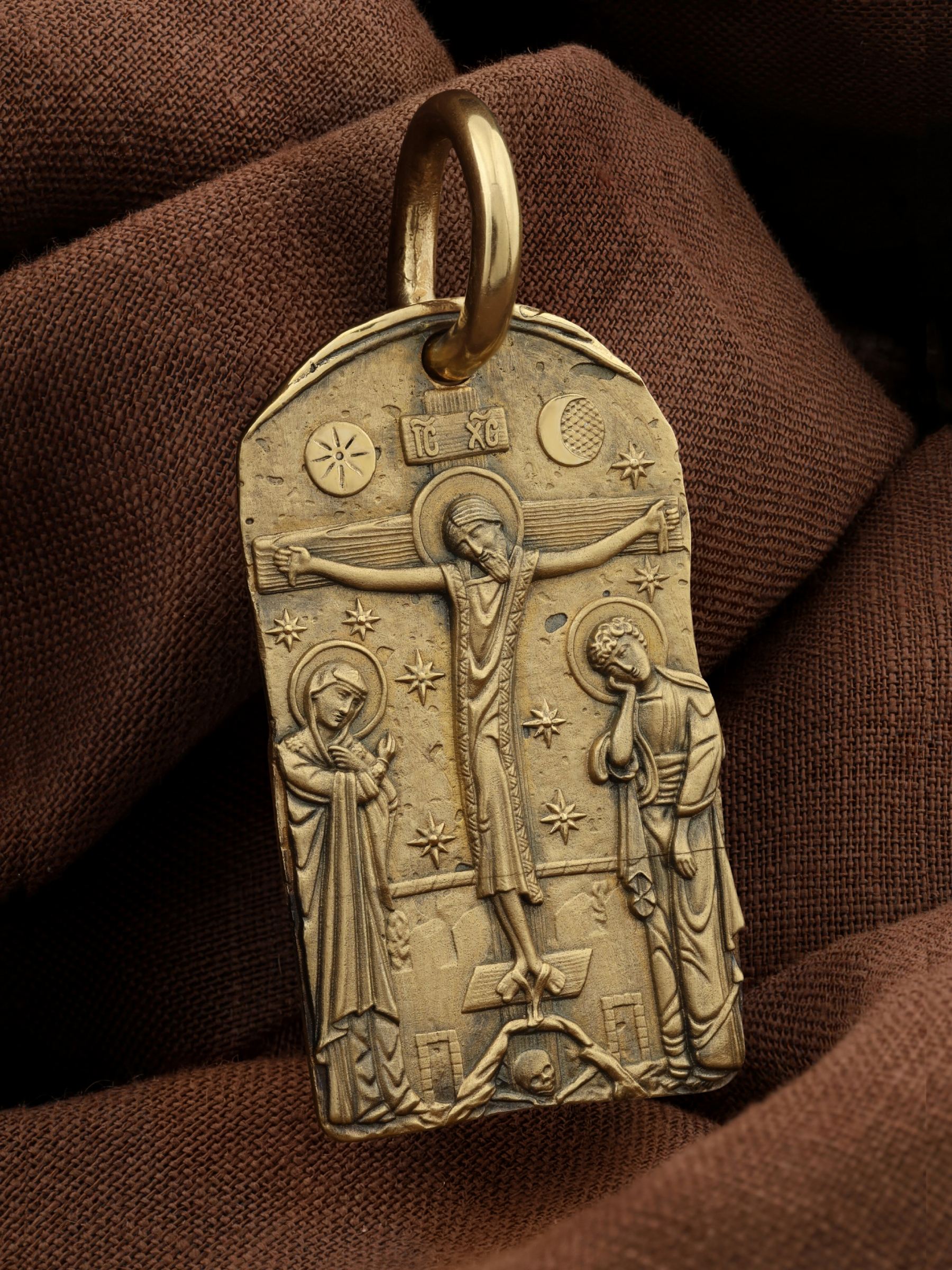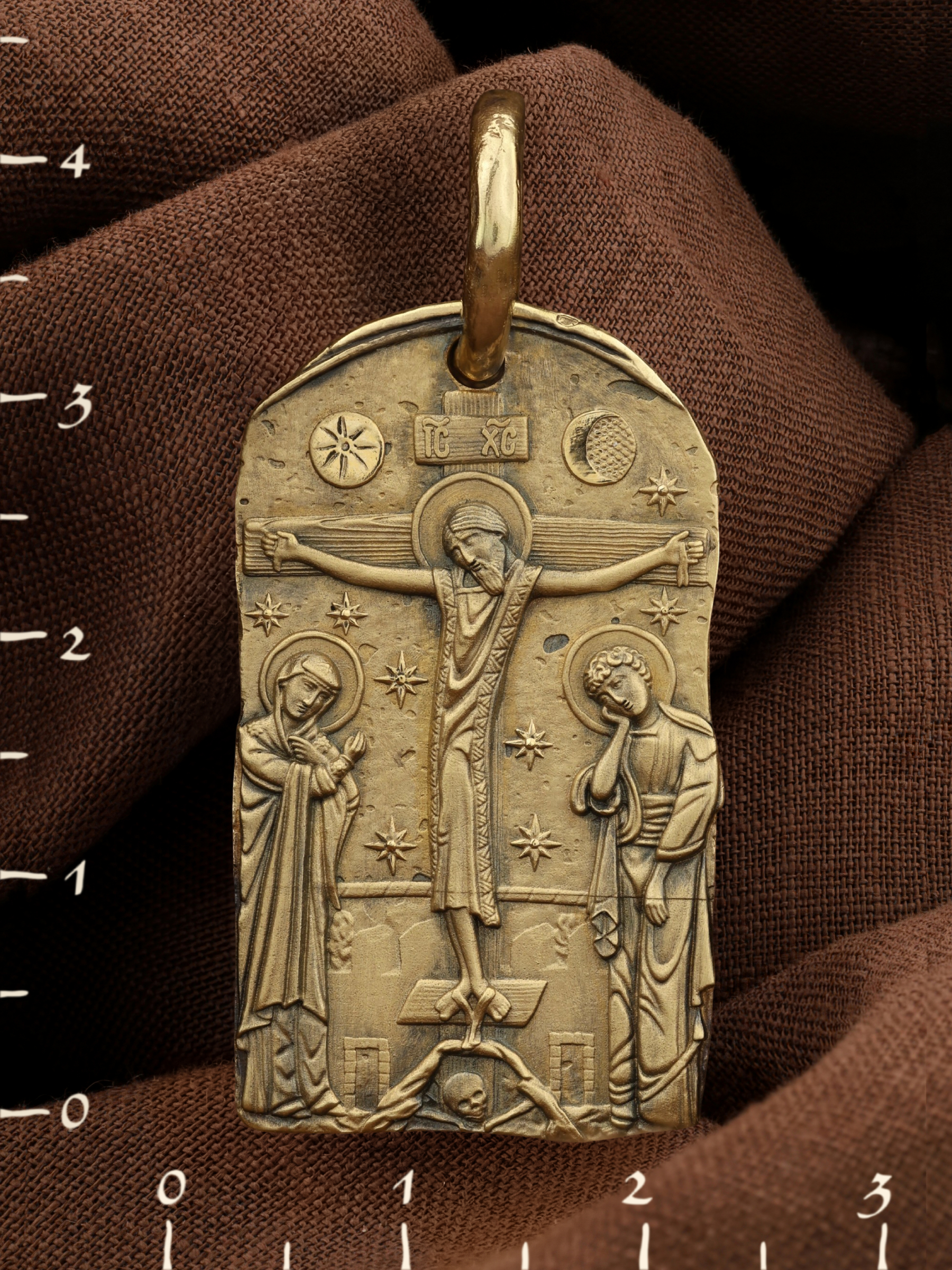 На лицевой стороне образка изображено Распятие Господа и Спасителя нашего Иисуса Христа. Своими крестными страданиями Господь смыл наши грехи, покрыл наш долг перед Богом. В Голгофе сокрыта непостижимая тайна бесконечной правды и любви Бога. Крест стал символом победы добра над злом, жизни над смертью, напоминанием бесконечной Божьей любви, предметом радости. Воплотившийся Сын Божий Своею кровью освятил крест и сделал его проводником Своей благодати, источником освящения верующих. На верхней табличке, выше головы Иисуса, написано сокращенно имя Спасителя «IC» «XC» — Иисус Христос. Слева от Распятия стоят оплакивающие Господа Пресвятая Богородица, справа — апостол и евангелист Иоанн Богослов, один из ближайших учеников Иисуса Христа. По преданию, увидя, что они горько плачут, Иисус сказал Матери Своей: «Жено! Се сын Твой!» Потом сказал ученику Иоанну: «Се мати твоя». С этого времени Иоанн взял Матерь Божию к себе, и Она жила в его доме до самой смерти.