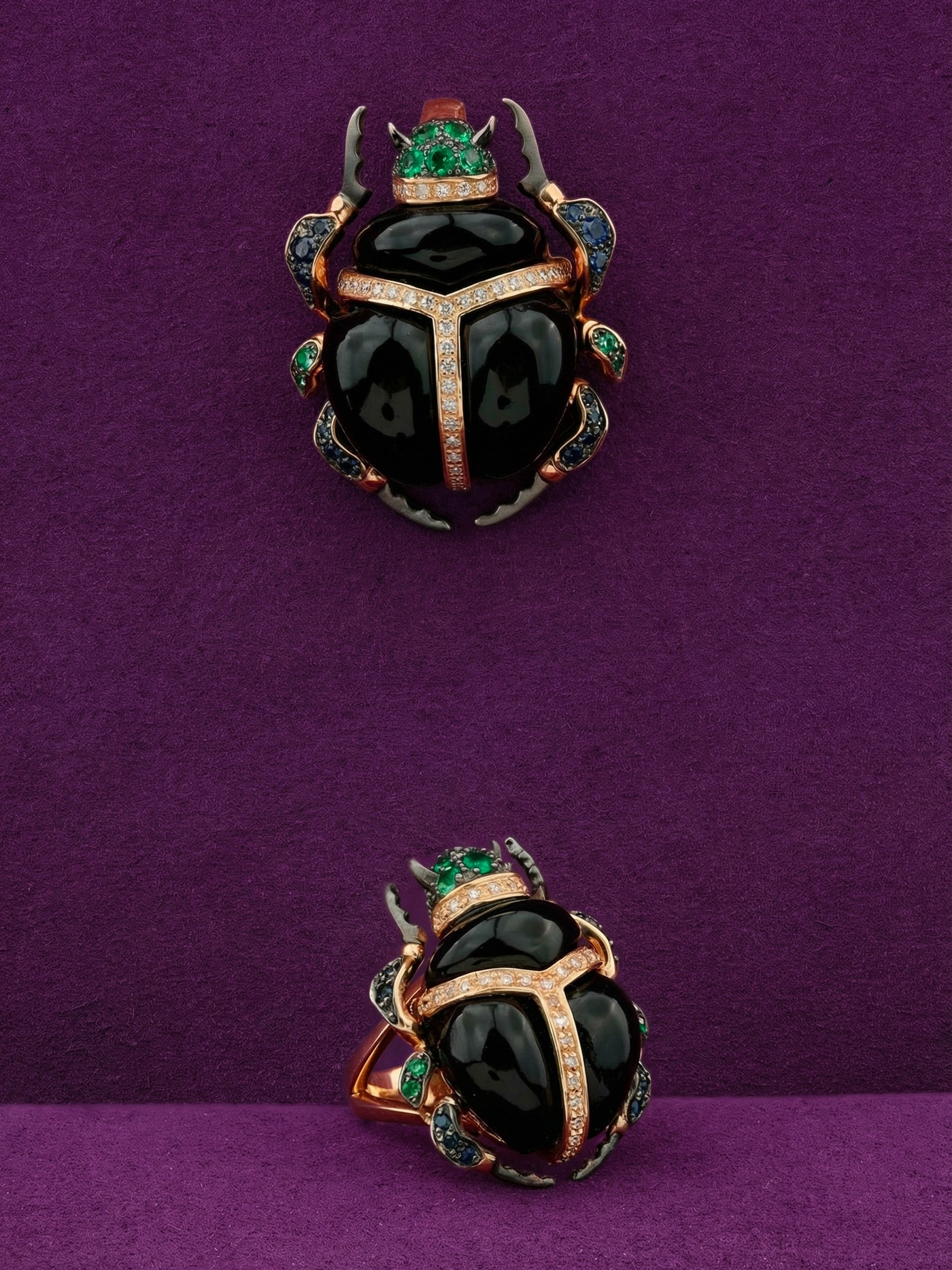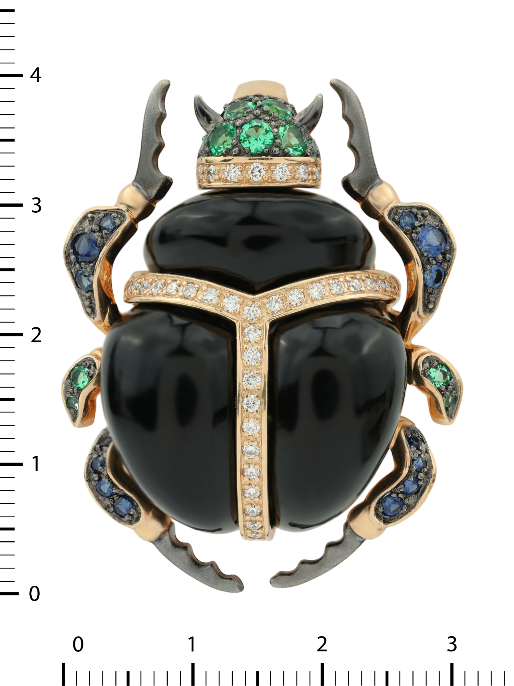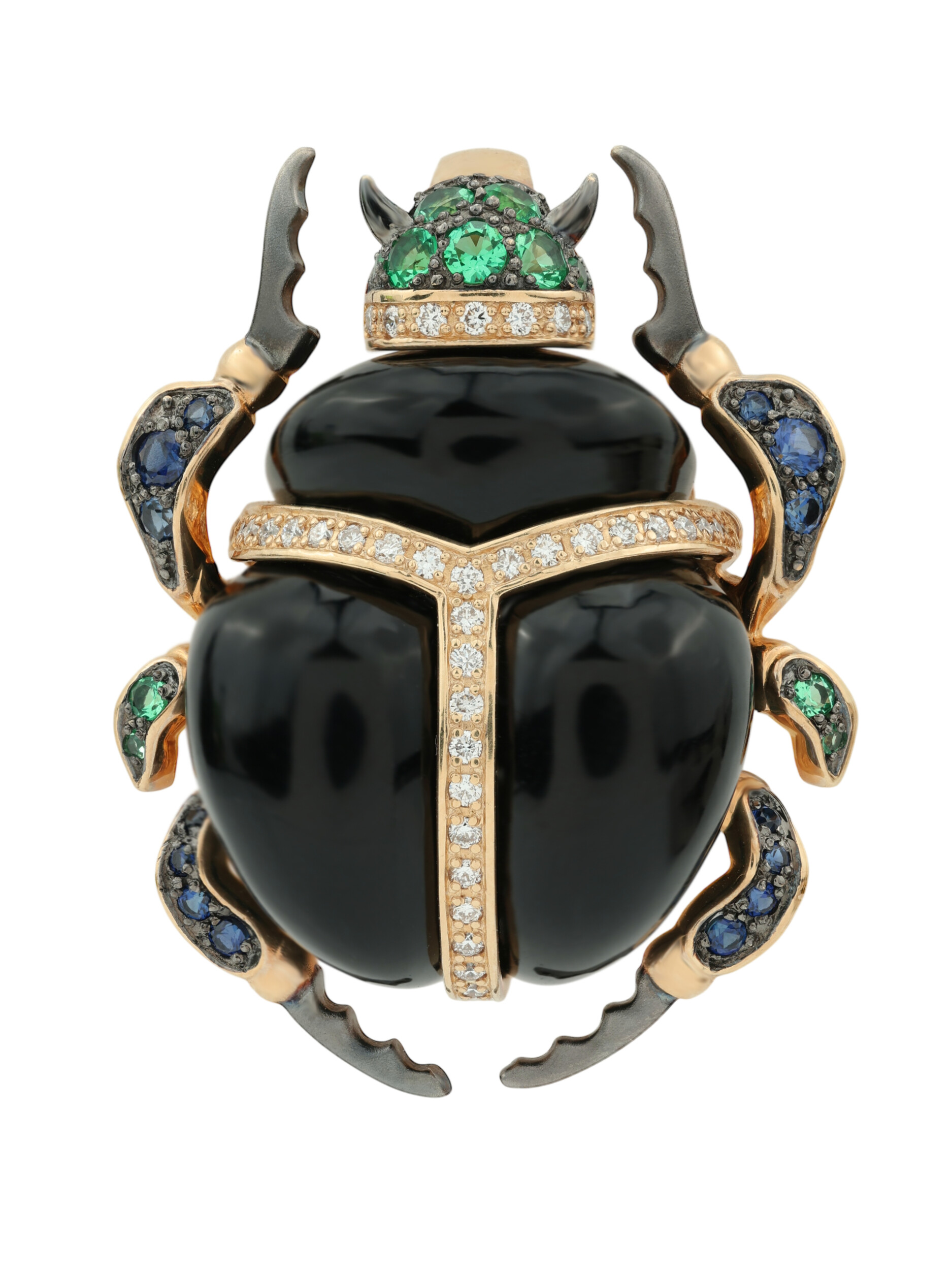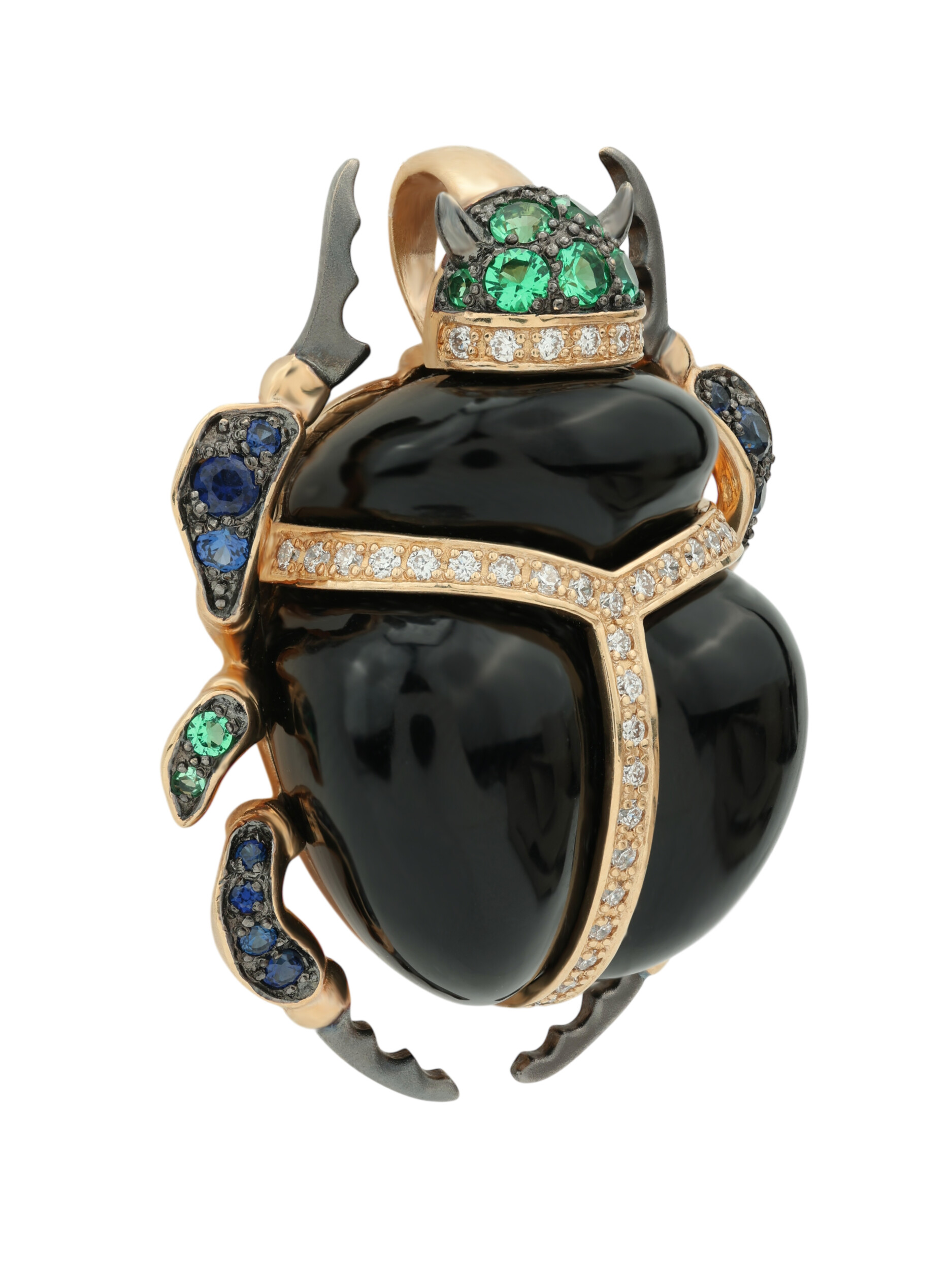 Основой изделия служит качественное красное золото 585 пробы, которое придает украшению теплый благородный отблеск. Главный акцент композиции — глубокий черный оникс, чья гладкая поверхность гармонично контрастирует с блеском драгоценных камней. Всего в подвеске использовано 67 вставок круглой формы, создающих сложную и многогранную игру света. Композиция инкрустирована сверкающими белыми бриллиантами, ярко-зелеными изумрудами и насыщенными синими сапфирами, которые подчеркивают эксклюзивный характер изделия.