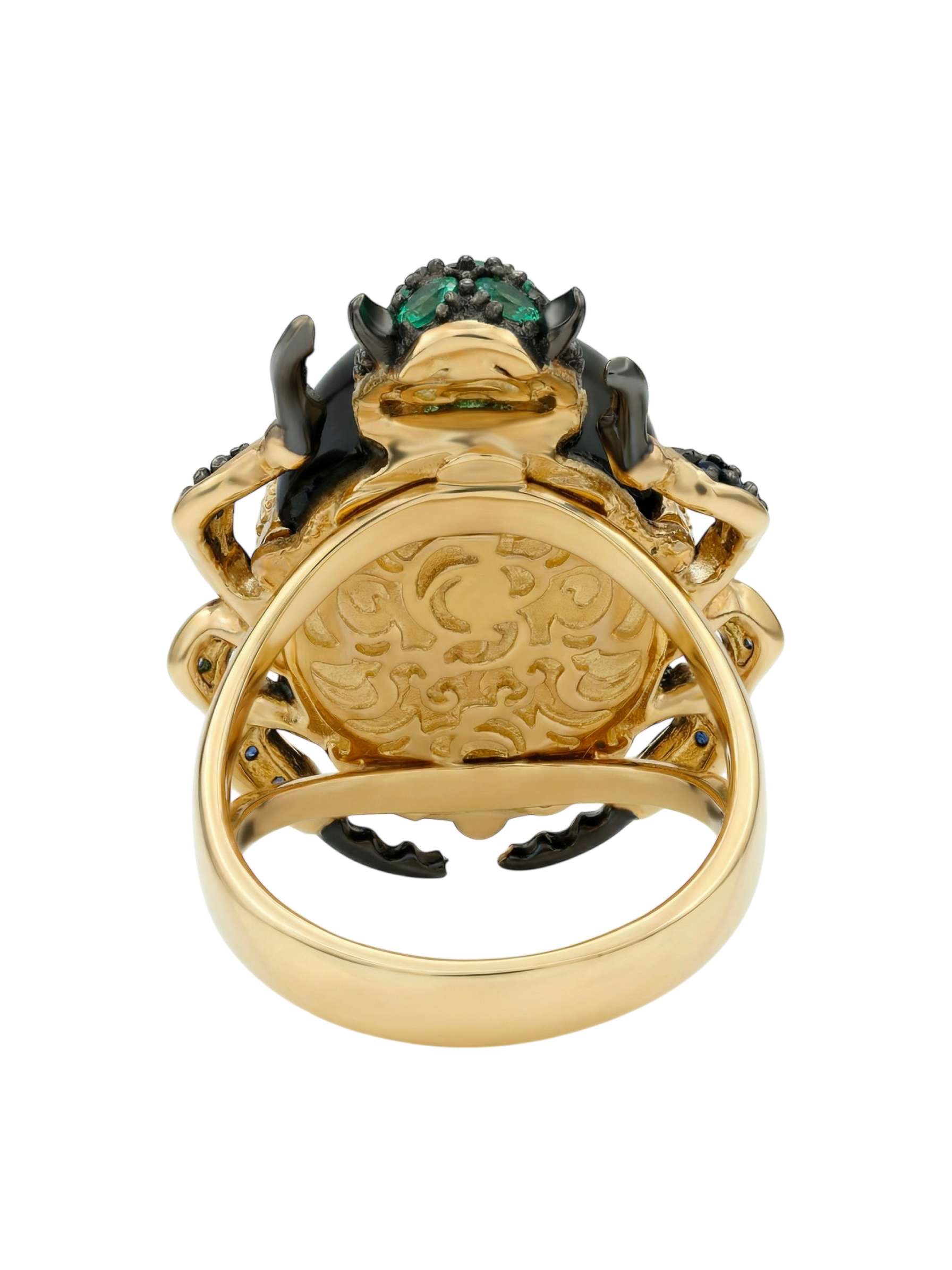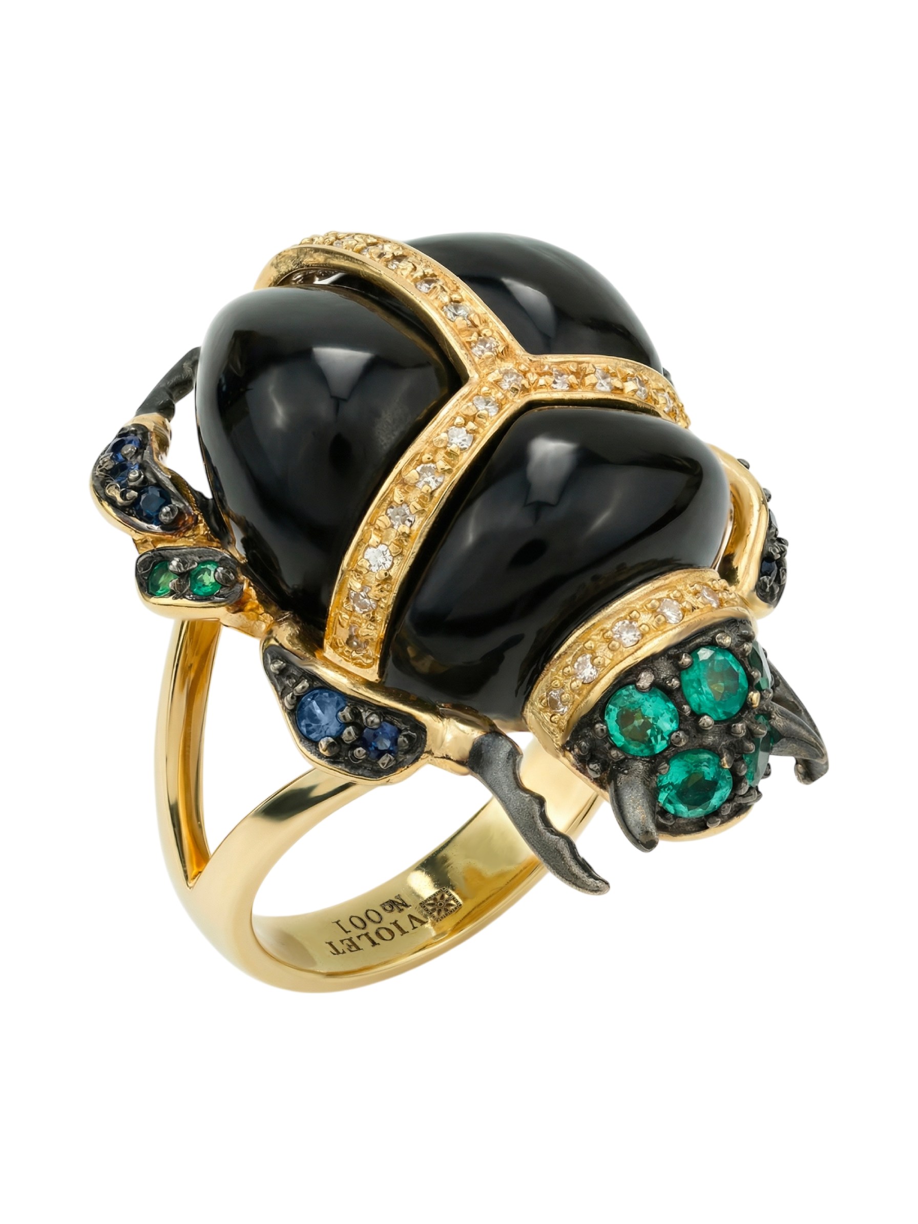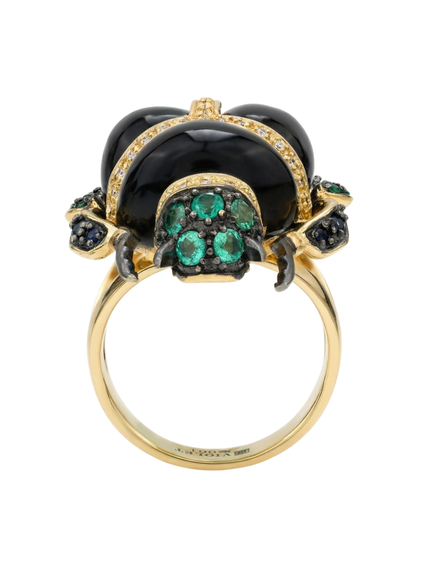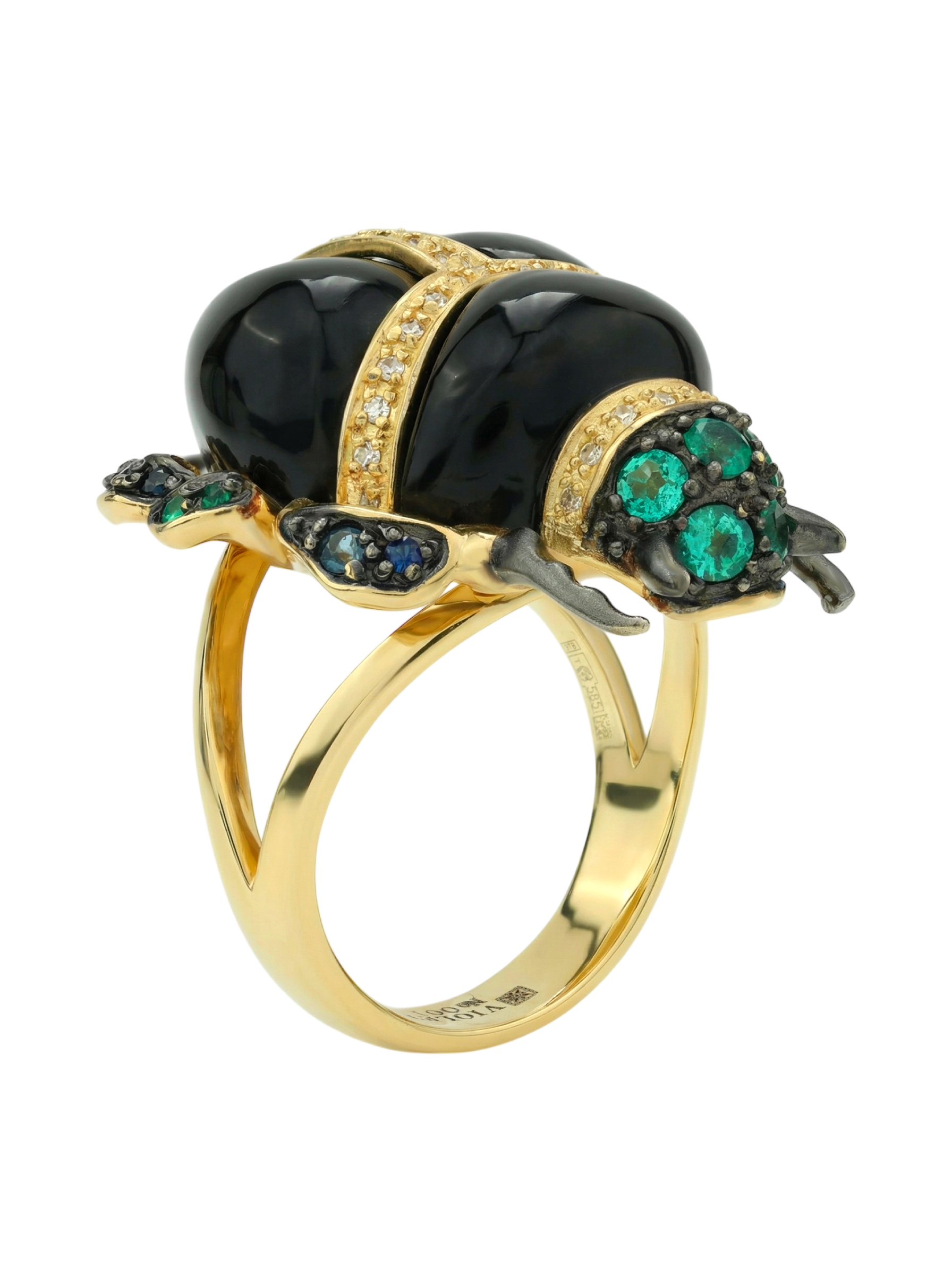 Роскошная композиция дополнена 54 вставками круглой огранки, создающими богатую цветовую палитру. Глубокий блеск черного оникса гармонично сочетается с насыщенными зелеными изумрудами и синими сапфирами, а белые бриллианты добавляют изделию благородного сияния. Лимонный оттенок золота эффектно подчеркивает красоту каждой вставки.