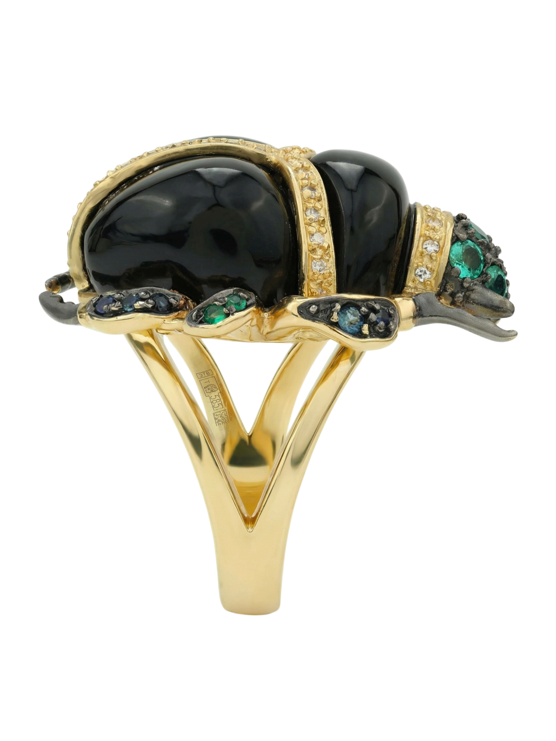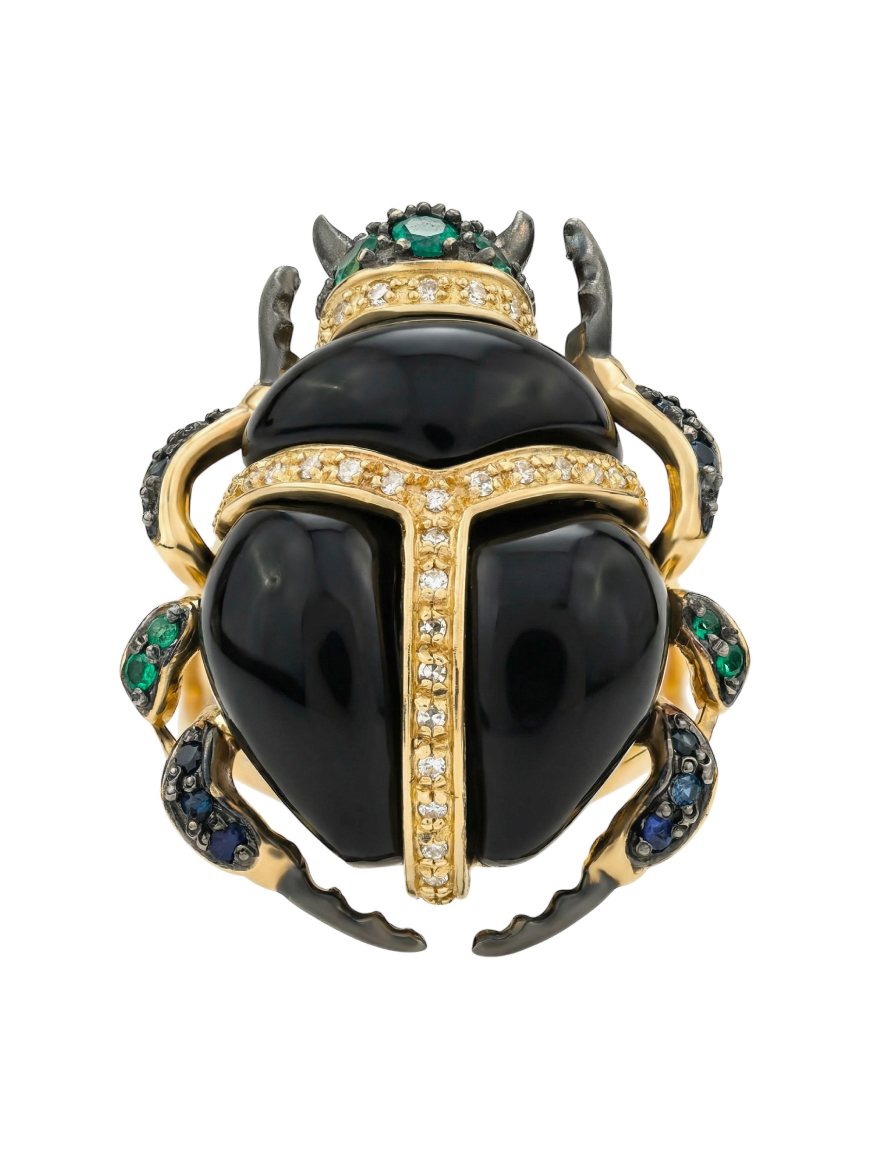 Кольцо из лимонного золота c бриллиантами, сапфиром, изумрудом и ониксом