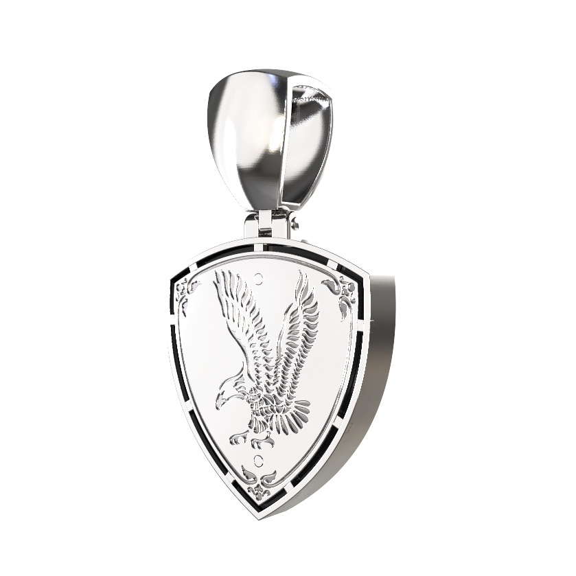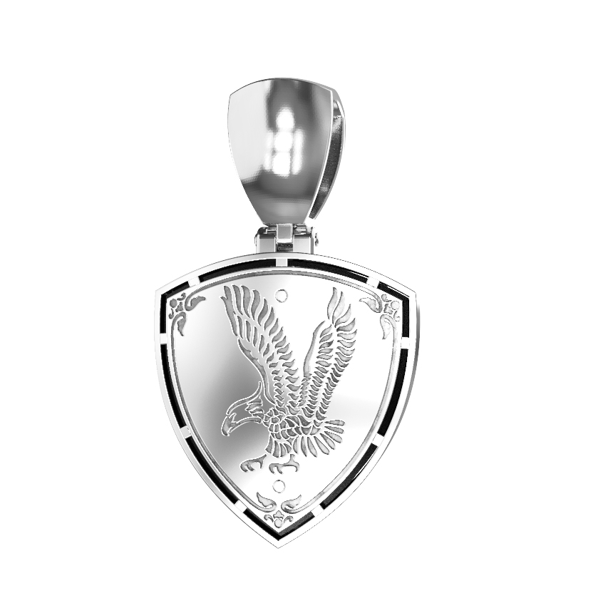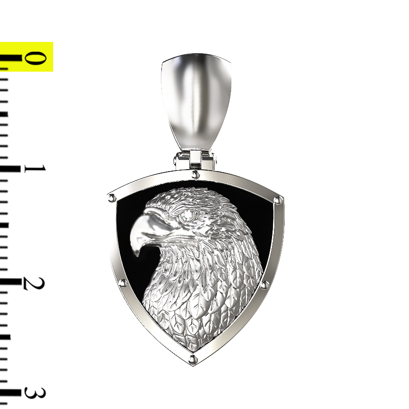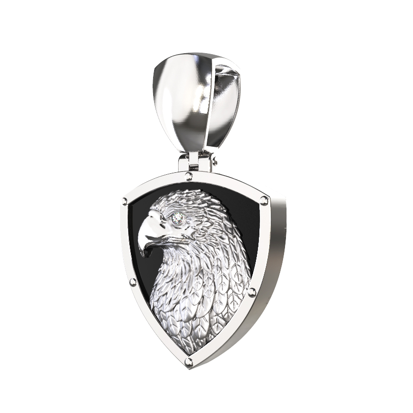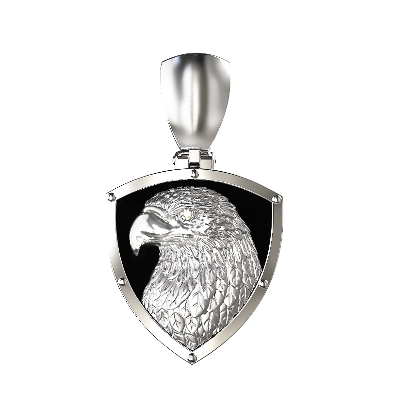 Ювелирная композиция дополнена вставкой из круглого бриллианта, который придает изделию благородное сияние и подчеркивает премиальный статус украшения. Контрастное сочетание белого цвета золотого корпуса и черного оникса делает подвеску универсальным аксессуаром, который идеально дополнит как женский, так и мужской образ. Лаконичная форма щита, на котором запечатлен профиль птицы, делает дизайн строгим и мужественным, подходящим для тех, кто ценит символичные украшения со смыслом.