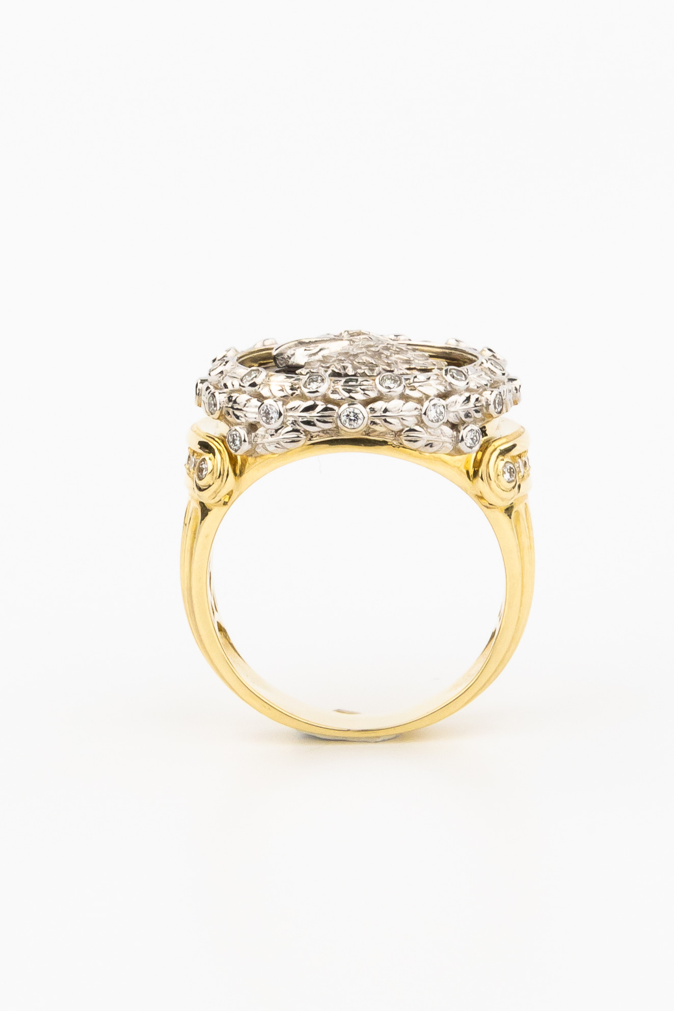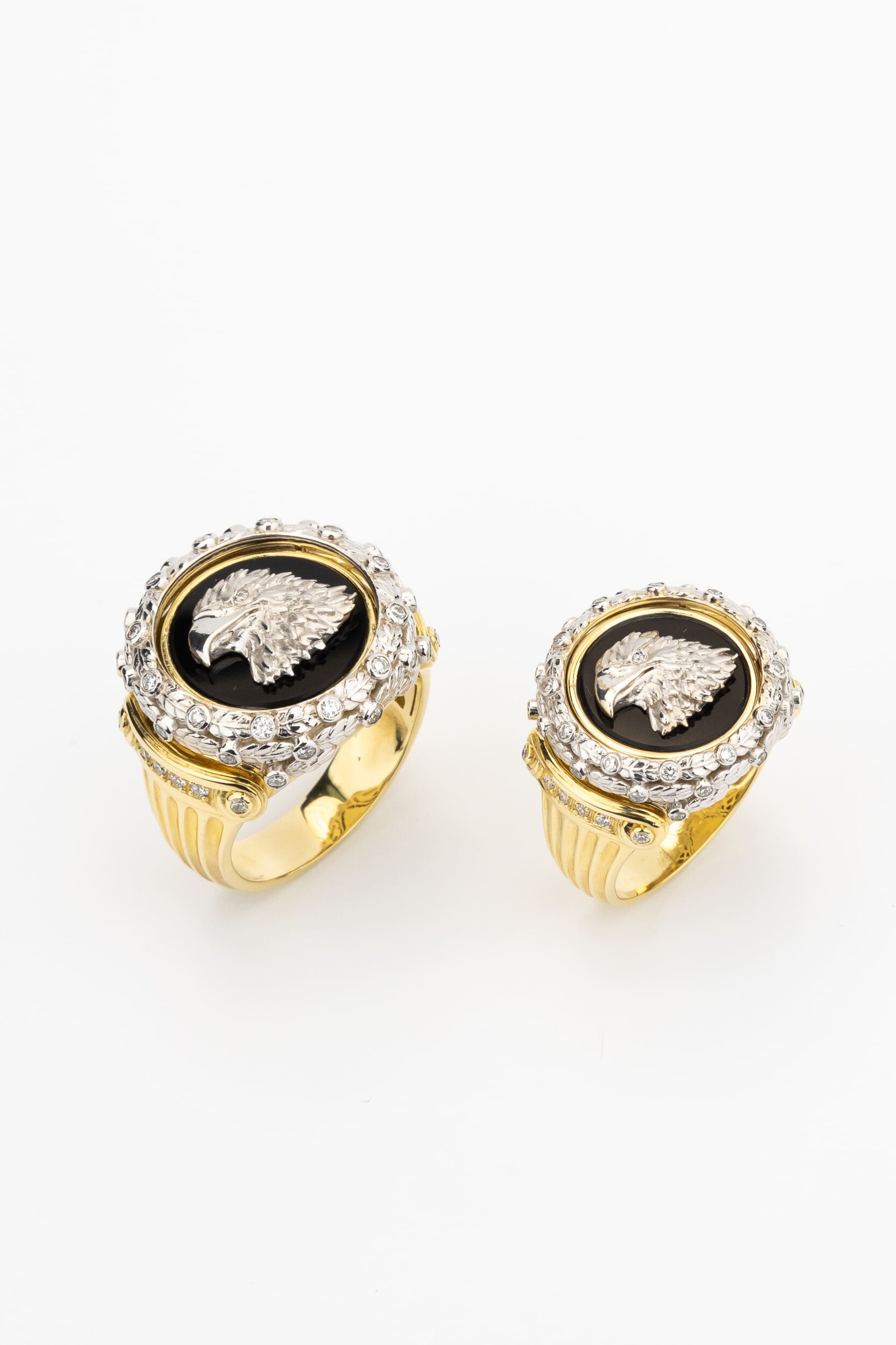 Контрастное сочетание материалов придает украшению особую глубину: насыщенный черный оникс служит эффектным фоном для фигуры птицы, создавая неповторимую игру цвета. Оформление дополнено 42 сверкающими бриллиантами круглой огранки белого цвета, которые изящно обрамляют композицию, подчеркивая блеск и сияние лимонного золота. Тщательная проработка деталей делает это кольцо настоящим произведением ювелирного искусства.