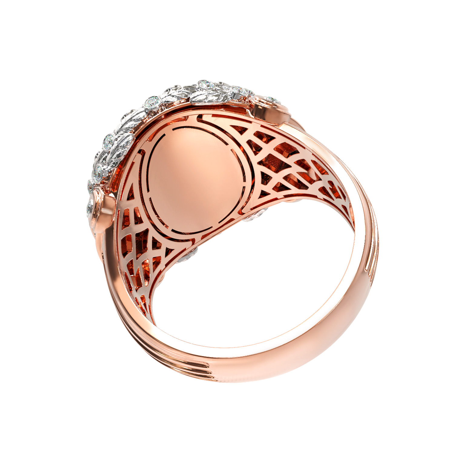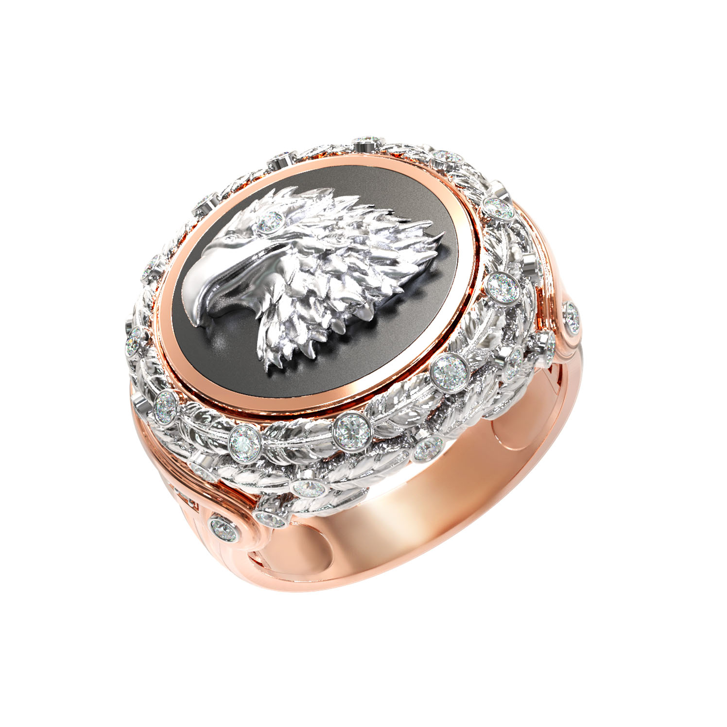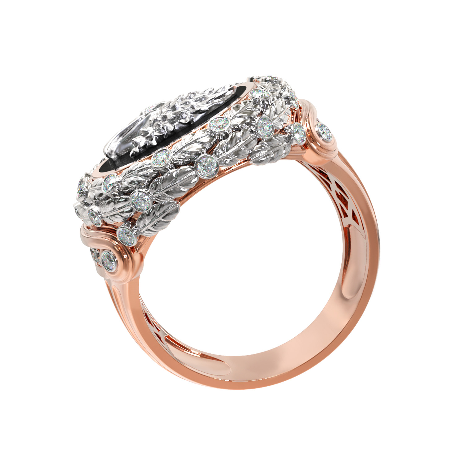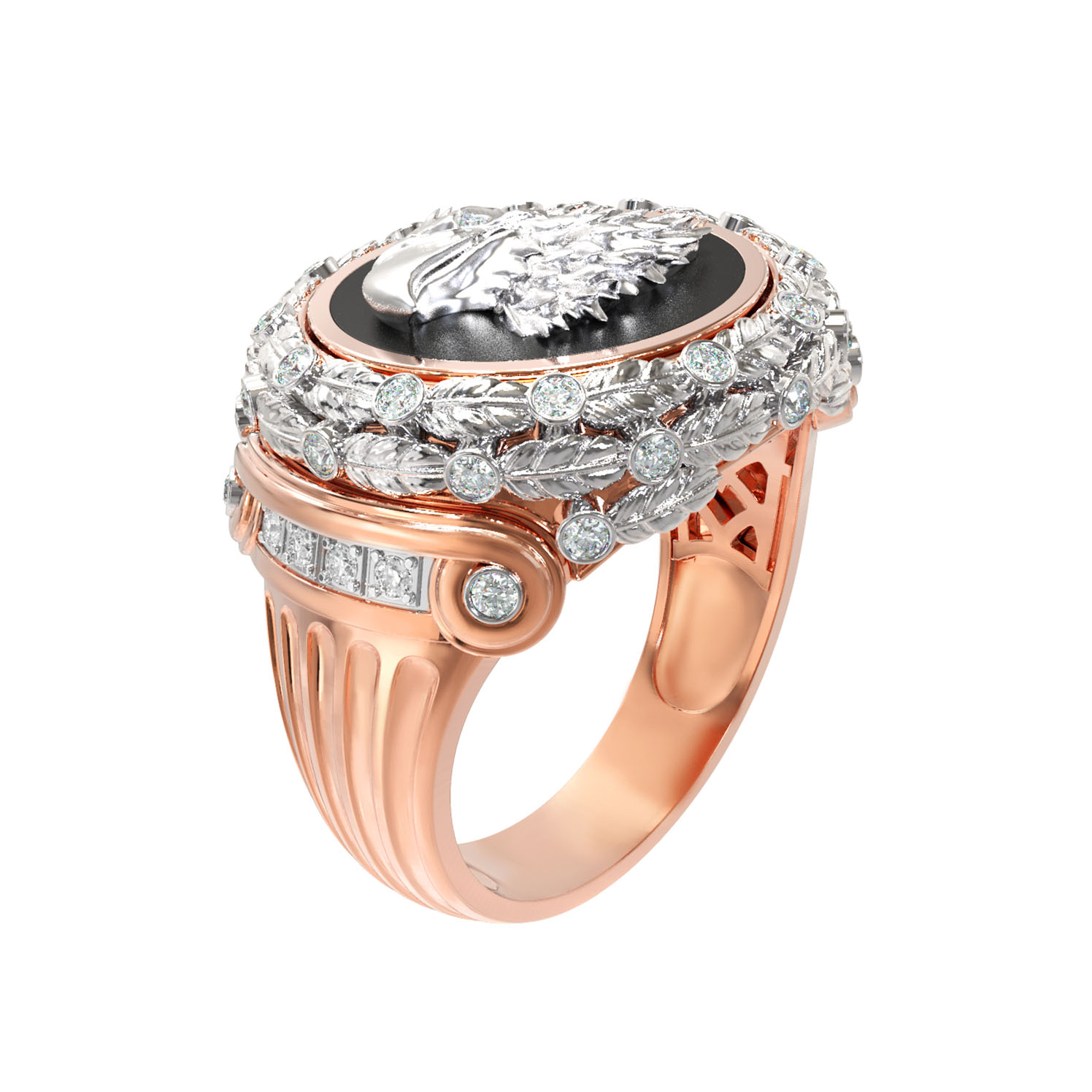 Роскошный блеск оправе придают 42 бриллианта круглой формы огранки с белым цветом вставок. Их яркое сияние эффектно контрастирует с благородным красноватым оттенком золота и темной глубиной оникса, создавая завершенный и гармоничный образ. Профессиональная проработка деталей делает это кольцо достойным дополнением коллекции статусных украшений.