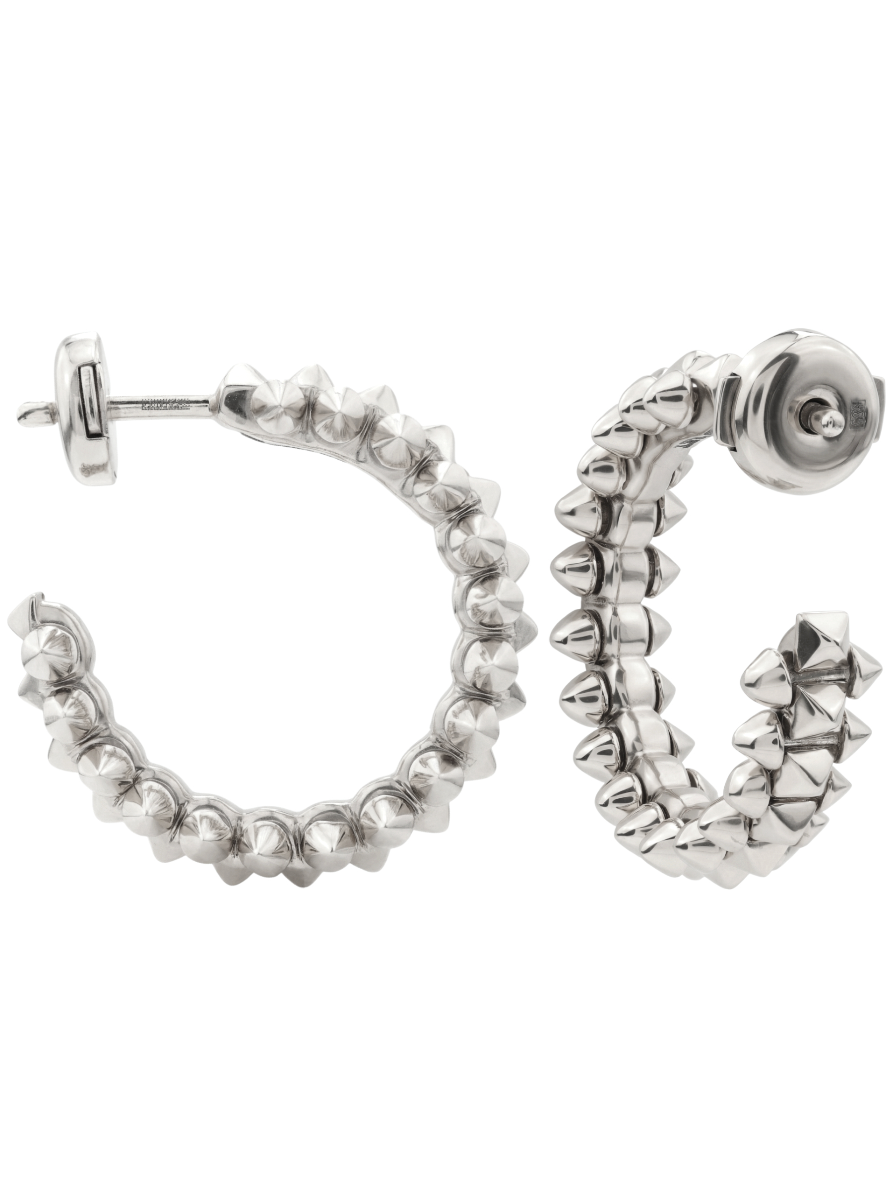 Серьги выполнены из белого золота 585 пробы, что обеспечивает долговечность и благородный холодный блеск материала. Лаконичная форма подчеркивается качественной полировкой, благодаря которой каждый шип эффектно отражает свет. Это универсальное украшение, которое подходит как для женщин, так и для мужчин, позволяя создавать стильные и современные образы. За счет своей эстетики изделие может стать ярким акцентом в повседневном гардеробе или дополнить вечерний выход.