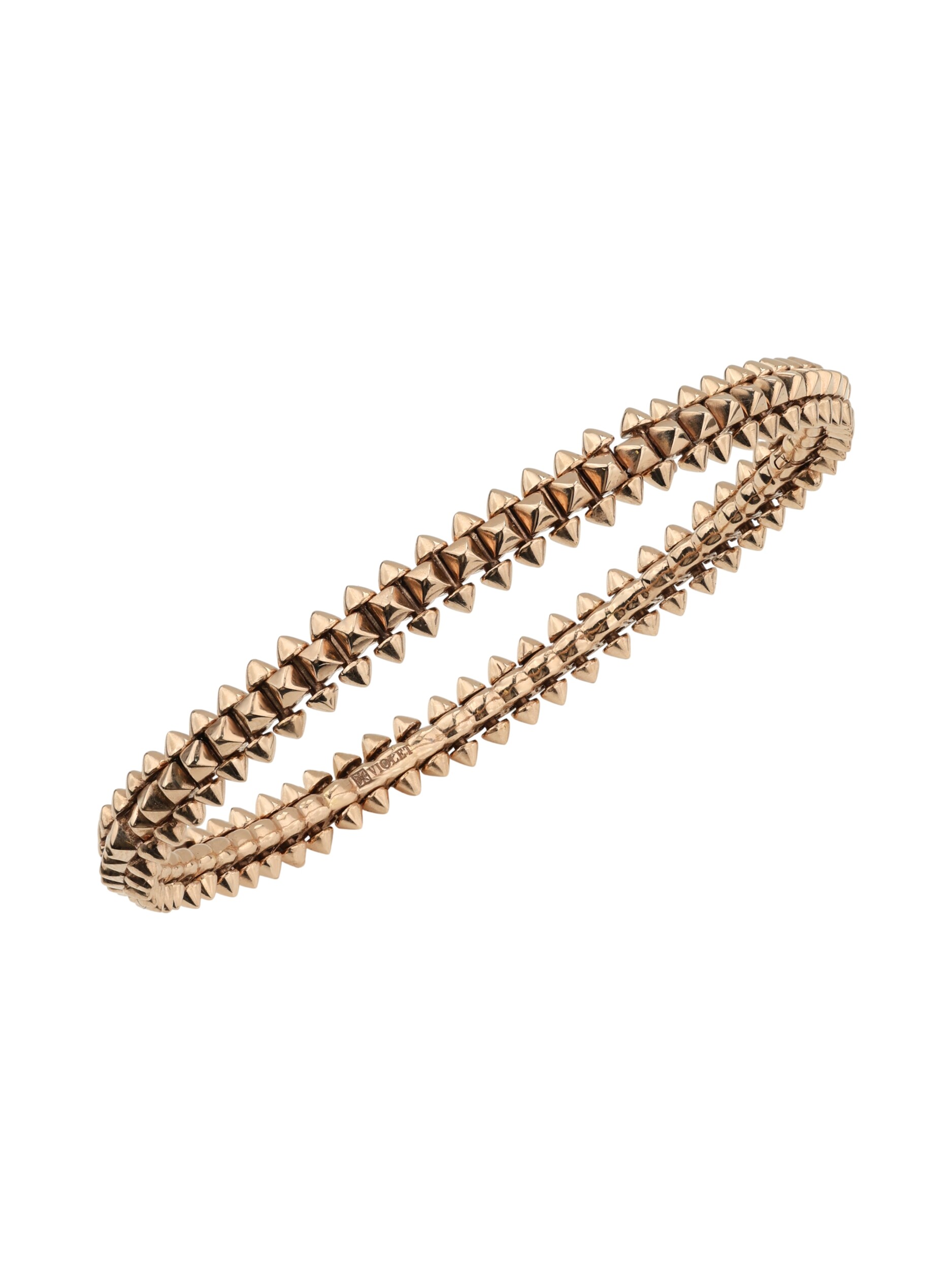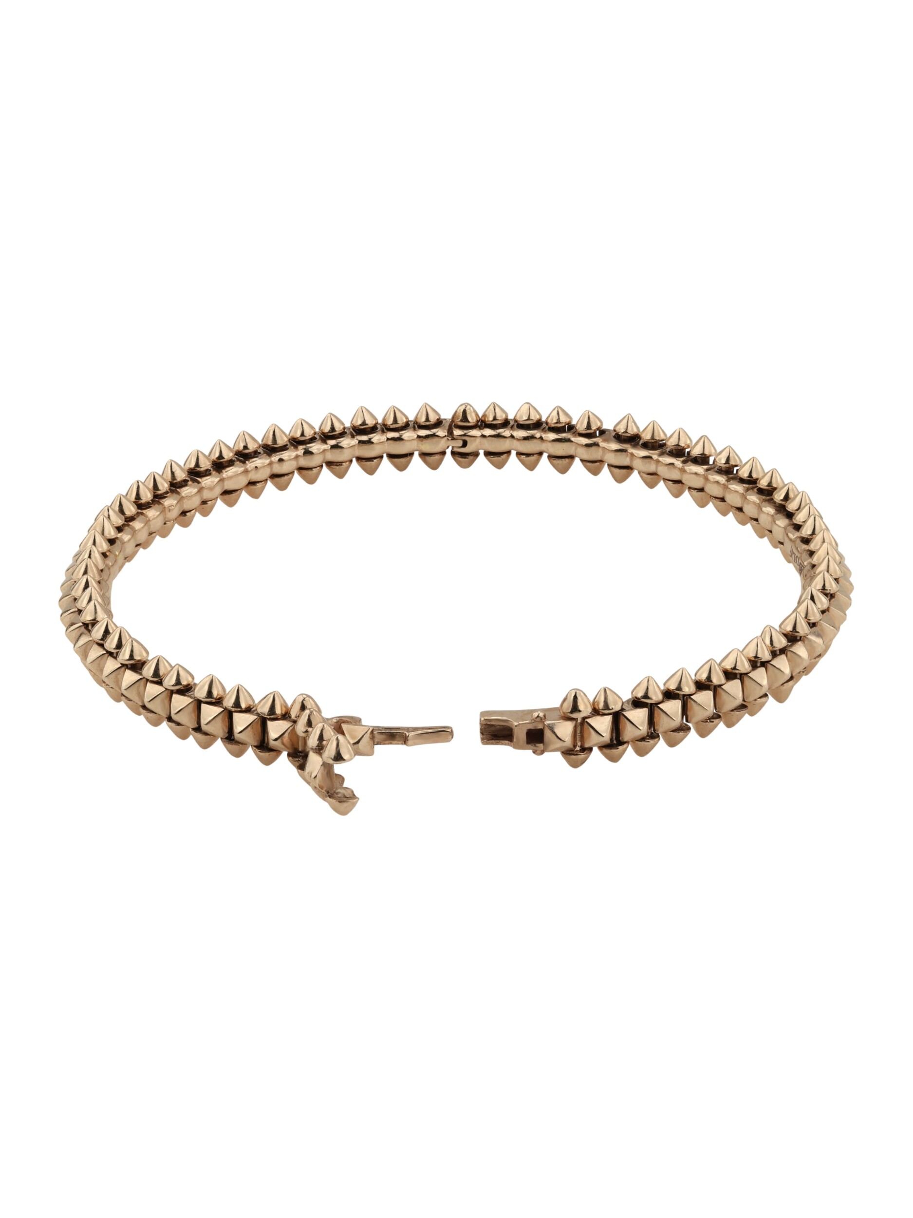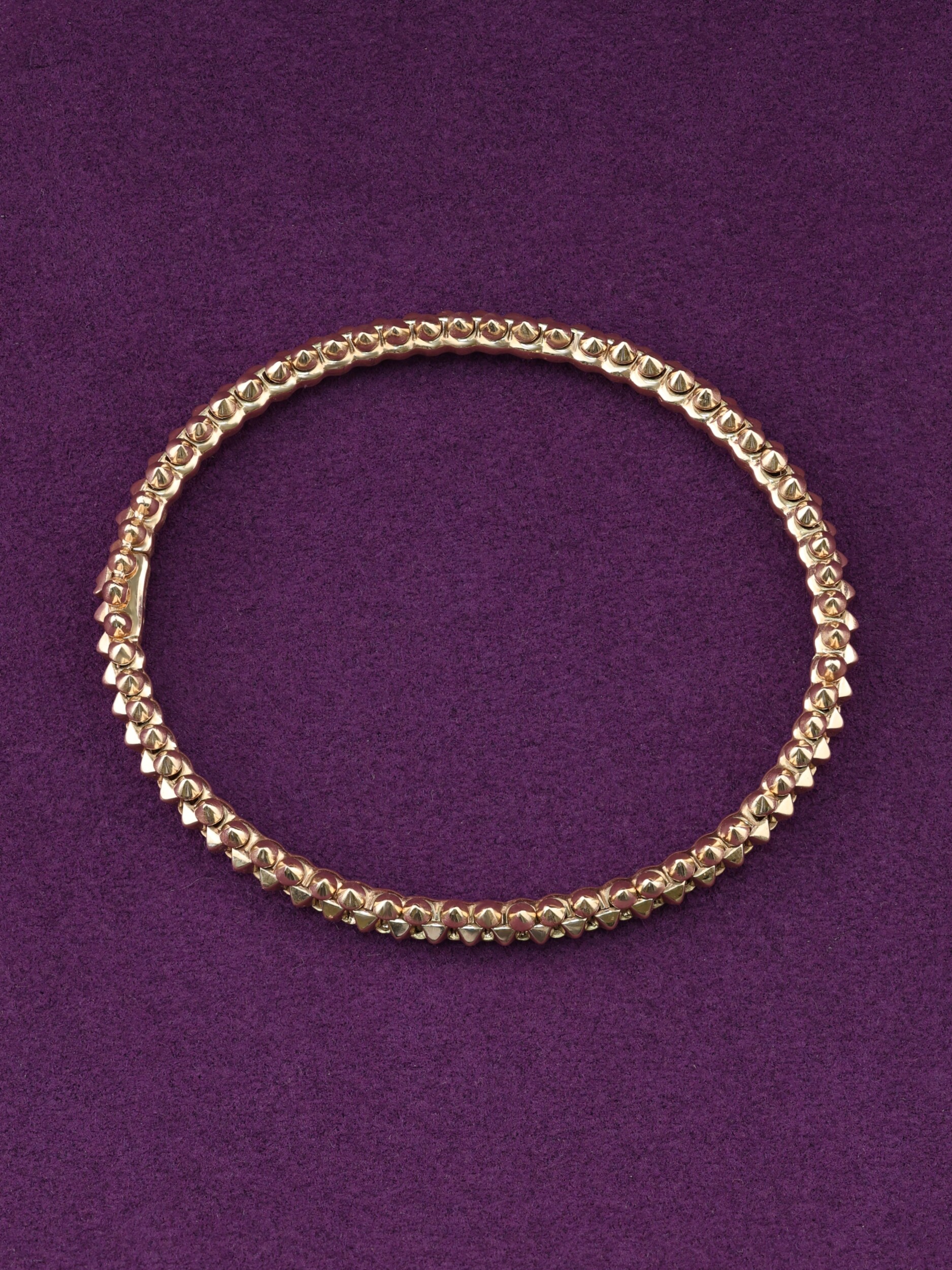 Шипы по всей длине изделия придают ему современный и динамичный характер, превращая классический браслет в статусный предмет гардероба. Розовое золото 585 пробы обеспечивает долговечность и сохранение первозданного блеска при правильном уходе. Этот аксессуар создан для тех, кто не боится акцентов и выбирает ювелирные украшения с характером. Подчеркните свой стиль с помощью этого оригинального браслета, который станет идеальным завершением вашего образа.
