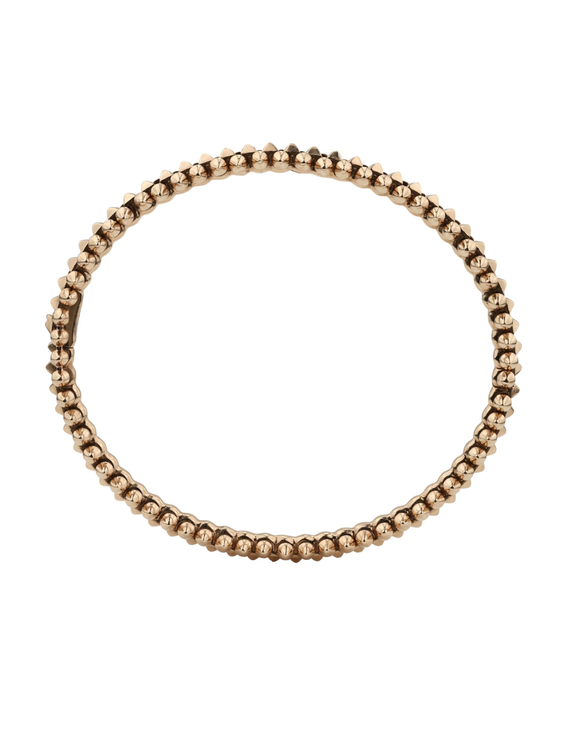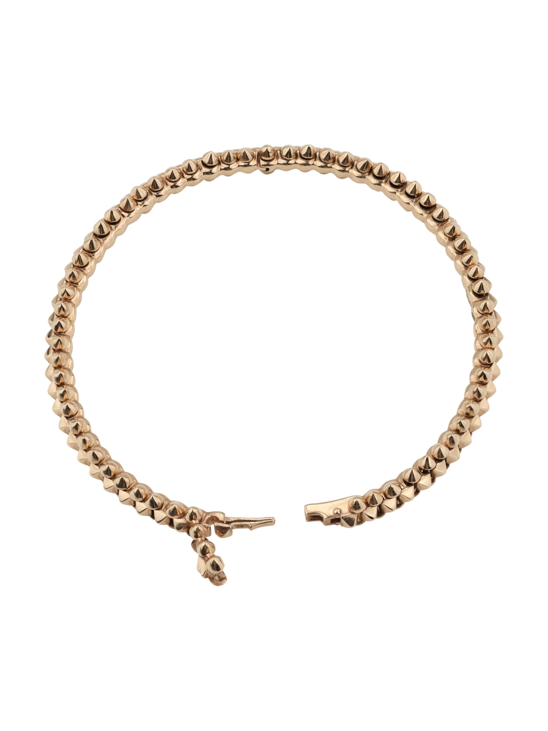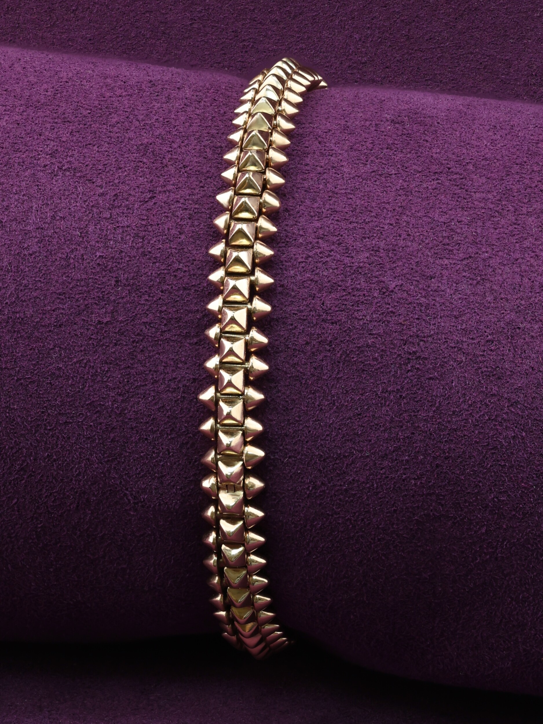Шипы по всей длине изделия придают ему современный и динамичный характер, превращая классический браслет в статусный предмет гардероба. Розовое золото 585 пробы обеспечивает долговечность и сохранение первозданного блеска при правильном уходе. Этот аксессуар создан для тех, кто не боится акцентов и выбирает ювелирные украшения с характером. Подчеркните свой стиль с помощью этого оригинального браслета, который станет идеальным завершением вашего образа.
