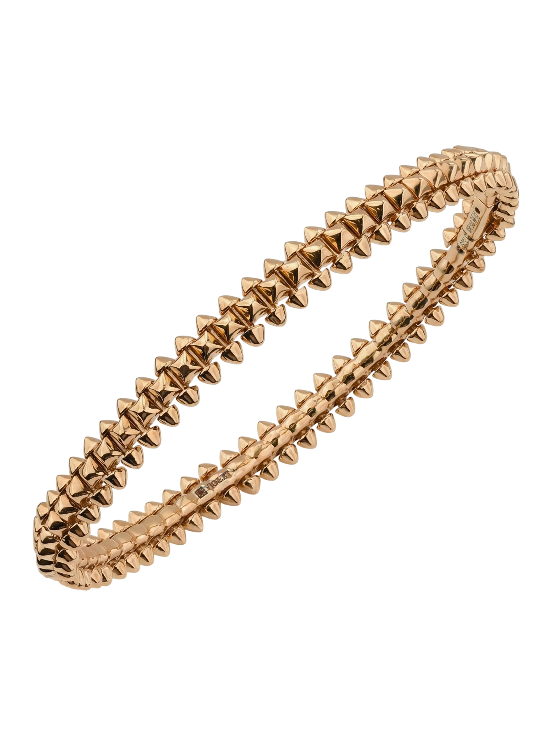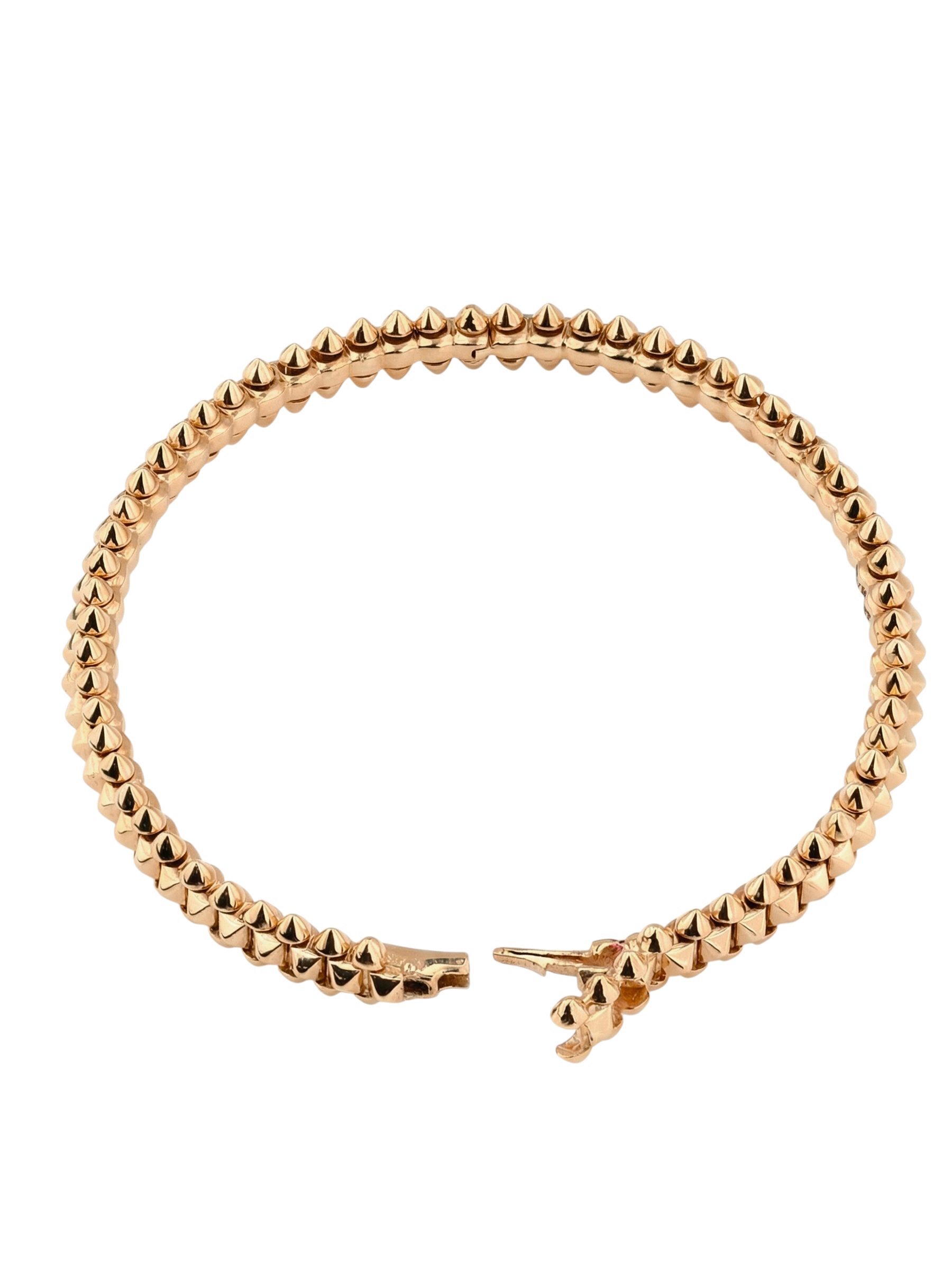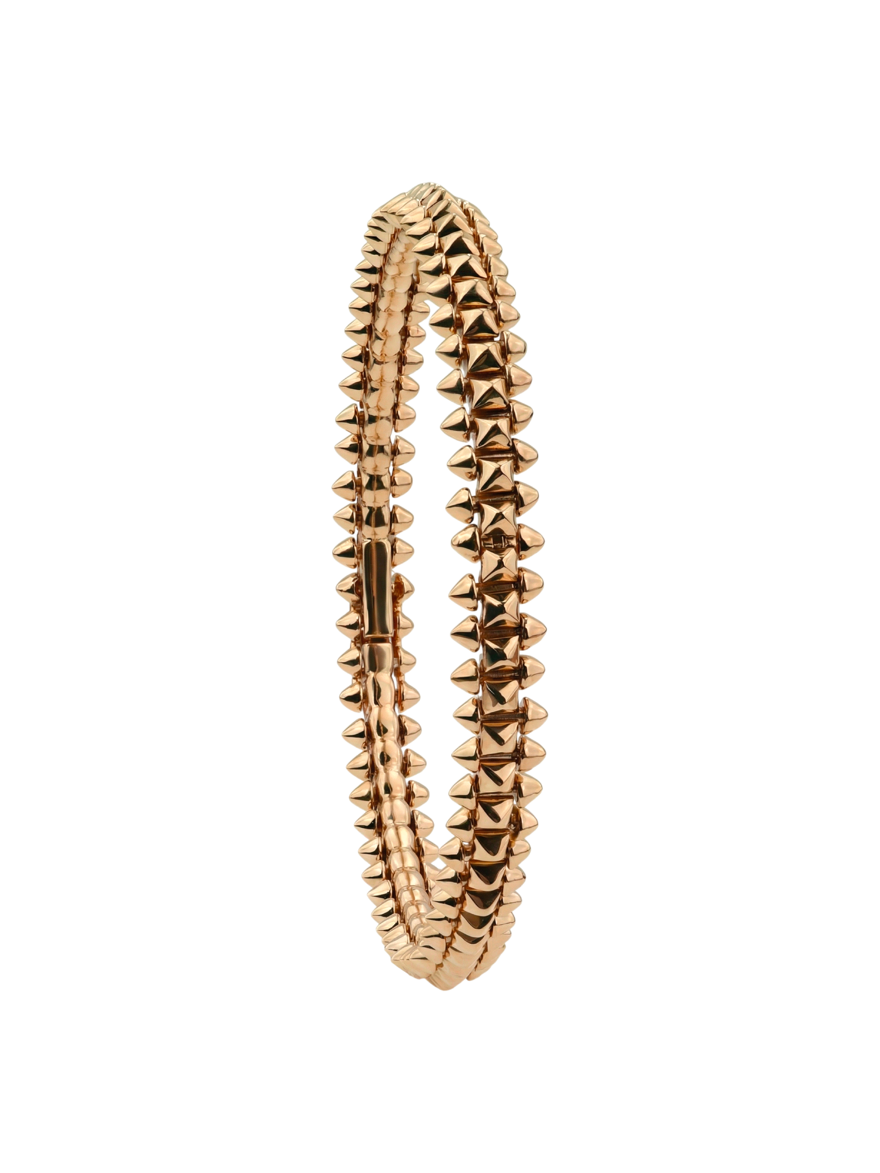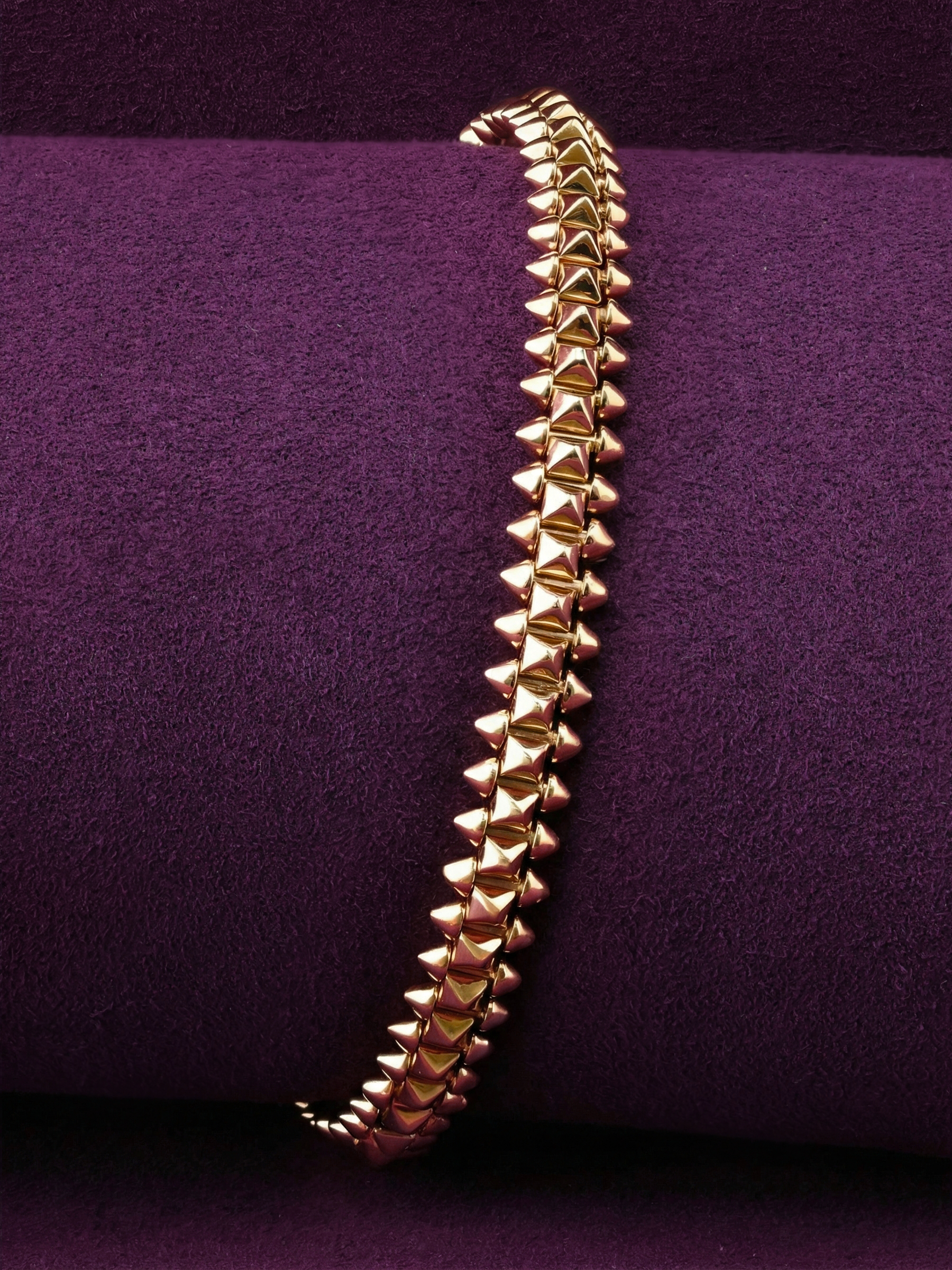 Эффектный золотой браслет — это воплощение смелости и яркого стиля. Украшение выполнено из красного золота 585 пробы, которое придает изделию благородный и теплый оттенок. Дизайнерская концепция построена на выразительных элементах: поверхность браслета декорирована острыми шипами, создающими дерзкий и узнаваемый облик. Этот аксессуар станет центральным акцентом вашего образа, подчеркивая уверенность в себе и безупречный вкус.