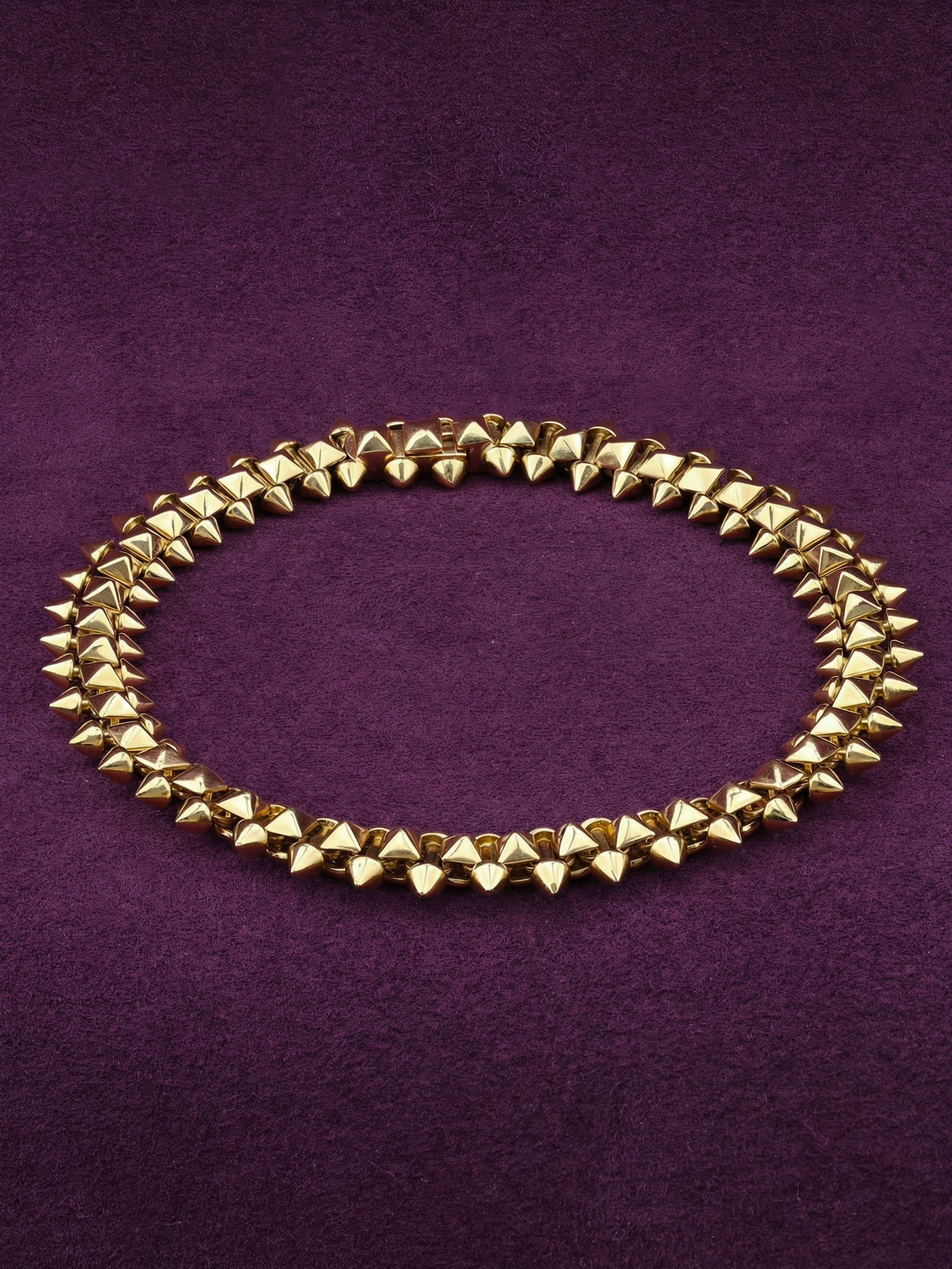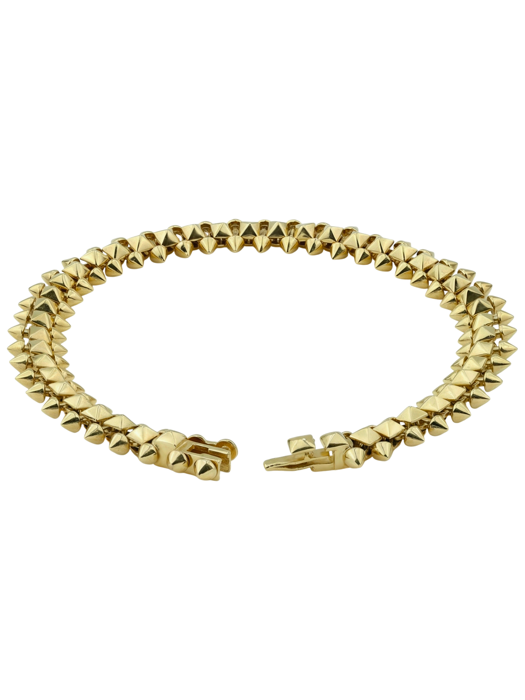 Этот роскошный браслет из лимонного золота 585 пробы станет центральным акцентом вашего образа. Дизайн изделия, вдохновленный эстетикой коллекции De Luxe — Дерзость, отличается смелым и выразительным исполнением. Каждое звено украшения выполнено в виде объемных шипов, которые создают неповторимую игру света на благородном металле. Лимонный оттенок золота придает аксессуару особую элегантность и современный вид, выделяя его среди классических моделей.