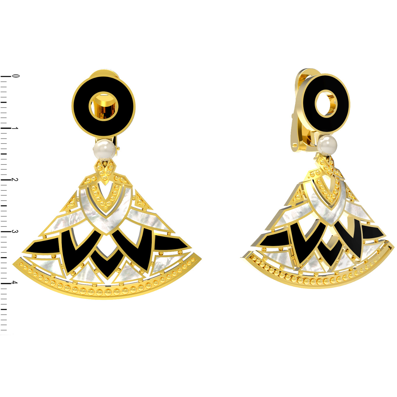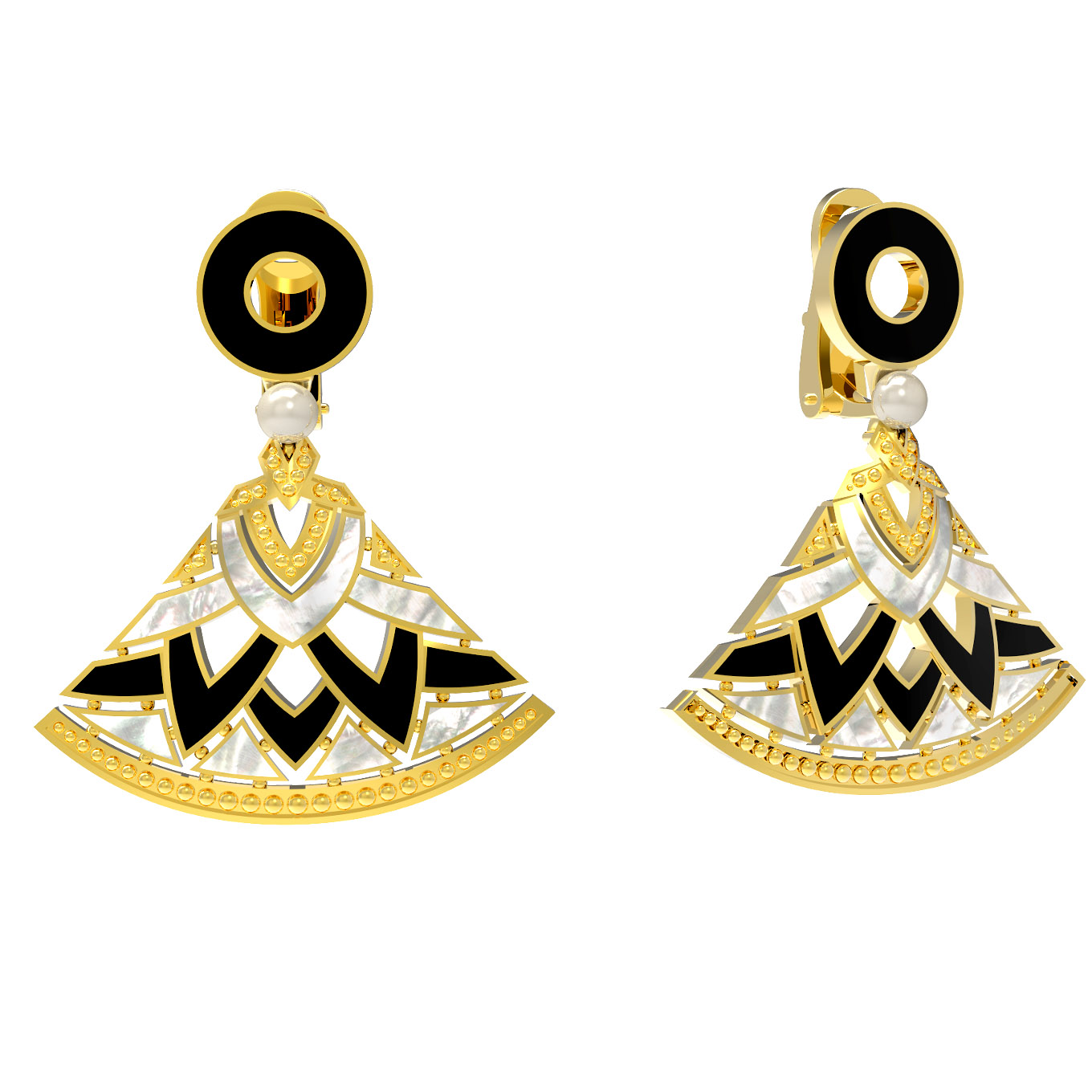 В центре композиции — искусное сочетание 14 вставок, создающих контрастный и выразительный облик. Глубокий черный оникс гармонично переплетается с нежным перламутром, создавая элегантную игру света и тени. Дополняет эту роскошную палитру жемчуг, чье мягкое сияние добавляет украшению нотку аристократизма. Плоские вставки идеально интегрированы в конструкцию, создавая ровную, гладкую поверхность.