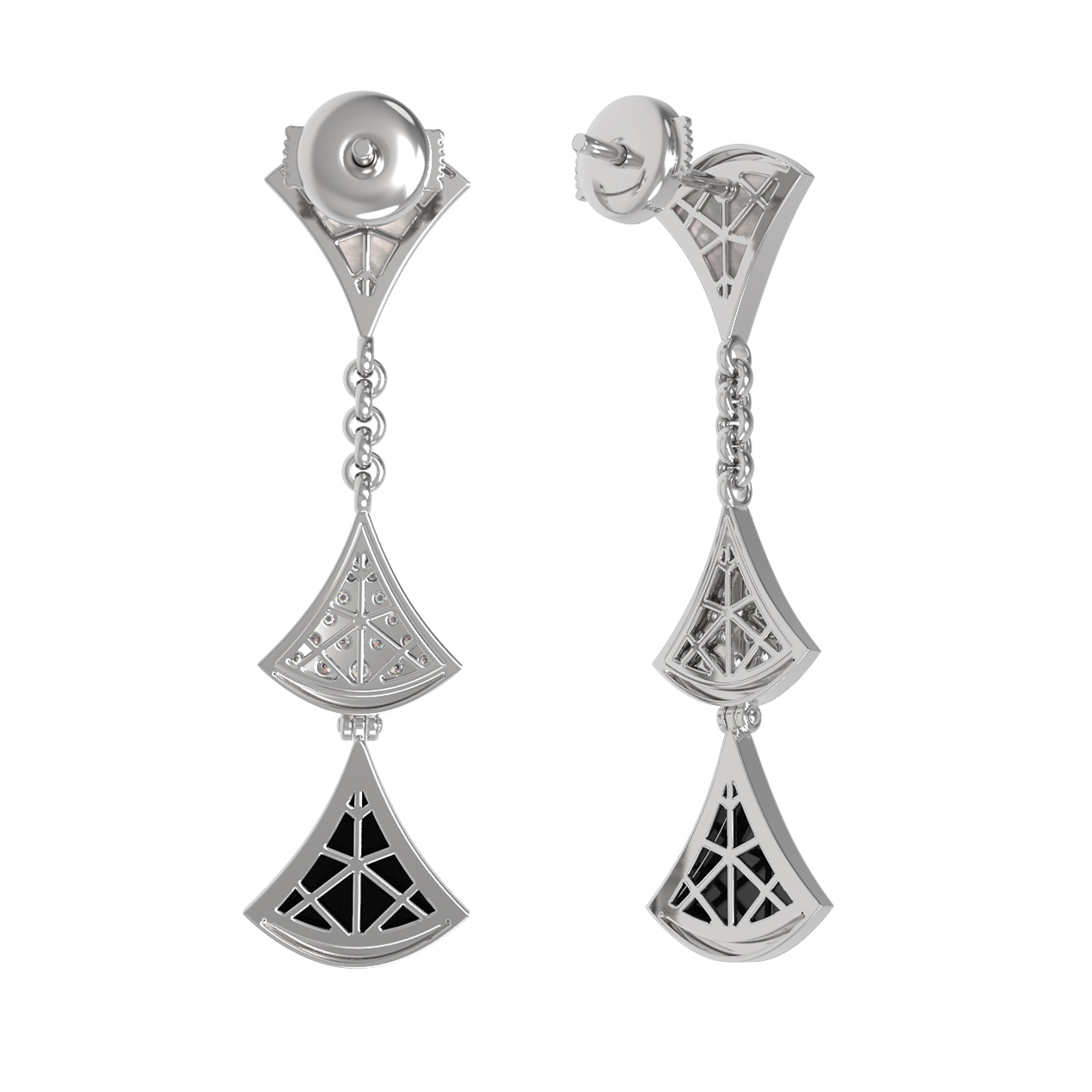Элегантные серьги из белого золота 585 пробы из коллекции De Luxe — Веер станут безупречным акцентом вашего образа. Дизайн украшения, вдохновленный формой веера, воплощает гармонию геометрии и роскоши. В ювелирном изделии искусно сочетаются контрастные вставки: таинственный черный оникс и нежный перламутр дополнены сиянием 36 вставок круглой формы. Белый цвет благородного металла гармонично подчеркивает глубину черных и перламутровых оттенков, создавая выразительный и притягательный визуальный эффект.