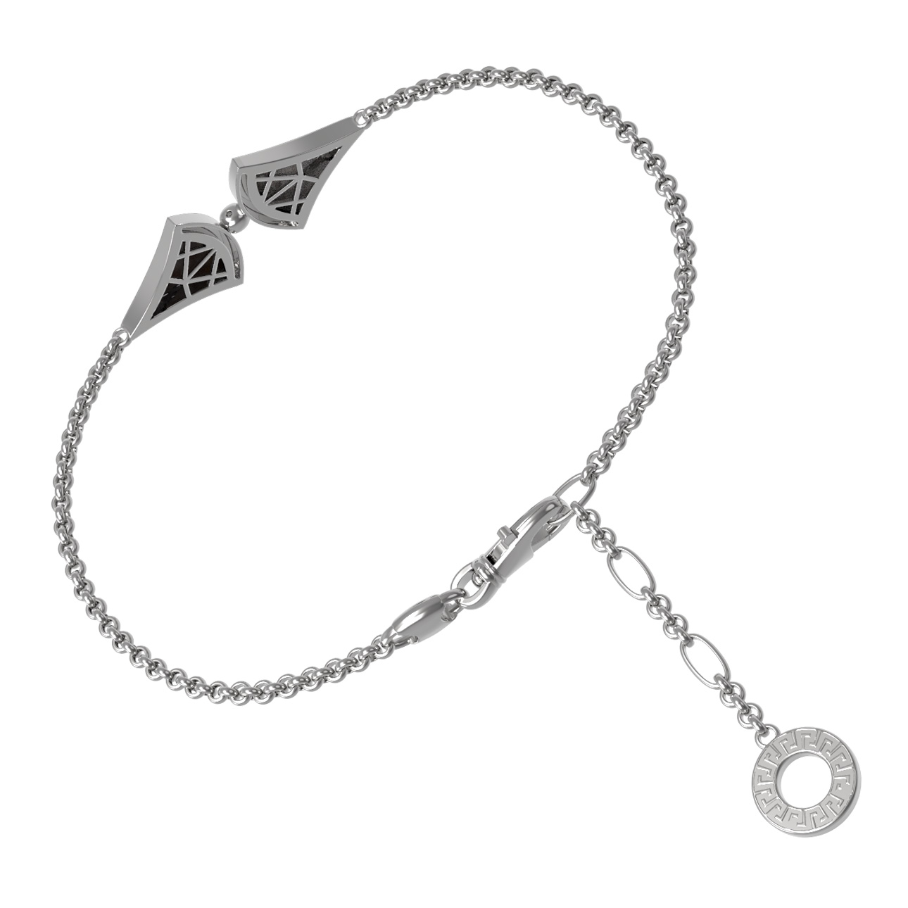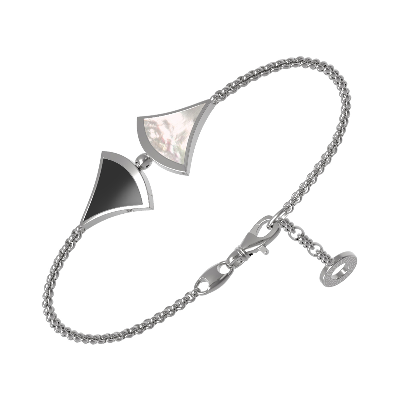 Центральным элементом композиции выступают вставки: глубокий черный оникс и нежный перламутр с его неповторимым переливом. Такое сочетание цветов вставок — черный и перламутровый — гармонично объединено в одном изысканном изделии. Качественное белое золото подчеркивает холодный блеск и чистоту линий, создавая эффектный акцент на запястье.