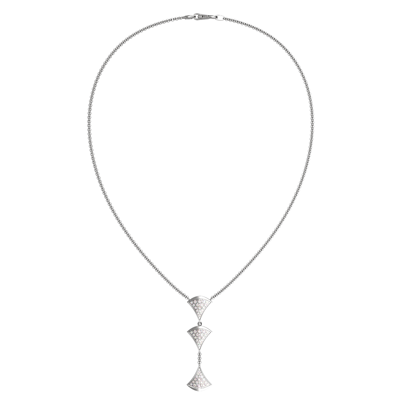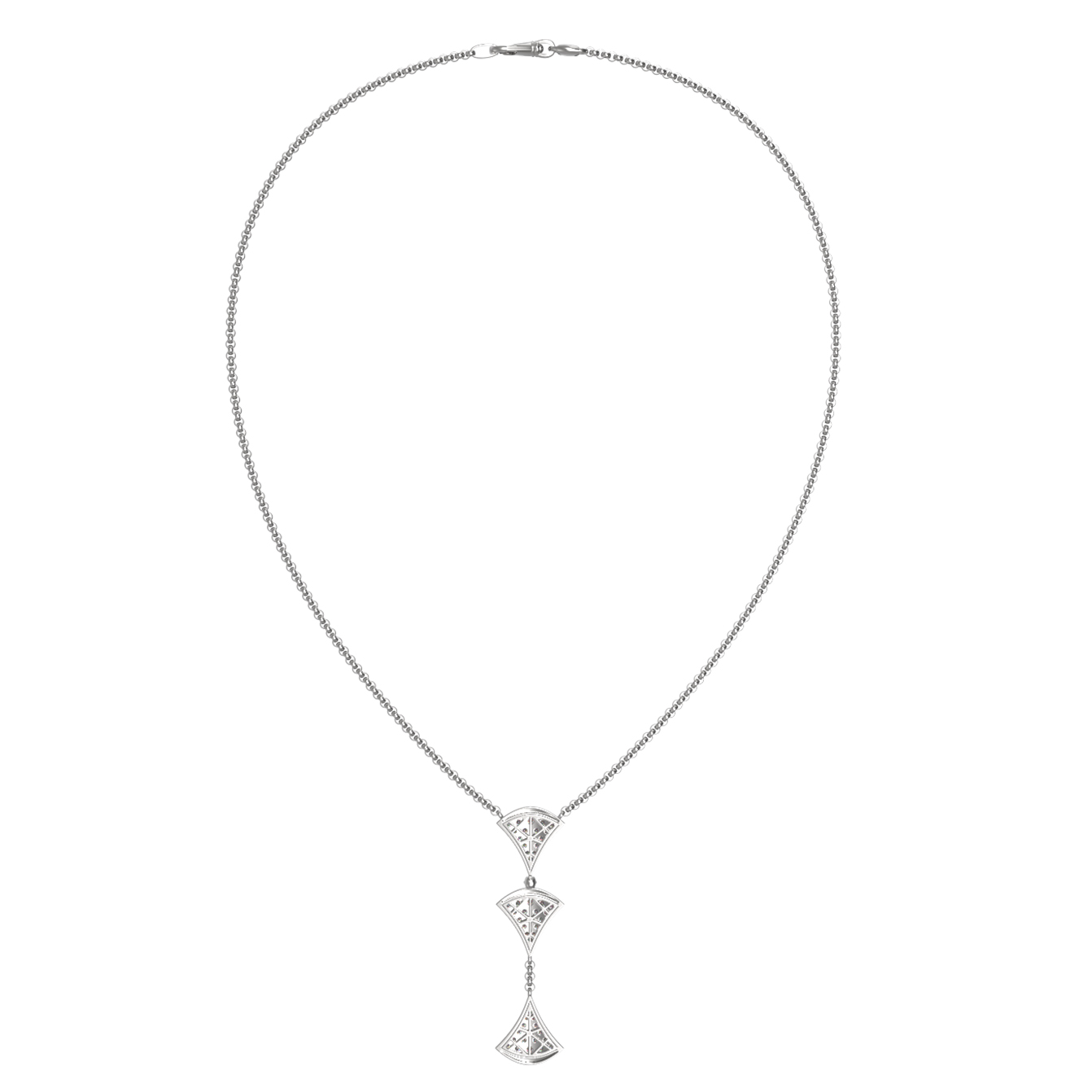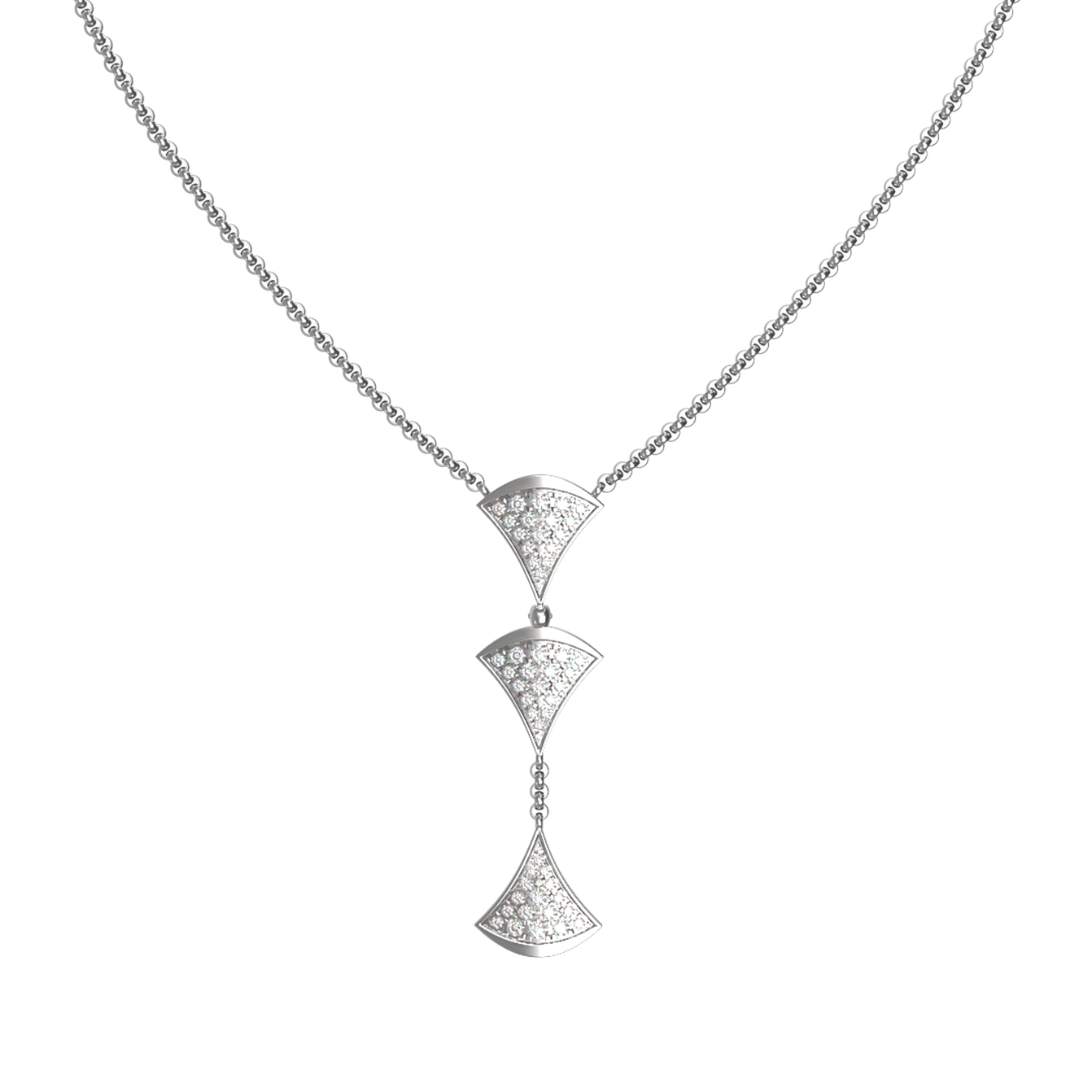 Представляем утонченное колье из белого золота 585 пробы, которое станет изысканным акцентом вашего образа. Дизайн украшения выполнен в элегантной стилистике веер, где геометрические линии гармонично сочетаются с классической роскошью. Центральным элементом композиции являются три подвижных подвесных элемента, каждый из которых инкрустирован белыми бриллиантами круглой огранки. Общее количество вставок составляет 102 бриллианта, создающих невероятное сияние и игру света при каждом движении.