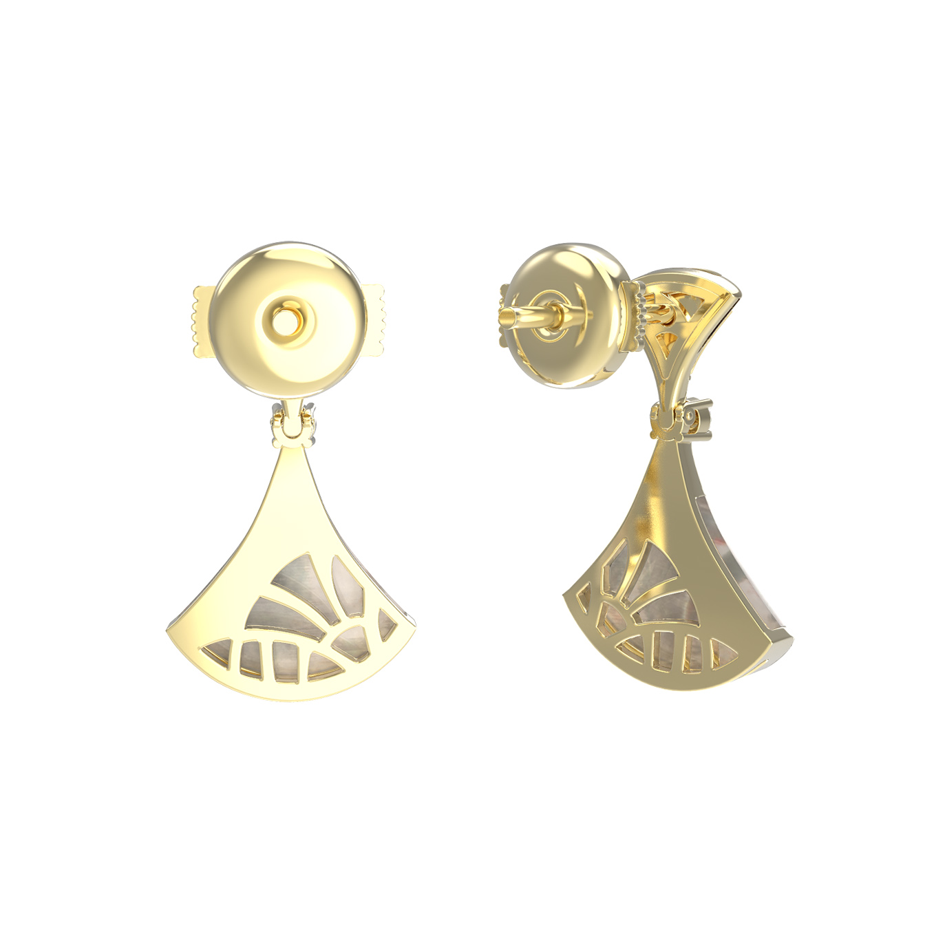 Центральным элементом композиции выступают два сияющих бриллианта круглой формы, расположенные над изящными вставками из перламутра. Белый блеск драгоценных камней эффектно контрастирует с нежным переливом перламутра, создавая завораживающую игру света при каждом вашем движении. Геометрически выверенные линии веера придают изделию современный и одновременно классический вид.