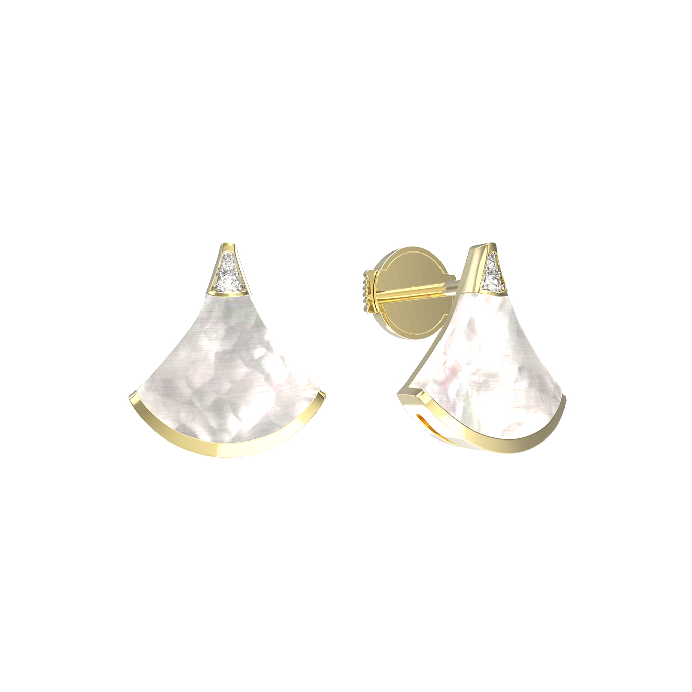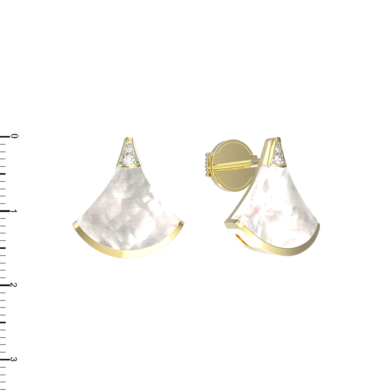 Центральным элементом композиции является нежный перламутр, мягко переливающийся под лучами света, создавая эффект внутреннего сияния. Вставки перламутра дополнены яркими бриллиантами круглой формы, которые добавляют ювелирному изделию роскошный блеск и глубину. В общей сложности модель украшают 4 вставки: перламутр и сверкающие белые бриллианты, акцентирующие внимание на безупречном исполнении каждой детали.