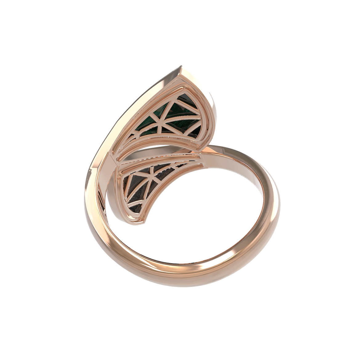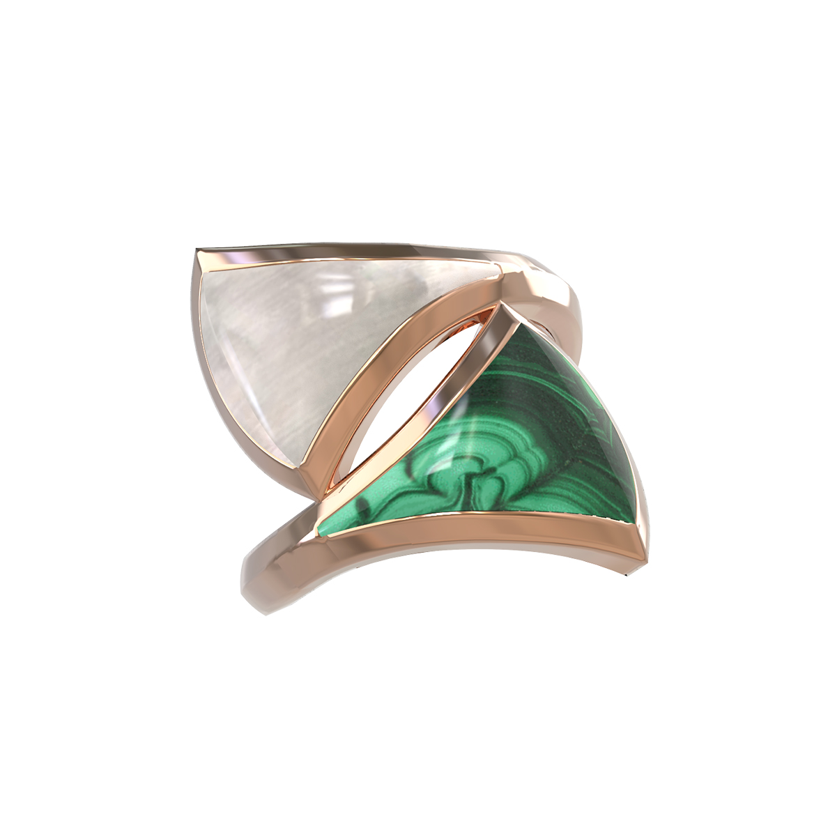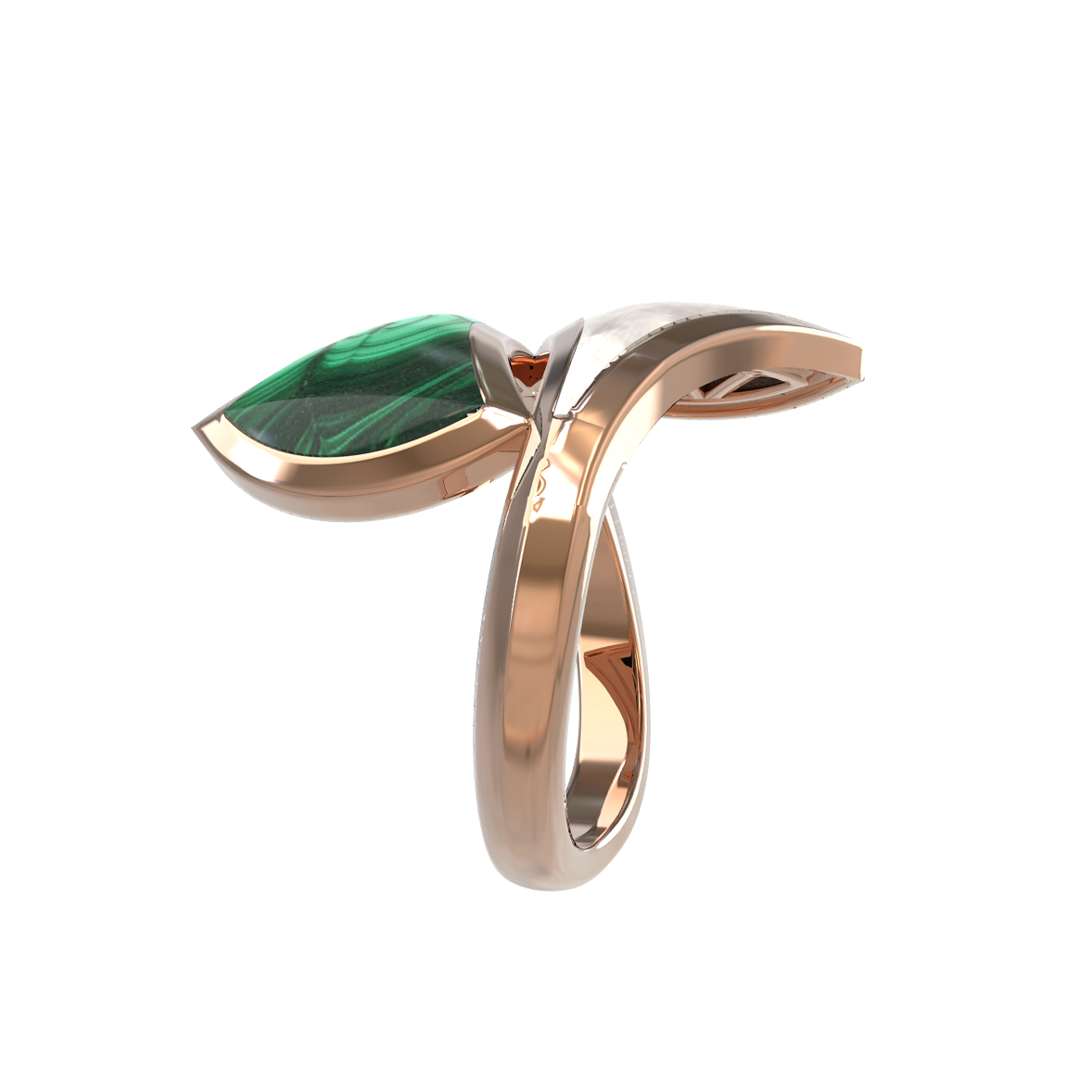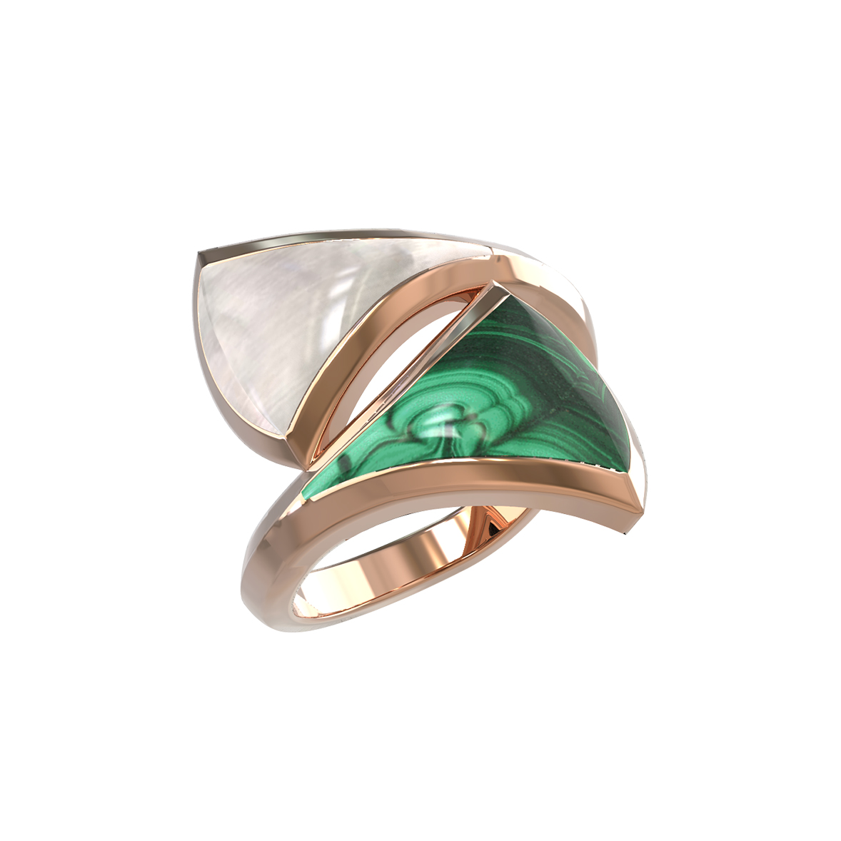 Откройте для себя воплощение ювелирного искусства в этом изысканном кольце из красного золота 585 пробы. Украшение входит в коллекцию De Luxe — Веер, созданную для тех, кто ценит уникальные дизайнерские решения и безупречное качество исполнения. Особое внимание привлекает сложная архитектура изделия, выполненная в стиле веер, которая гармонично сочетает в себе классику и современные тренды. Центральным элементом композиции стали контрастные вставки: выразительный зеленый малахит с его природным узором и нежный перламутр, создающий благородное сияние.