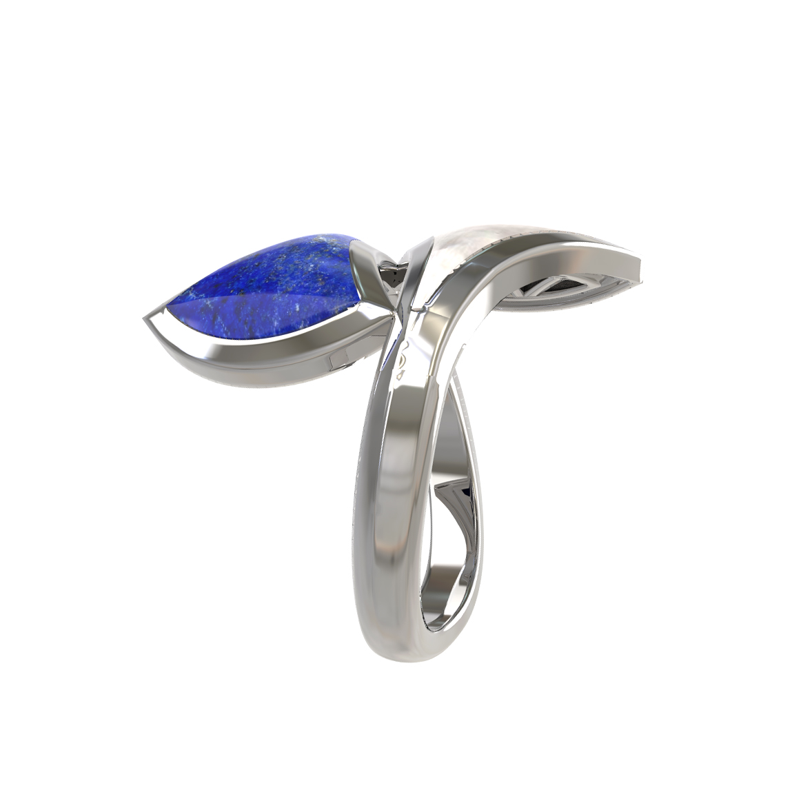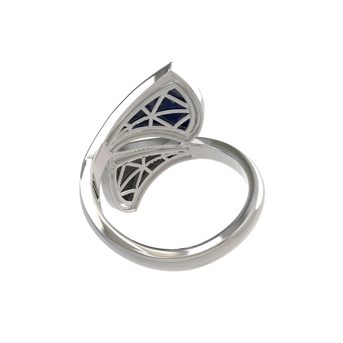 Элегантное кольцо из белого золота 585 пробы станет центральным акцентом вашего образа, привлекая внимание необычной формой и контрастным сочетанием материалов. Дизайн изделия вдохновлен грациозным силуэтом веера, что придает украшению особую динамику и изысканность. Мастера ювелирного дела объединили в одной композиции благородный холодный блеск драгоценного металла с глубиной синего лазурита и нежным сиянием перламутра. Комбинация этих двух вставок создает уникальную игру света и текстур, делая аксессуар по-настоящему запоминающимся.