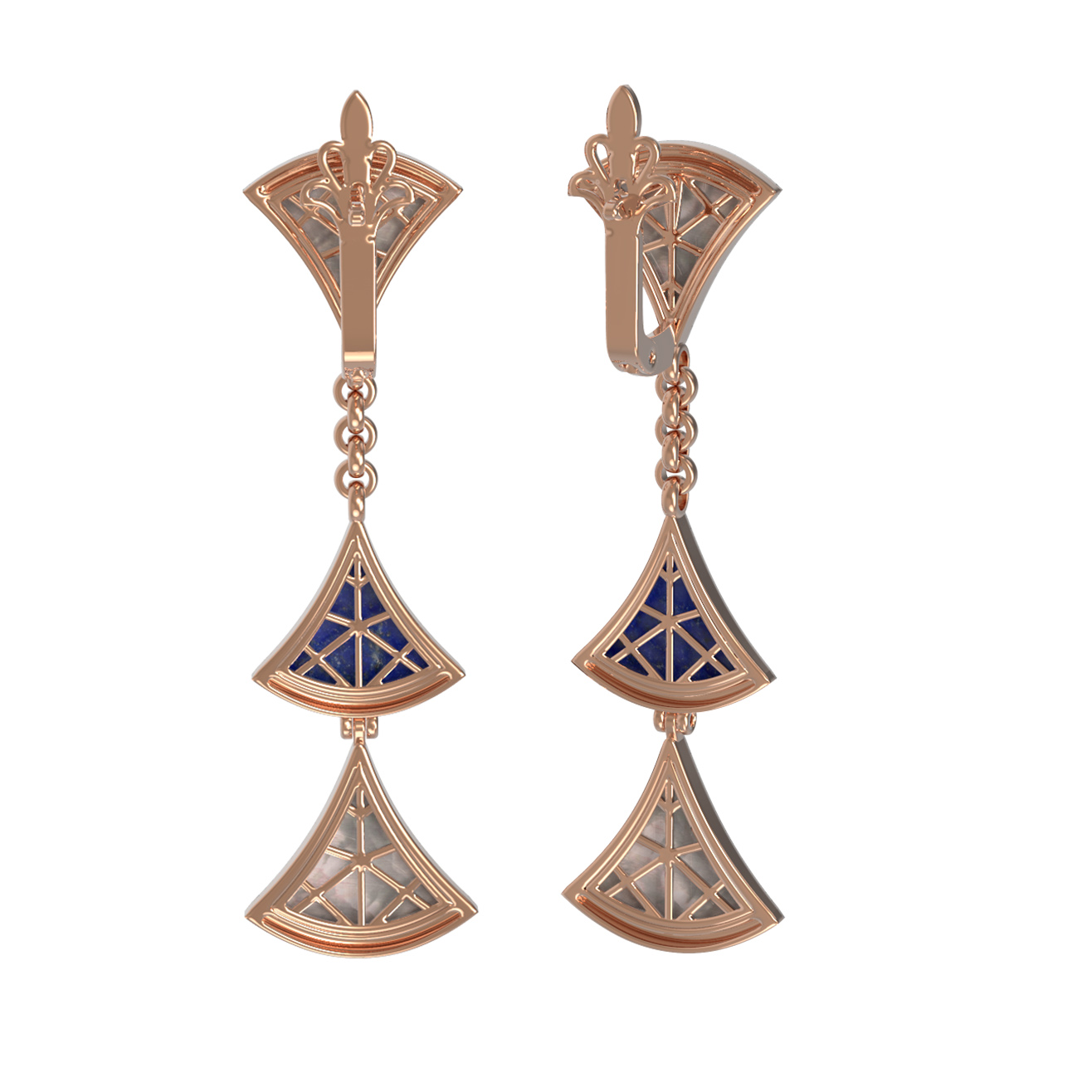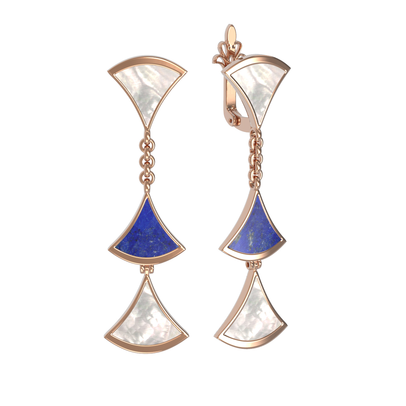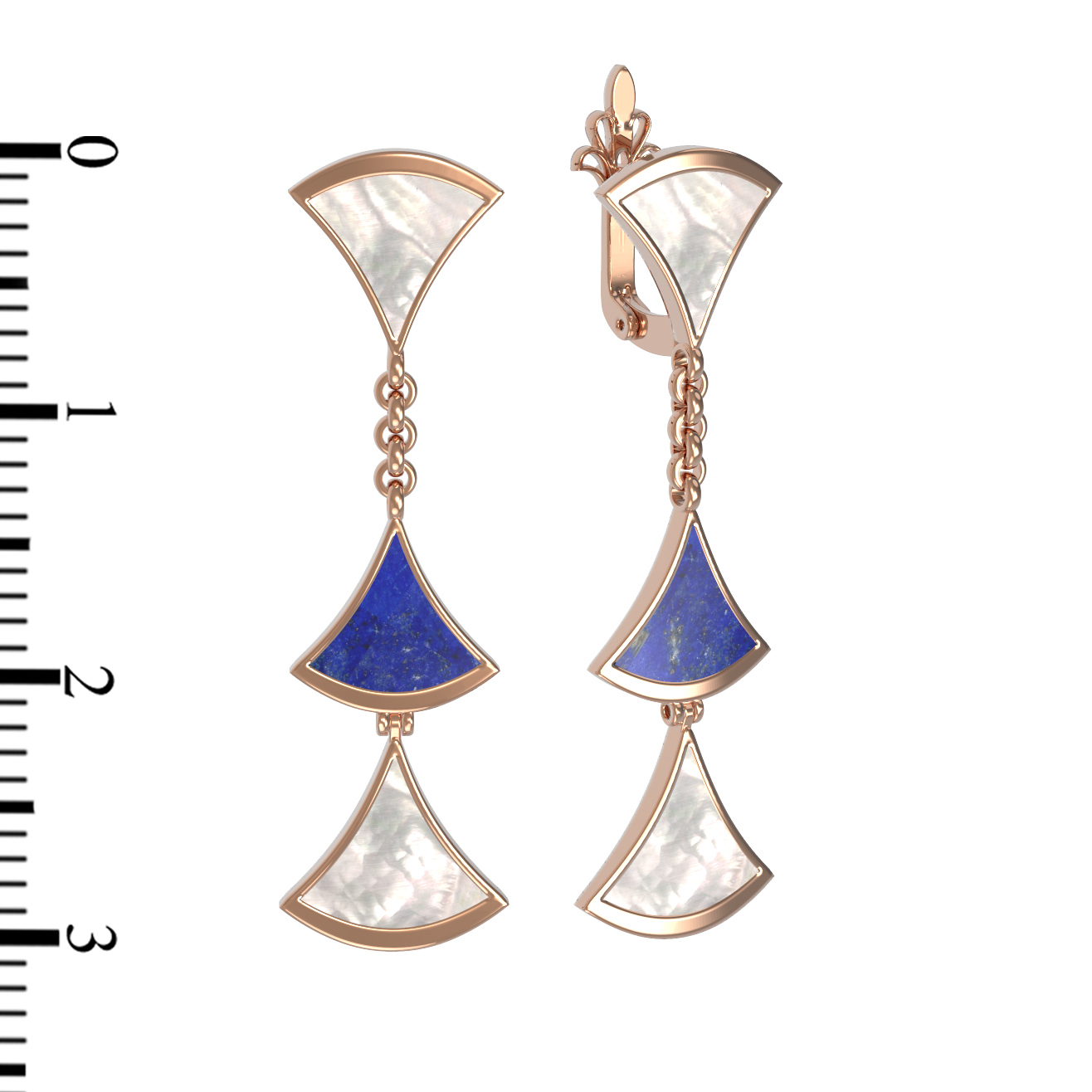 Серьги из коллекции De Luxe — Веер инкрустированы двумя вставками — насыщенным синим лазуритом и нежным, переливающимся перламутром. Контраст глубокого синего оттенка камня и мягкого сияния перламутровых вставок создает уникальную игру света, притягивающую восхищенные взгляды. Благодаря продуманному конструктиву, элементы подвижно соединены между собой, что придает украшению легкость и динамику при каждом вашем движении.