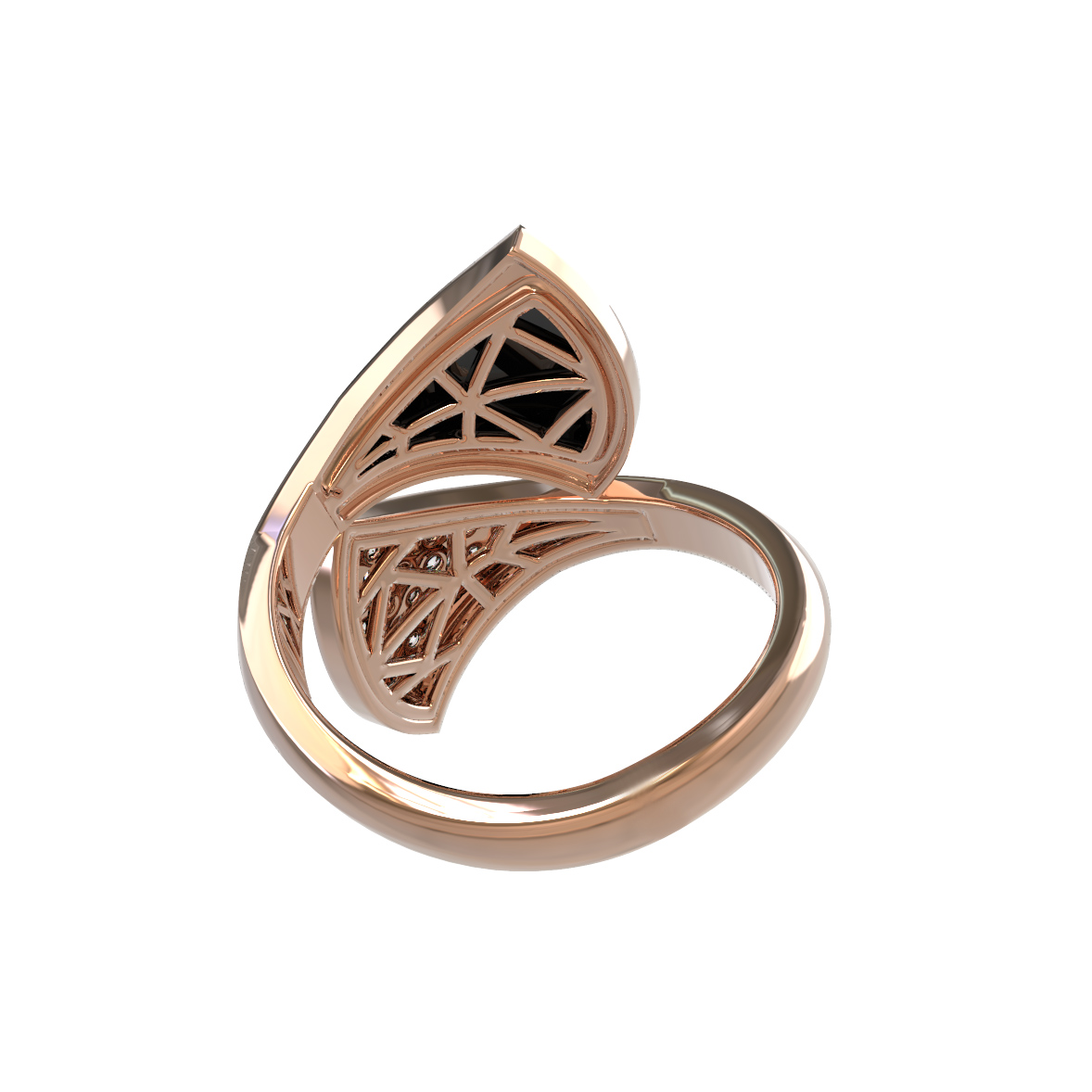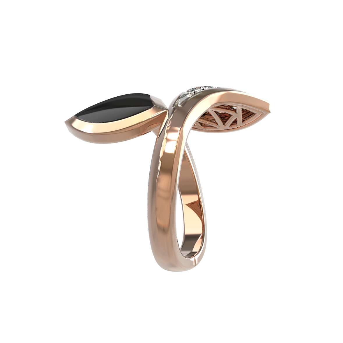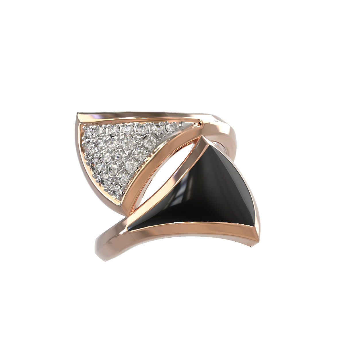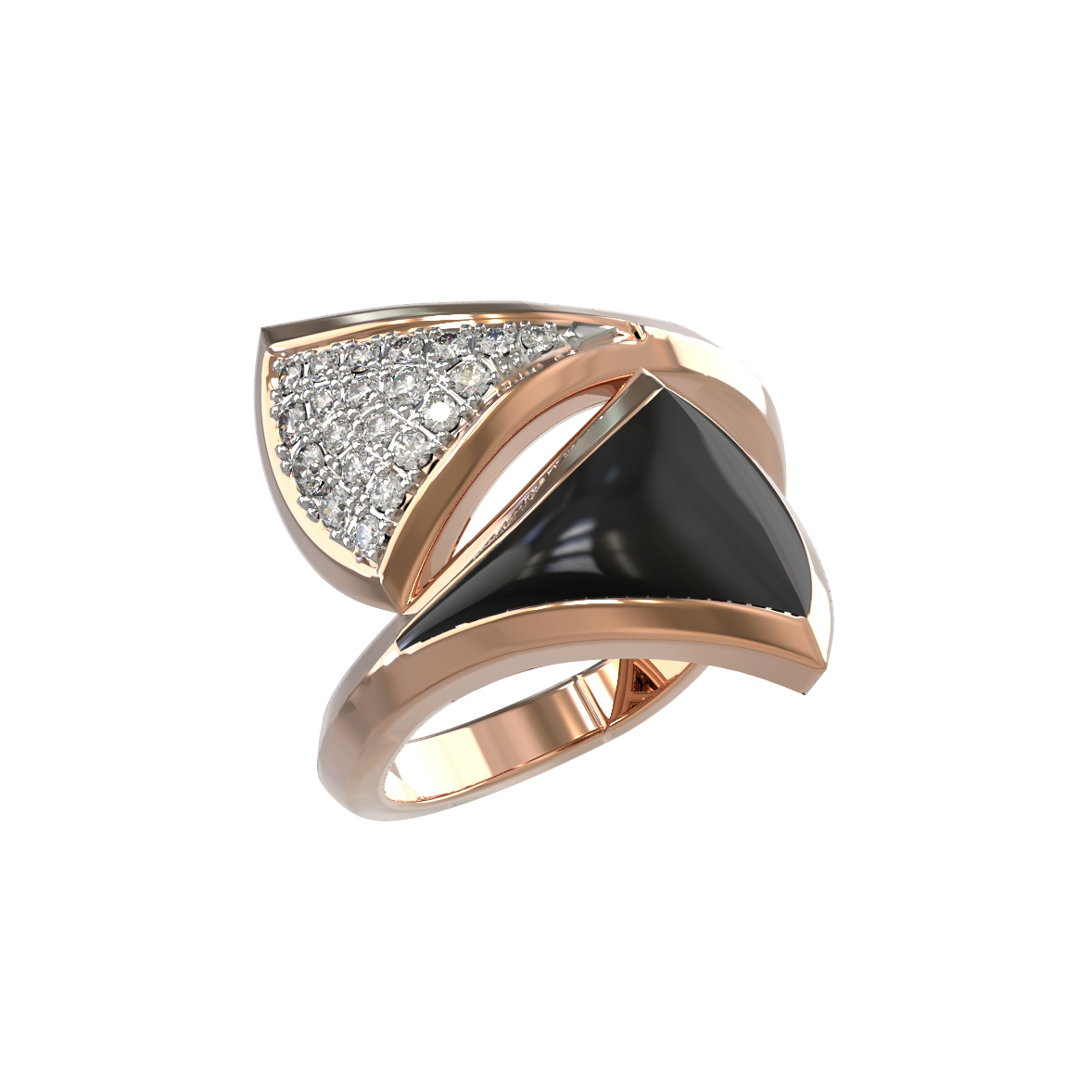 Элегантное кольцо из красного золота 585 пробы — истинное воплощение утонченного стиля. Данное украшение из коллекции De Luxe — Веер привлекает внимание своим необычным геометрическим дизайном в форме веера, который придает образу динамичность и статусность. Основной акцент в композиции сделан на контрастном сочетании драгоценных вставок: глубина черного оникса гармонично уравновешивается блеском белых бриллиантов.